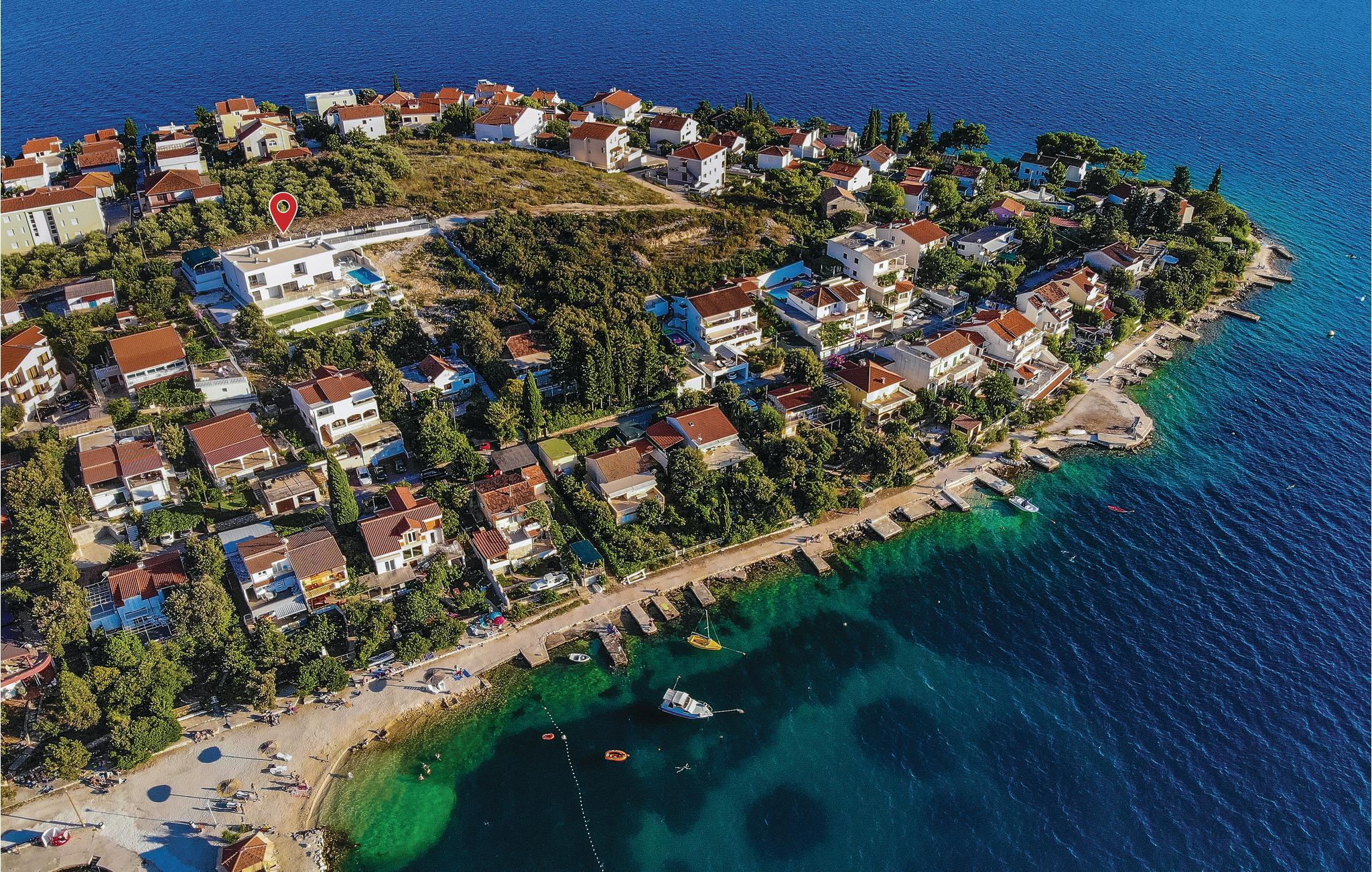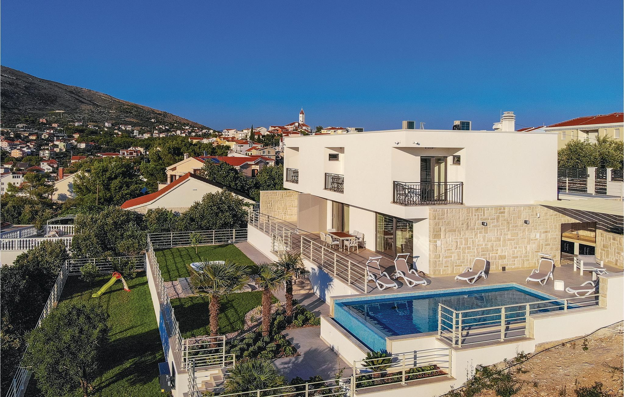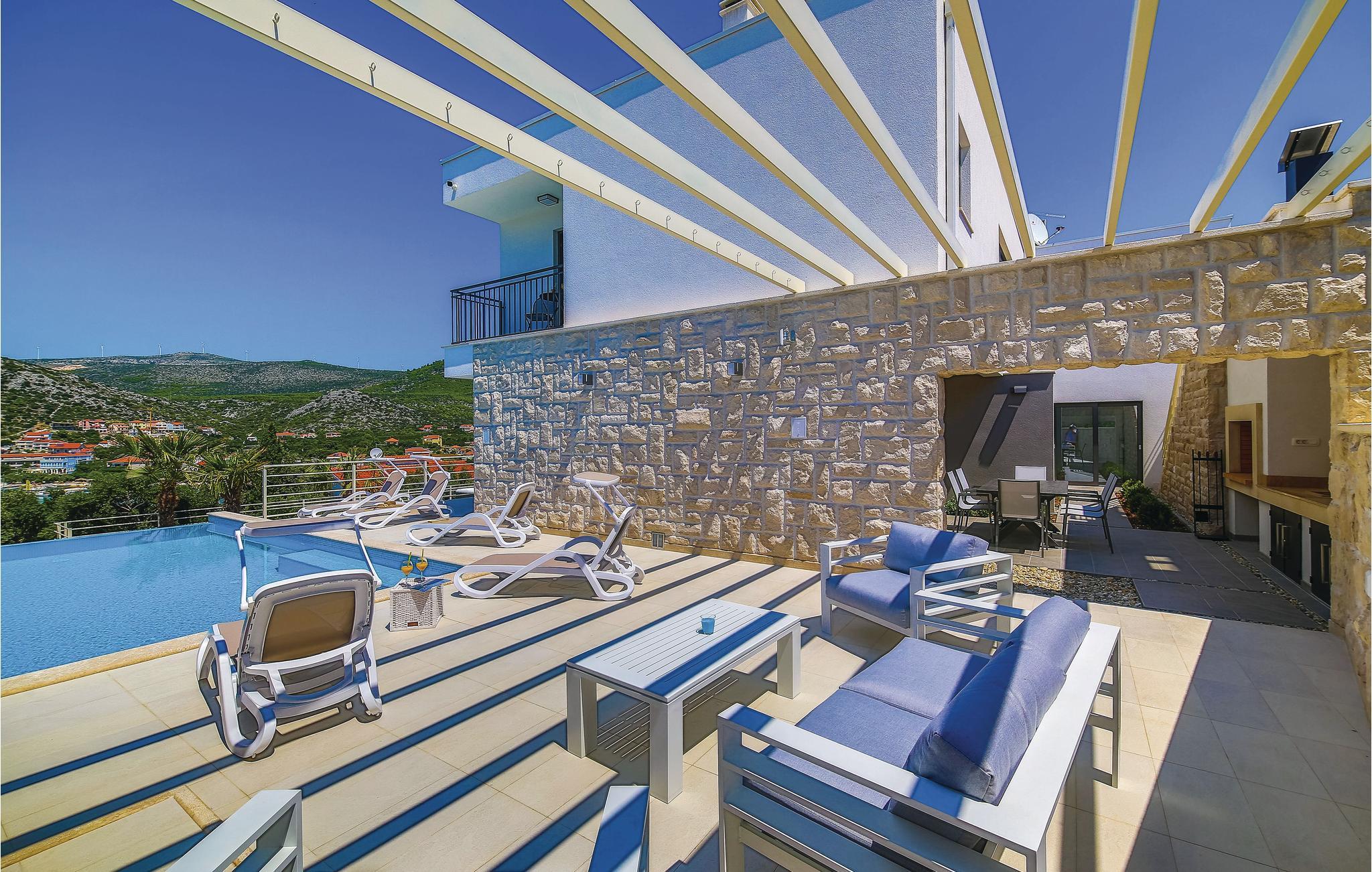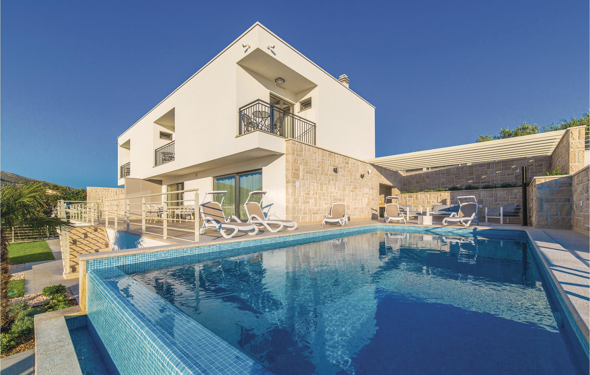 Denne drømmedejlige ferievilla med pool, ligger i den lille by Trget Vranjica og har alt hvad der skal til for at gøre jeres ferie til en uforglemmelig oplevelse. Den skønne indretning er behagelig og komfortable. Slap af i saunaen og jacuzzien og i fitnessrummet kan I komme i form ligesom den opvarmede pool indbyder til vandsjov uanset tid på dagen. Kør en tur til den nærliggende strand og nyd de lune dage ved Adriaterhavet. Gå gennem Trogirs smukke gader kik på kunstværker fra gotikken, renæssancen, barokken og romertiden. Af husets fire parkeringspladser er to overdækkede, en er i en garage.