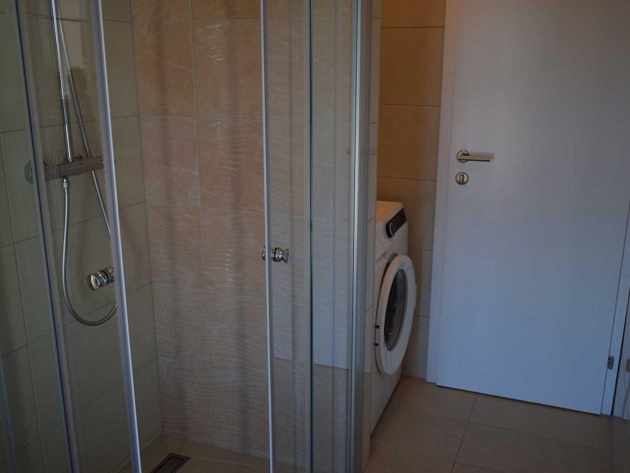 Bathroom 1: shower, WC, sink, towels, toiletries, washing machine