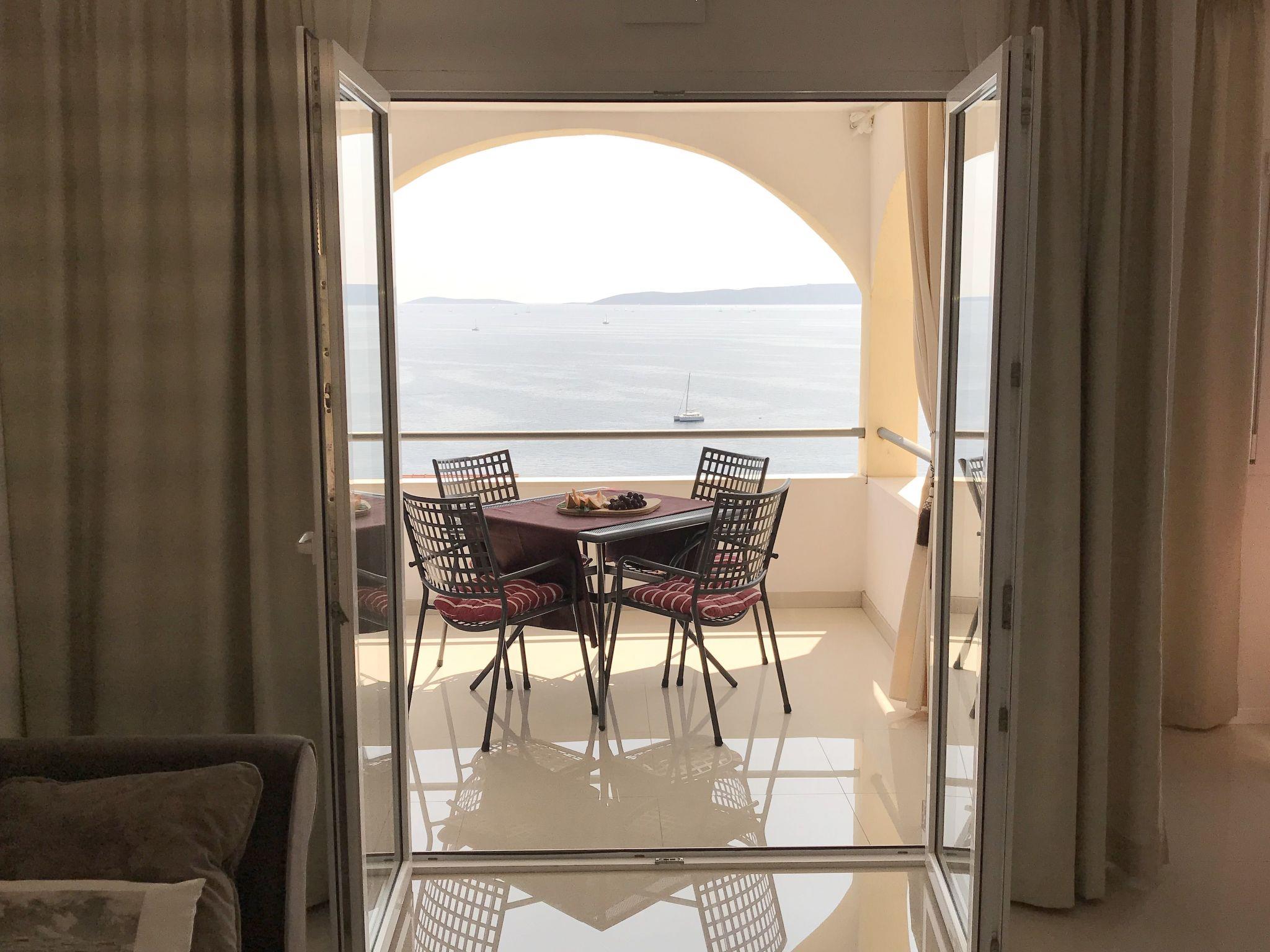 The dining area gives access to the sun terrace with a dining table and chairs. Enjoy your breakfast under the sunset or eat your dinner under the starlit skies while taking in the panoramic views across the bay.