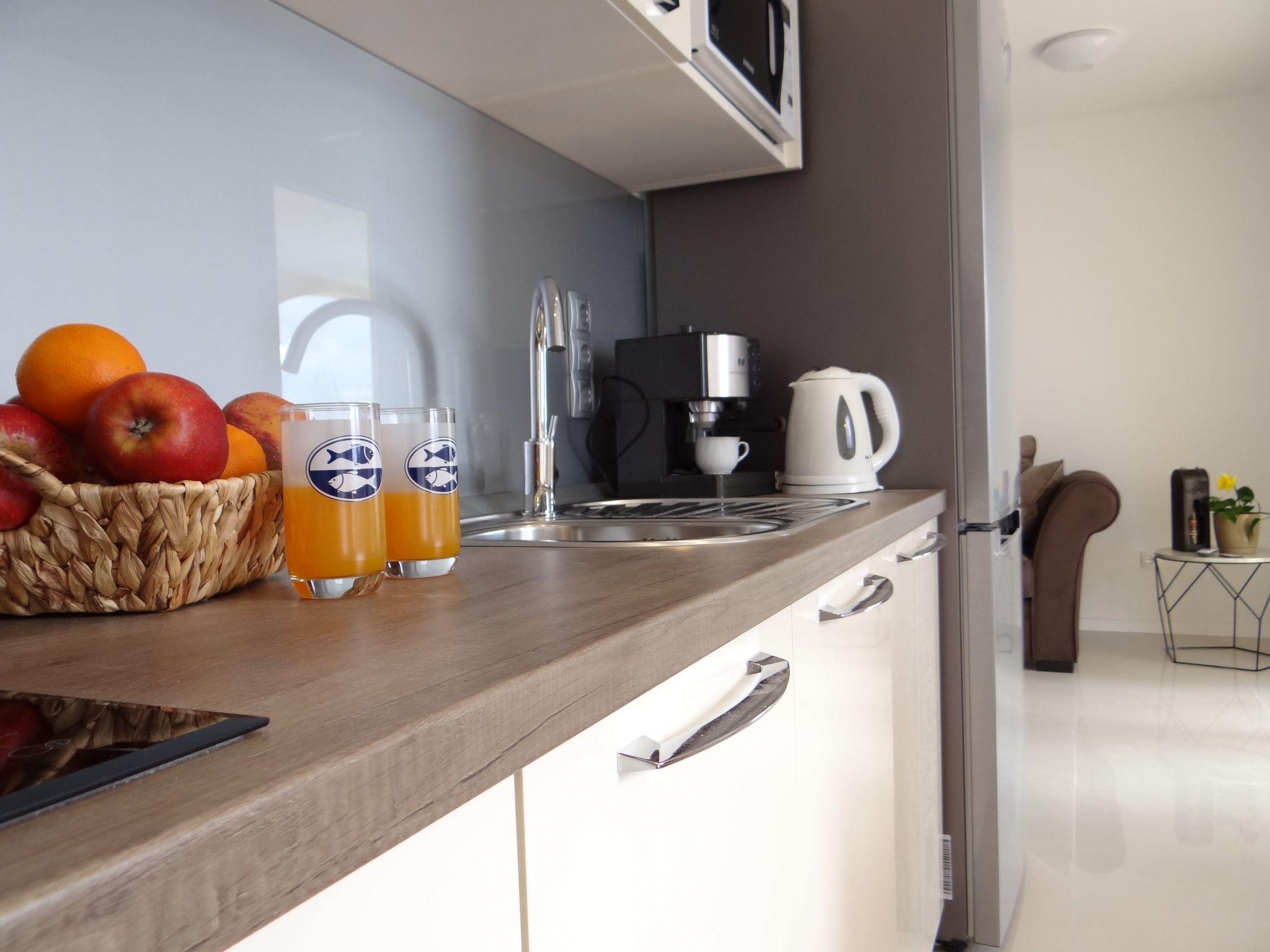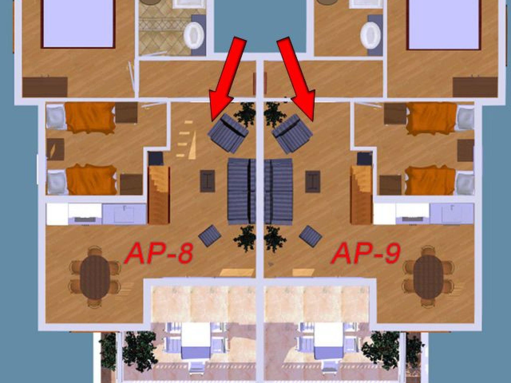 This 55m² holiday apartment is on the top floor of the building and features a living-/dining area with integrated fully fitted kitchen, two bedrooms and a bathroom. The air conditioned living room is furnished with a sofa and a satellite television. The dining area offers a large wooden table with matching chairs. Next to the dining area is the kitchen complete with a cooker, oven, fridge, freezer compartment and electric kettle. One of the two bedrooms is equipped with a 160 cm x 200 cm double, the other bedroom has two 90 cm x 190 cm single beds which you can push together to make a double bed. The bathroom is equipped with a shower, wash basin and toilet. Reliable 5G WLAN access is offered free of charge. Private shaded dedicated parking lot, swiming pool open from 20.04. to 15.10.