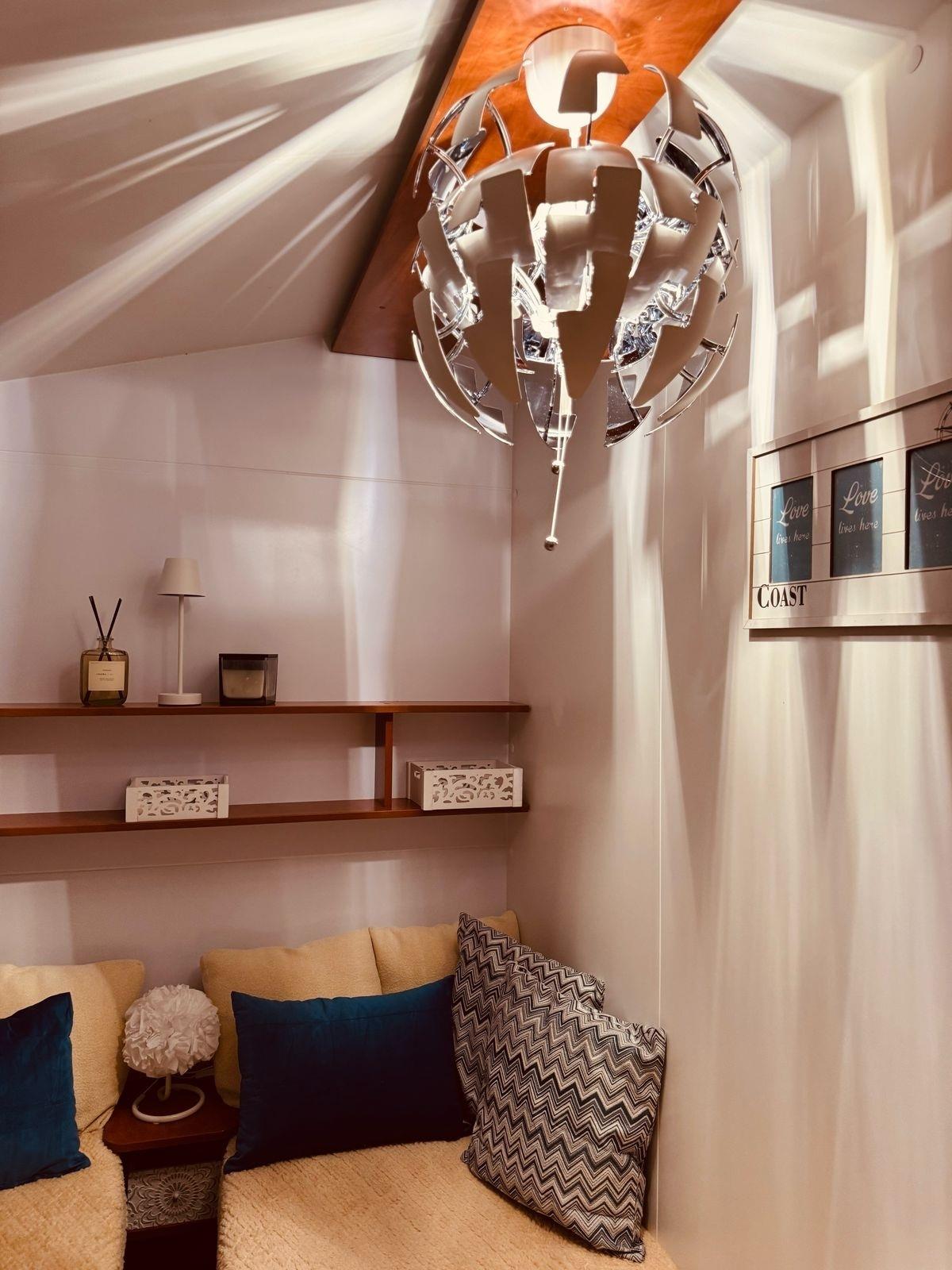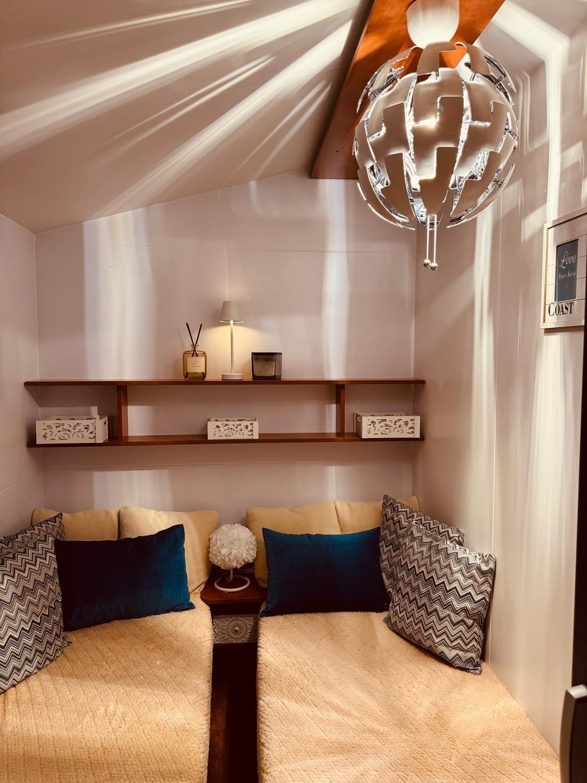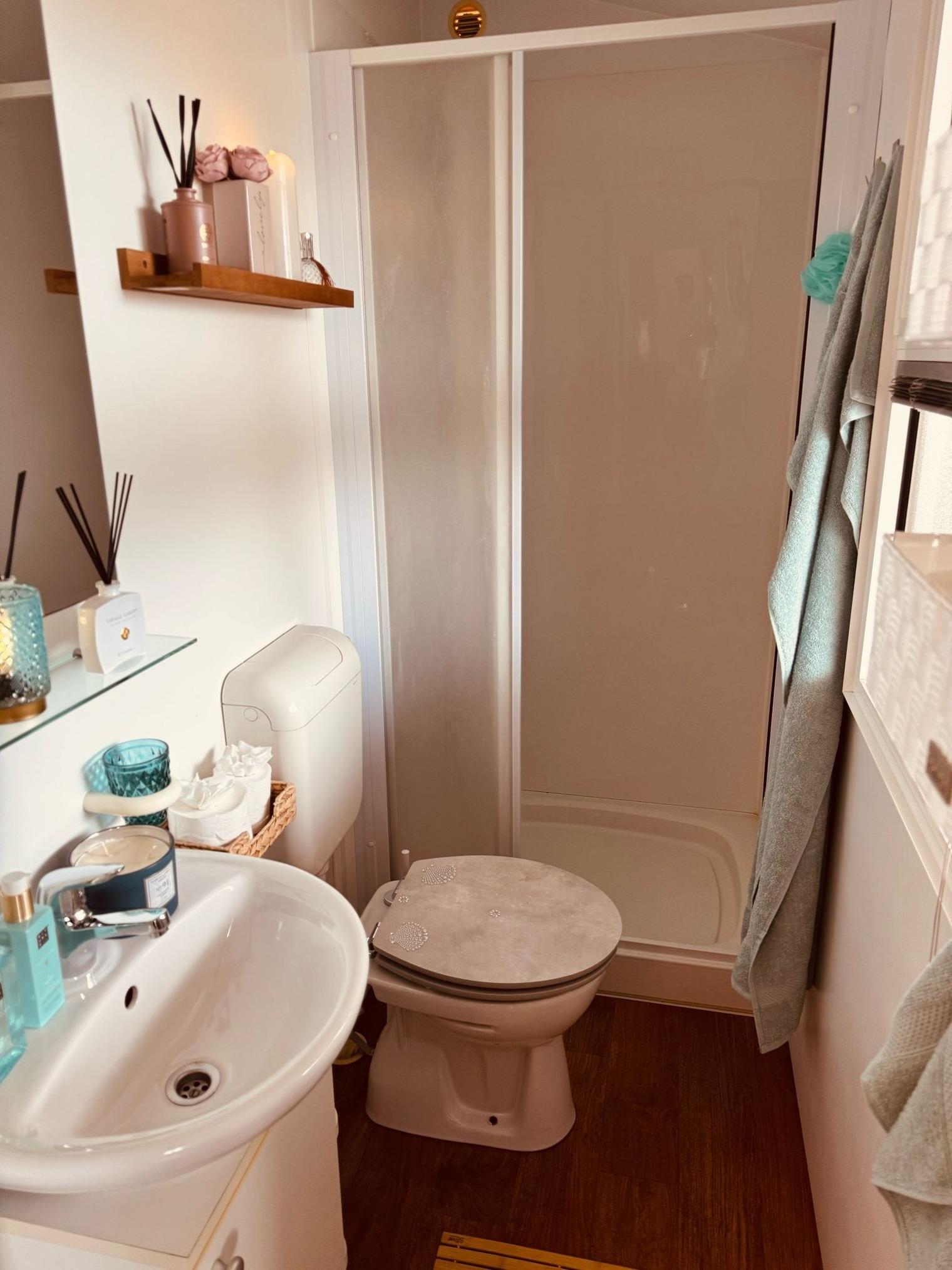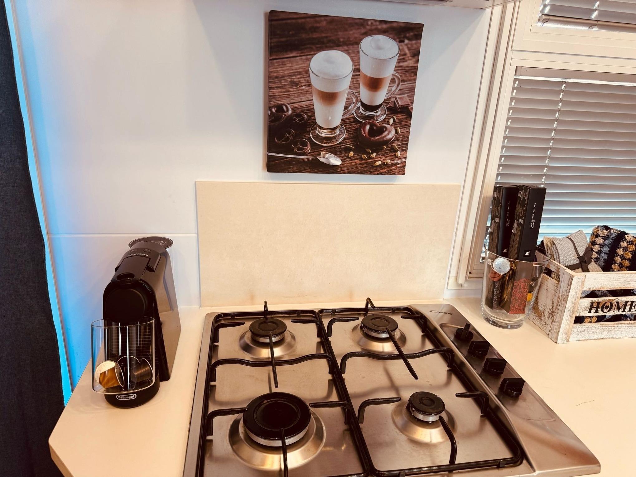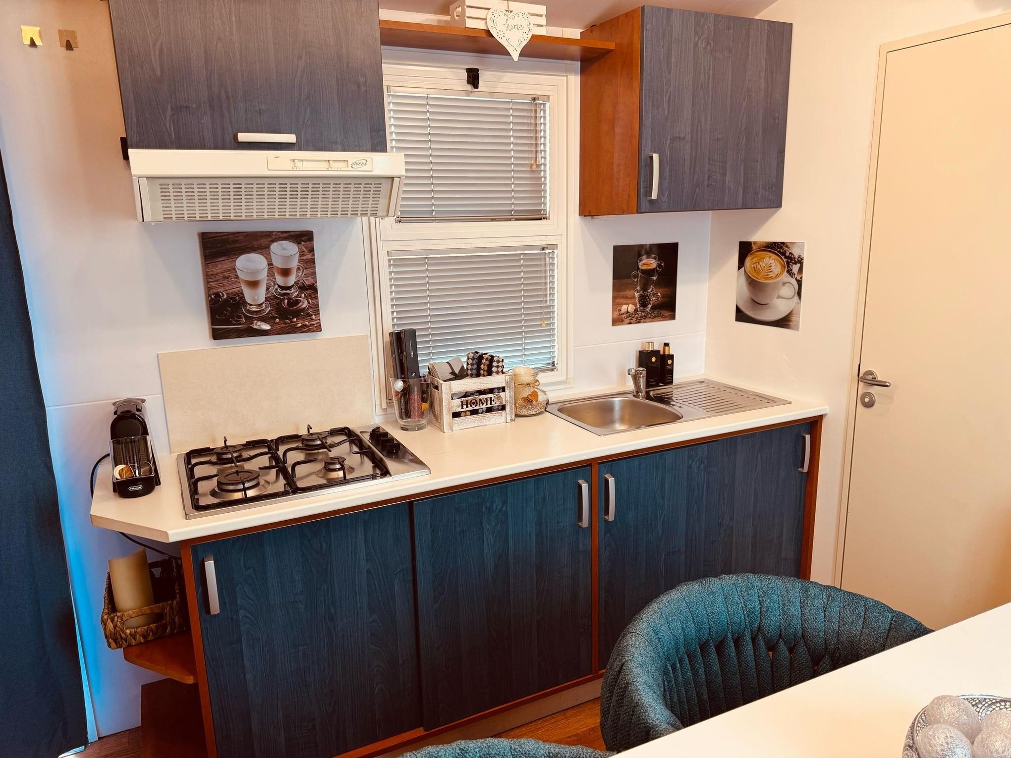 Wohnküche: hier finden Sie einen geräumigen Tisch mit einer Eckbank sowie zwei bequemen Stühlen. Die Ausstattung unsere Wohnküche wird Ihnen ebenfalls gefallen. Dazu gehören neben ausreichend Geschirr, Gläser, Besteck etc. natürlich eine Nespresso-Maschine sowie eine neue Kühl-Gefrierkombination. Abgerundet wird das Indoor-Kocherlebnis durch einen Gasherd mit Dunstabzugshaube. Eine Mikrowelle sowie ein Wasserkocher und eine Filterkaffeemaschine runden die Küchenausstattung ab. Selbstverständlich finden Sie auch eine Klimaanlage, die sowohl kühlt, als auch heizt und einen Flachbild-TV. Einen eigen WLAN-Router hat unser Mobilheim auch.