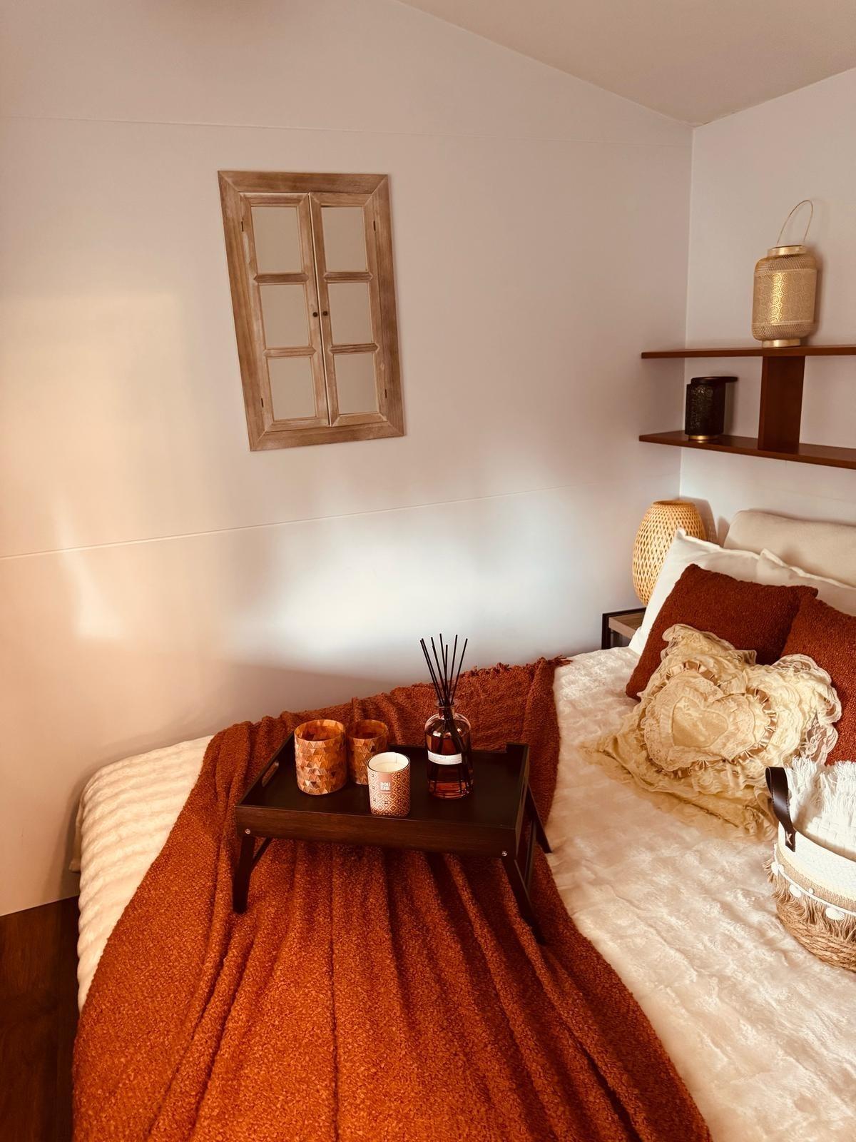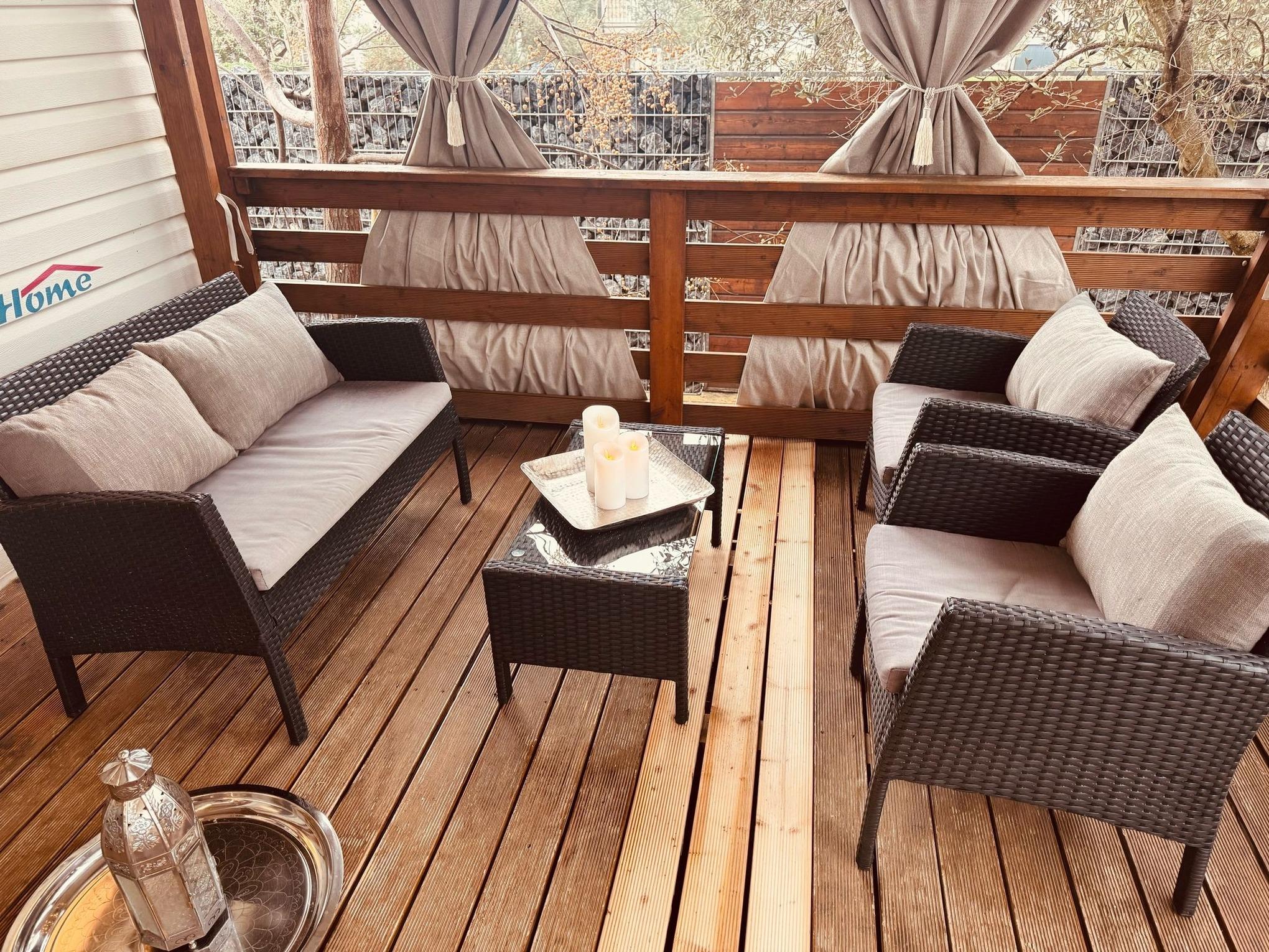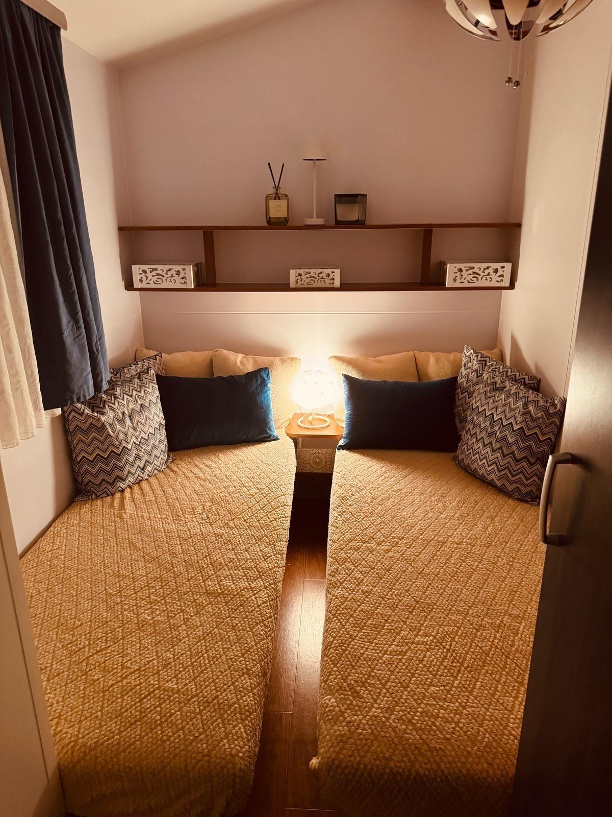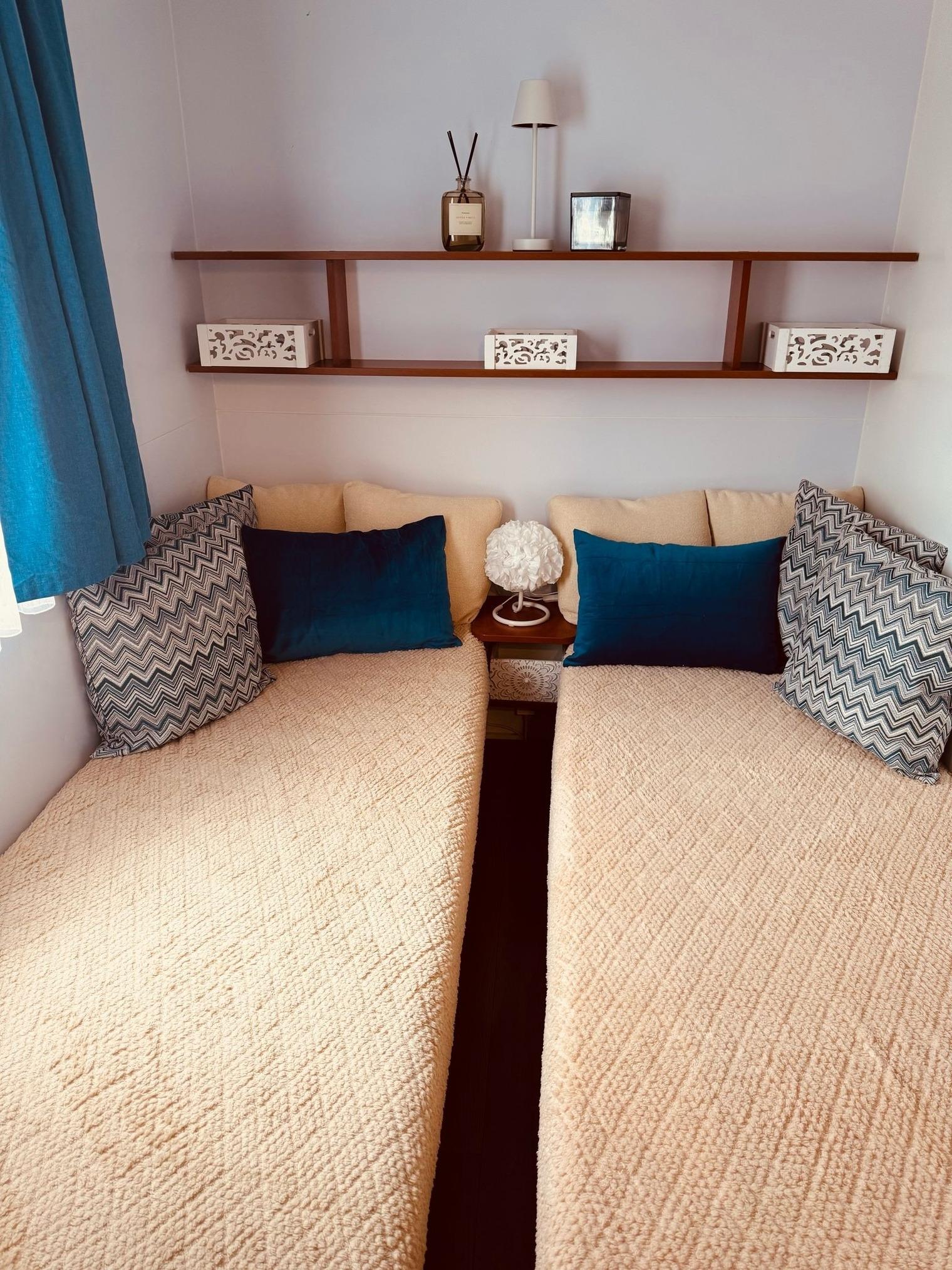 Das Mobilheim hat eine Wohnküche, zwei Schlafzimmer, Bad und eine große Veranda.