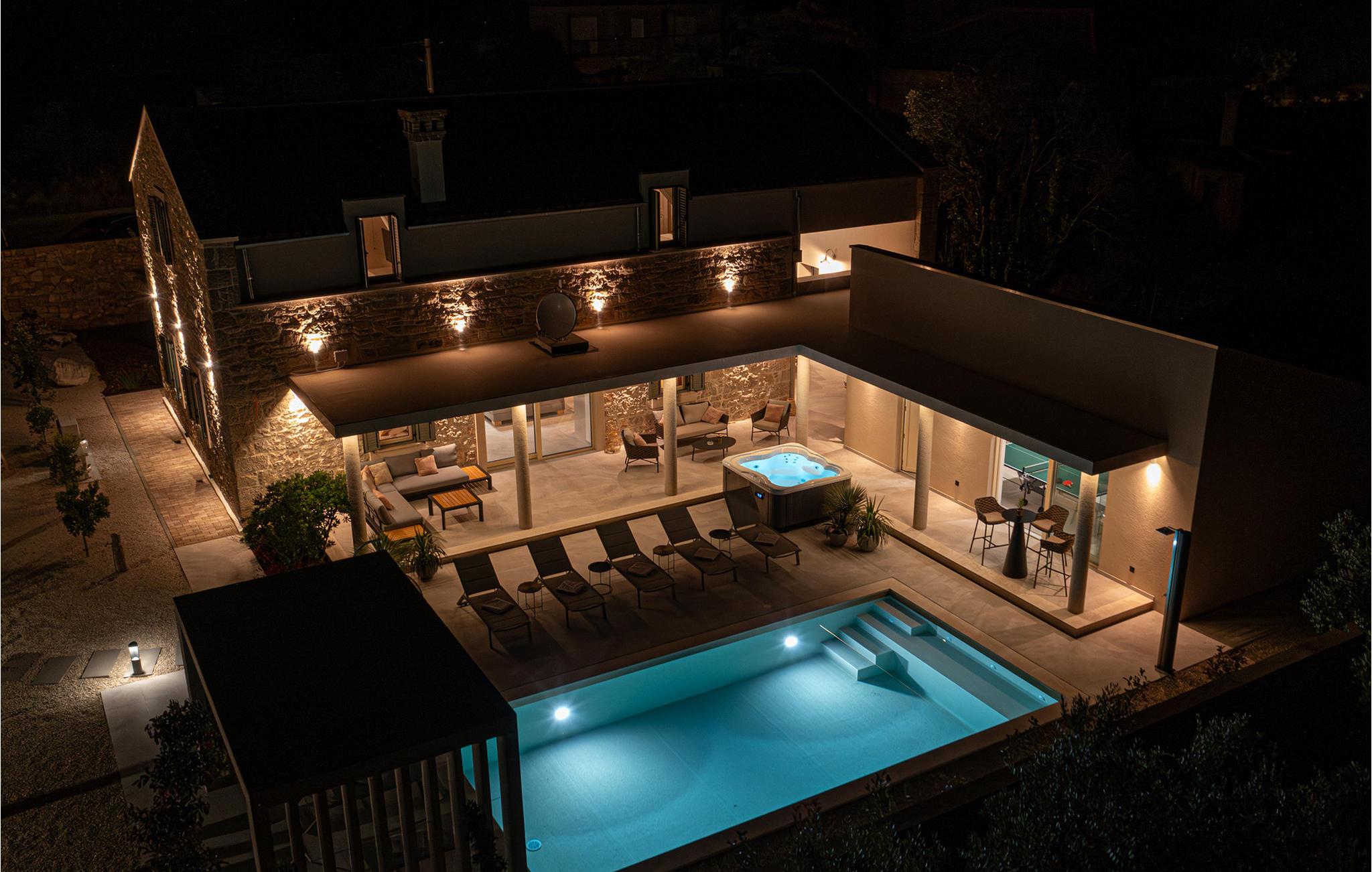 Takket være poolen er terrassen det ideelle sted at nyde spil, sjov og afslapning. Slap af på liggestolene ved poolen eller slap af med en velduftende kop kaffe i siddeområdet. Tilbring romantiske aftener i spabadet med et glas god vin. Annekset har en sauna, et legerum til børnene og et fitnessrum.