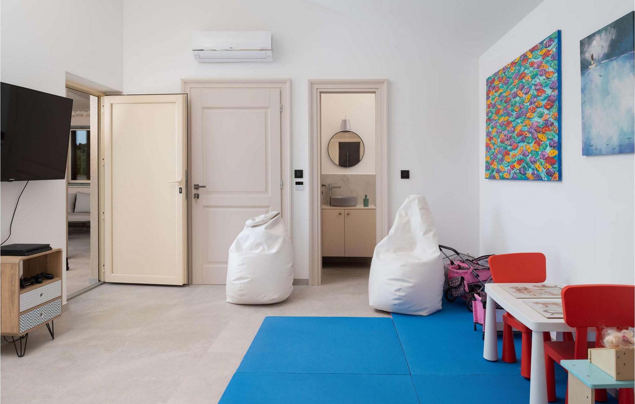 Interiøret i den smukke luksusvilla Utopia er en vellykket blanding af traditionelle og moderne elementer, der skaber en behagelig atmosfære, som I helt sikkert vil nyde. Nyd hyggelige filmaftener, tilbered lækre måltider i køkkenet med bar og find sammen omkring det store spisebord.