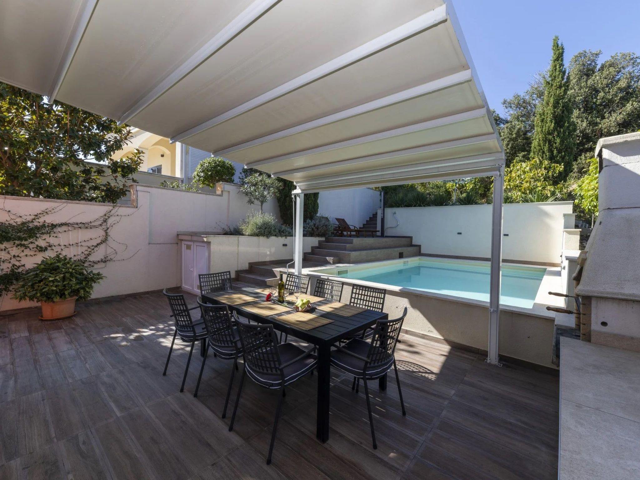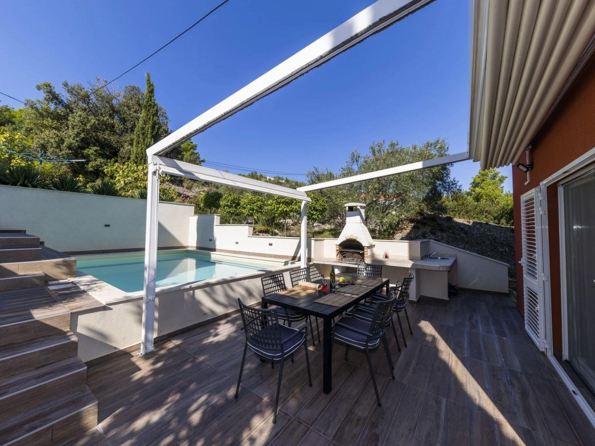 The outdoors of the villa are partially fenced and it offers a partially covered terrace by the pool. The pool is heated and private, and there are also sun lounges by the pool. On the terrace, there is a barbecue and a dining table for 8.