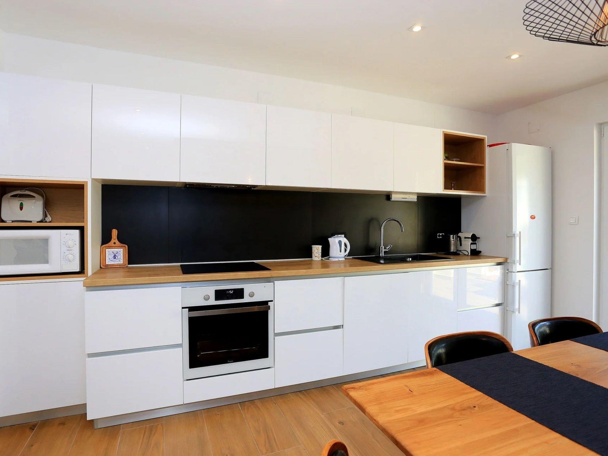 This villa can accommodate up to 8 guests, within its 3 double bedrooms, and 2 additional guests can sleep on the sofa bed. On the ground floor, there is a fully equipped kitchen with a dining area, which is connected to the living room.