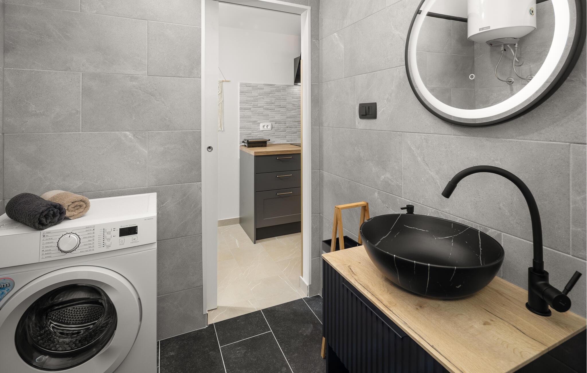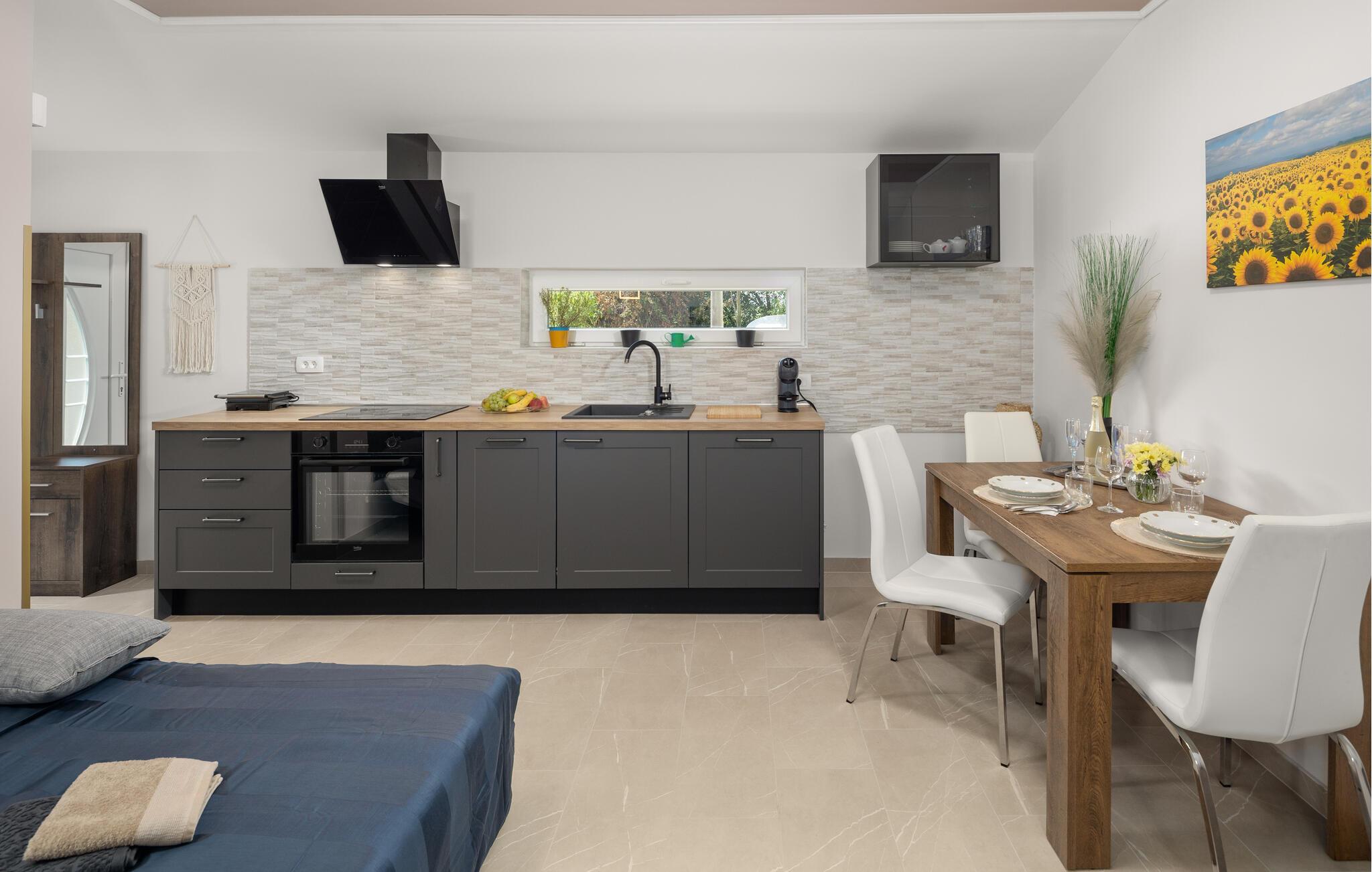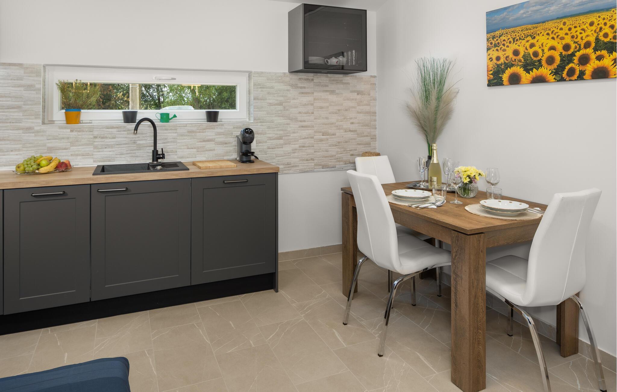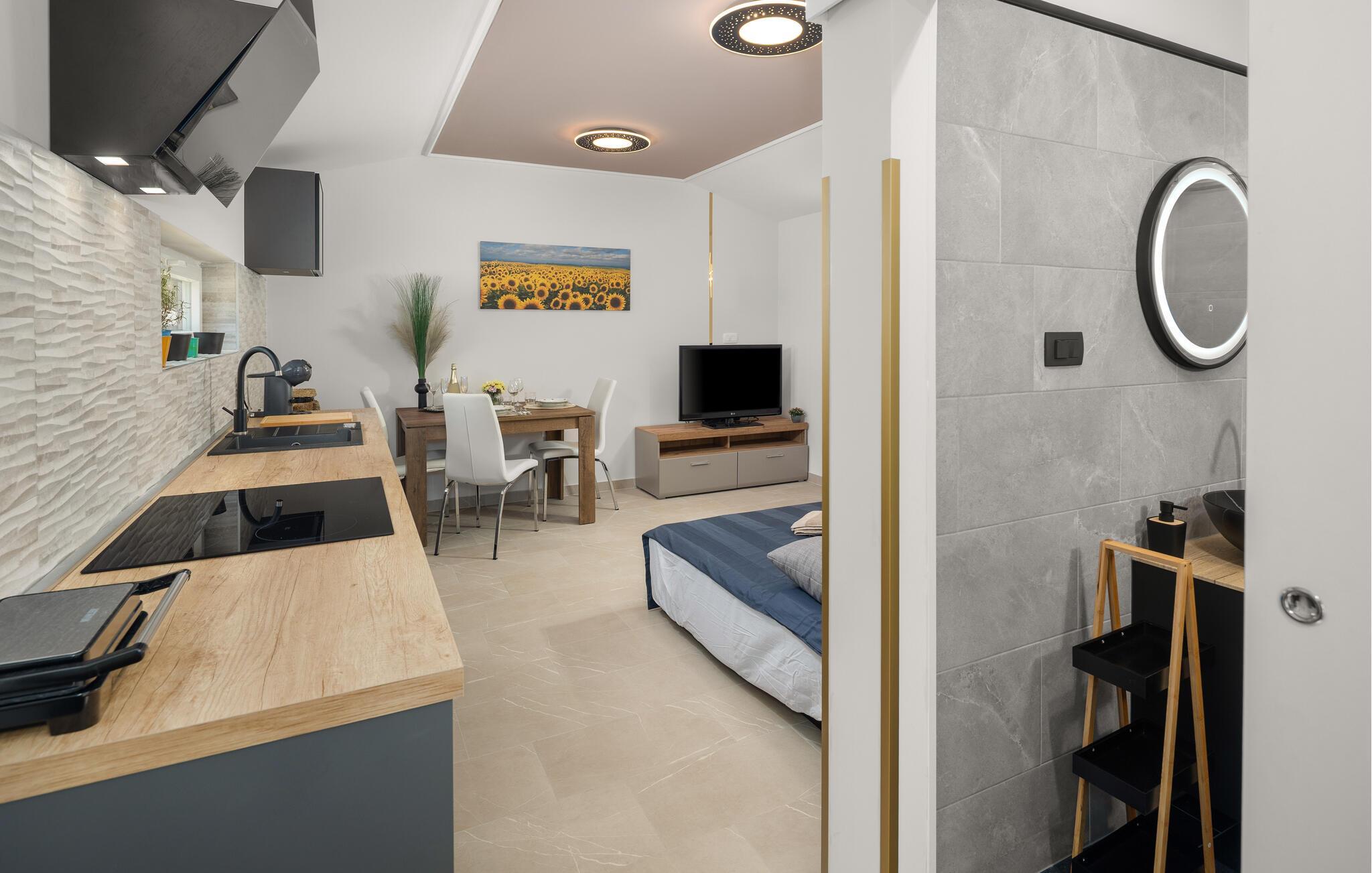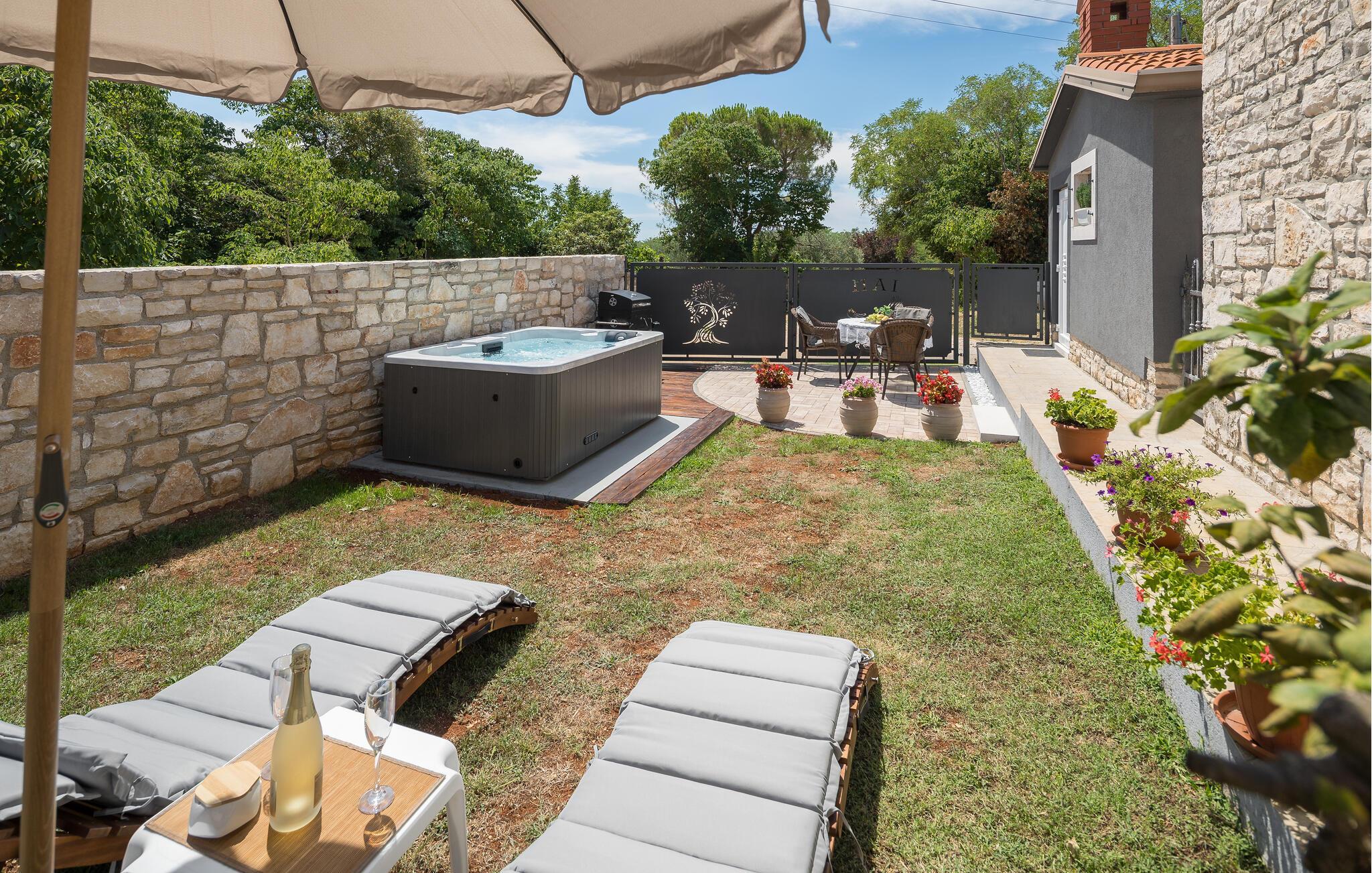Oplev en uforglemmelig ferie i dette idyllisk beliggende feriehus med spabad. I dette komfortabelt møblerede hus kombineres tidløst design og hygge for at skabe en afslappende atmosfære. Diskrete farver, et moderne køkken og et tv skaber en atmosfære, hvor I hurtigt kan slappe af. Uanset om I laver mad sammen, slapper af med en drink eller nyder en hyggelig filmaften – her finder I de perfekte rammer for afslappende dage. Gå udenfor om morgenen og tag en forfriskende dukkert i spabadet. Nyd udsigten over det smukke landskab, og slap derefter af i solen med en kølig drink. Om aftenen er haven det ideelle sted til en afslappende grillfest under stjernerne. Tilbring afslappende timer på de nærliggende strande, hvor klart vand og lavvandede indsejlinger inviterer til at svømme. Udforsk området omkring Murine på cykel eller på en gåtur gennem olivenlunde og vinmarker. Oplev den charmerende kystby Umag med dens marina, historiske bygninger og indbydende caféer langs promenaden. Lad jer forkæle på de lokale restauranter og nyd regionale specialiteter fra Istrien.