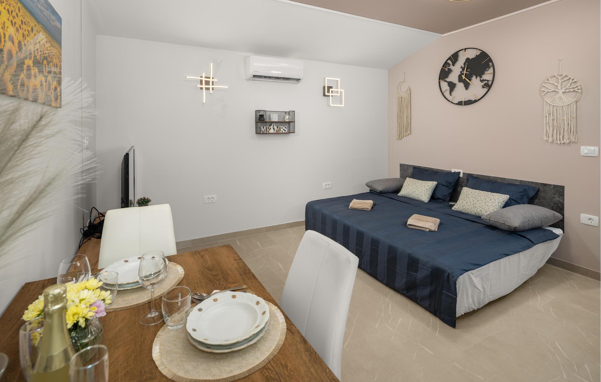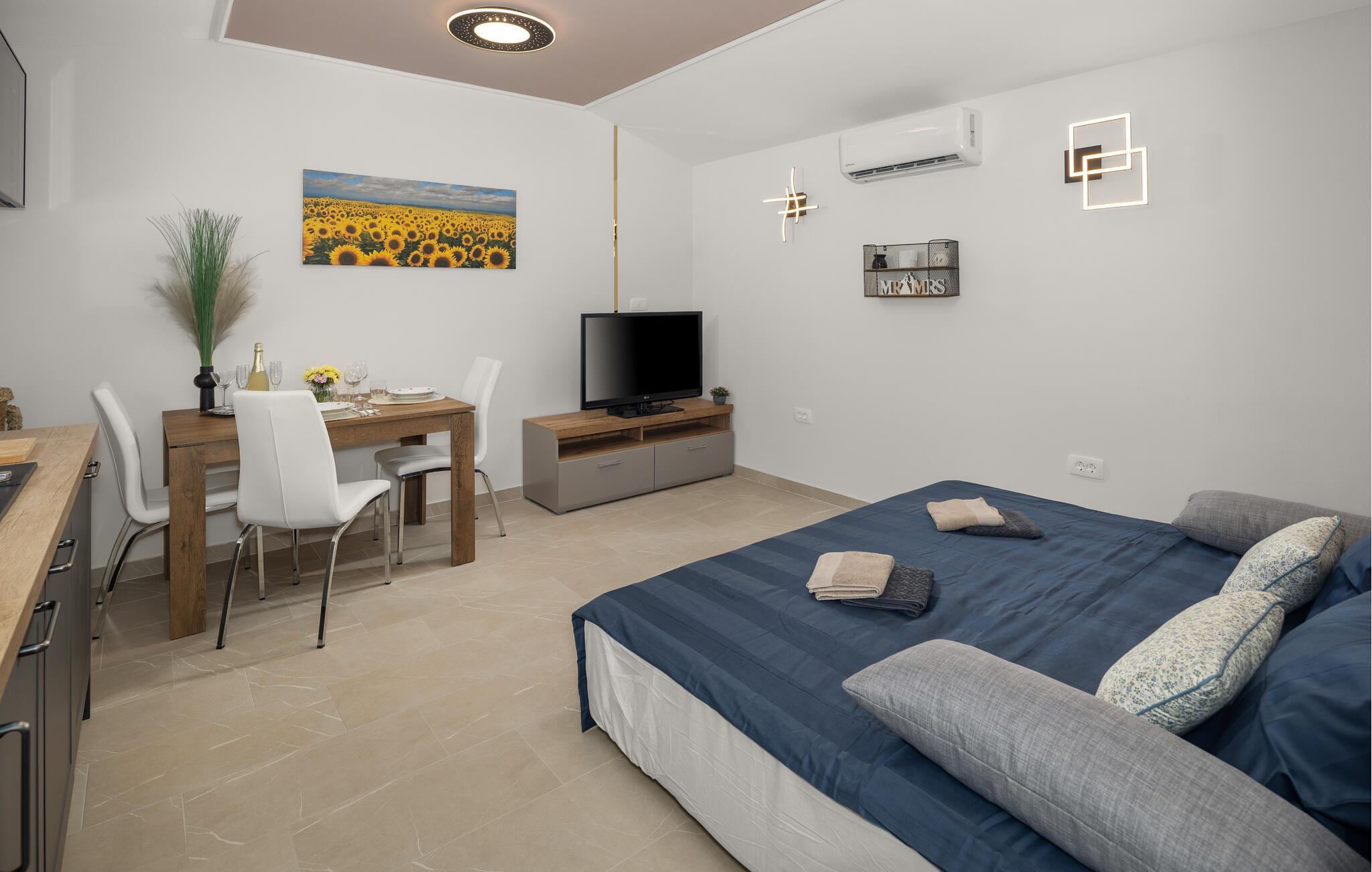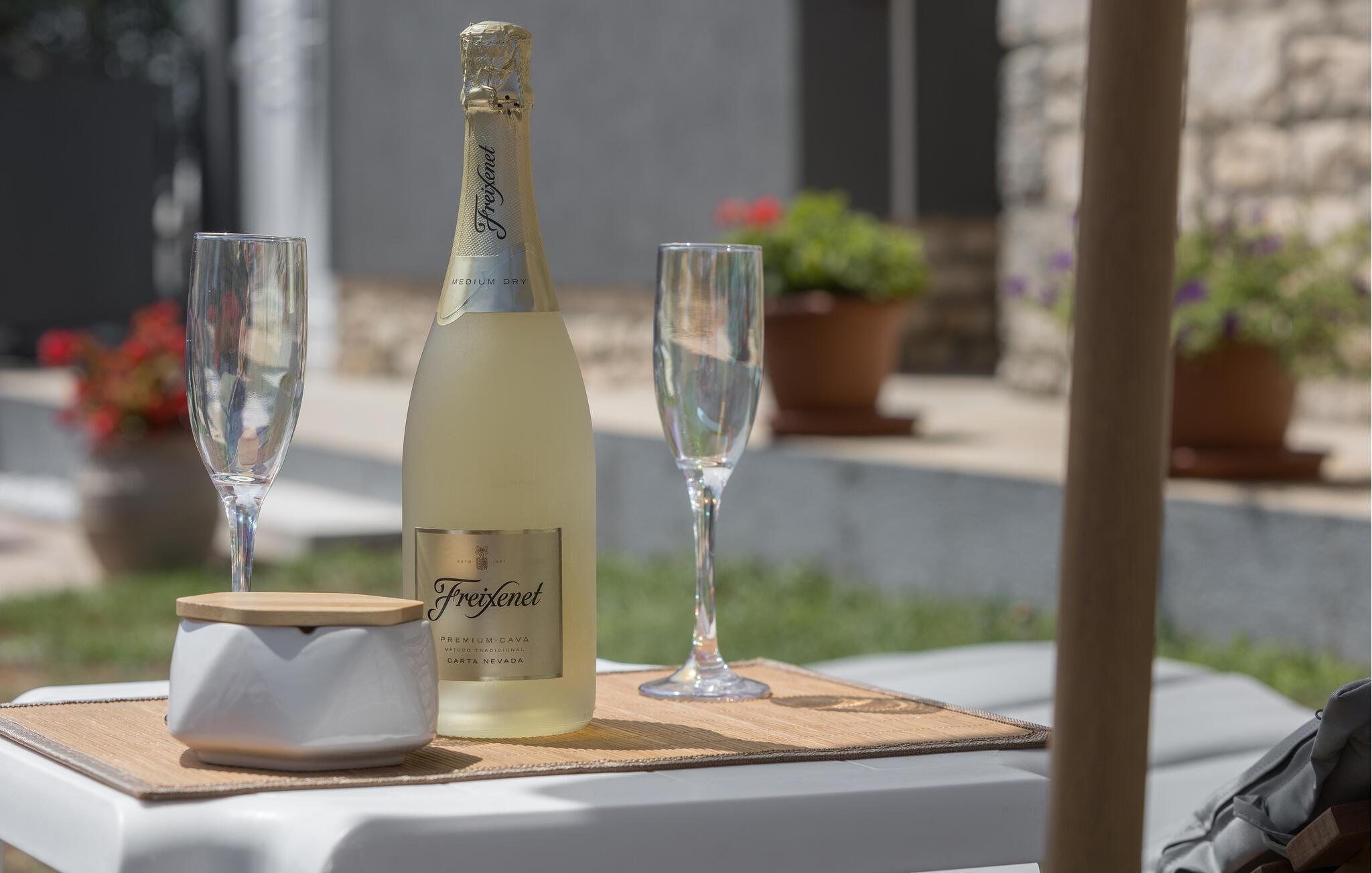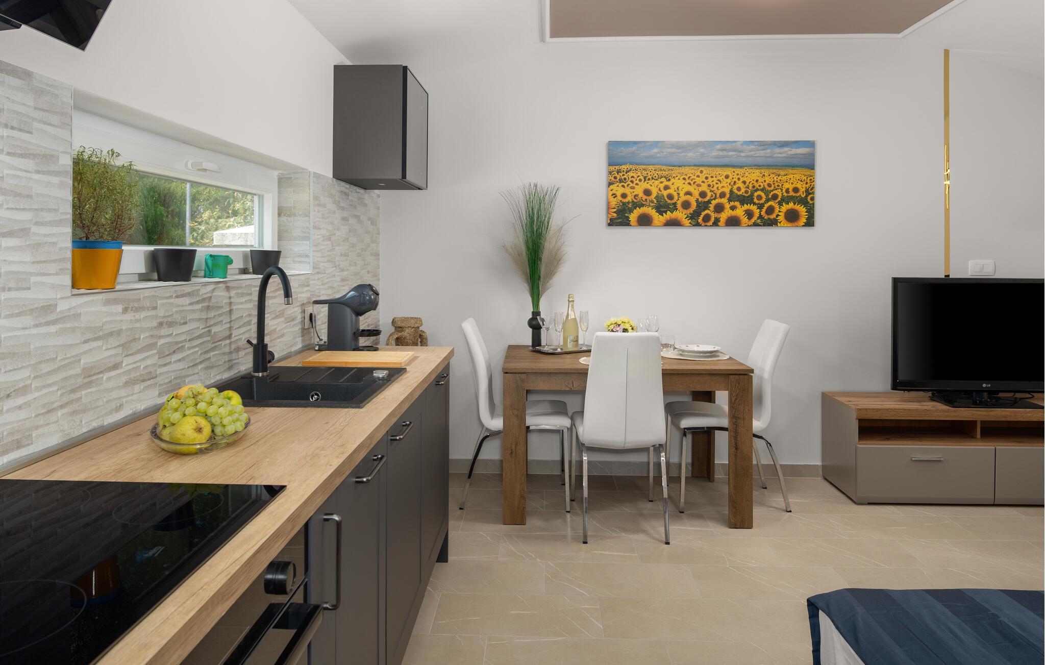 Oplev en uforglemmelig ferie i dette idyllisk beliggende feriehus med spabad. I dette komfortabelt møblerede hus kombineres tidløst design og hygge for at skabe en afslappende atmosfære. Diskrete farver, et moderne køkken og et tv skaber en atmosfære, hvor I hurtigt kan slappe af. Uanset om I laver mad sammen, slapper af med en drink eller nyder en hyggelig filmaften – her finder I de perfekte rammer for afslappende dage. Gå udenfor om morgenen og tag en forfriskende dukkert i spabadet. Nyd udsigten over det smukke landskab, og slap derefter af i solen med en kølig drink. Om aftenen er haven det ideelle sted til en afslappende grillfest under stjernerne. Tilbring afslappende timer på de nærliggende strande, hvor klart vand og lavvandede indsejlinger inviterer til at svømme. Udforsk området omkring Murine på cykel eller på en gåtur gennem olivenlunde og vinmarker. Oplev den charmerende kystby Umag med dens marina, historiske bygninger og indbydende caféer langs promenaden. Lad jer forkæle på de lokale restauranter og nyd regionale specialiteter fra Istrien.