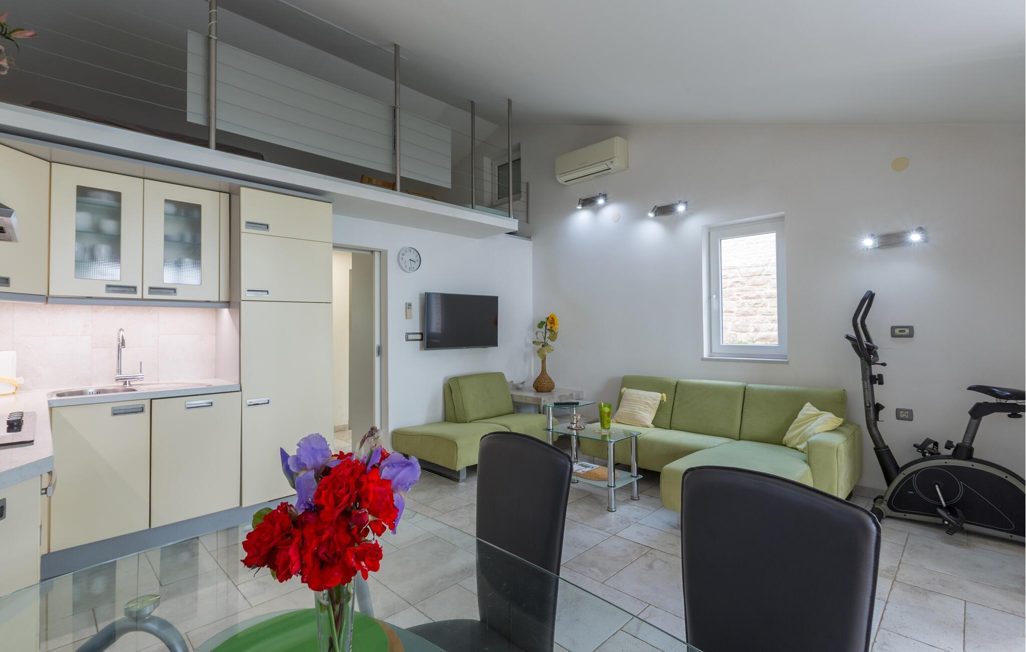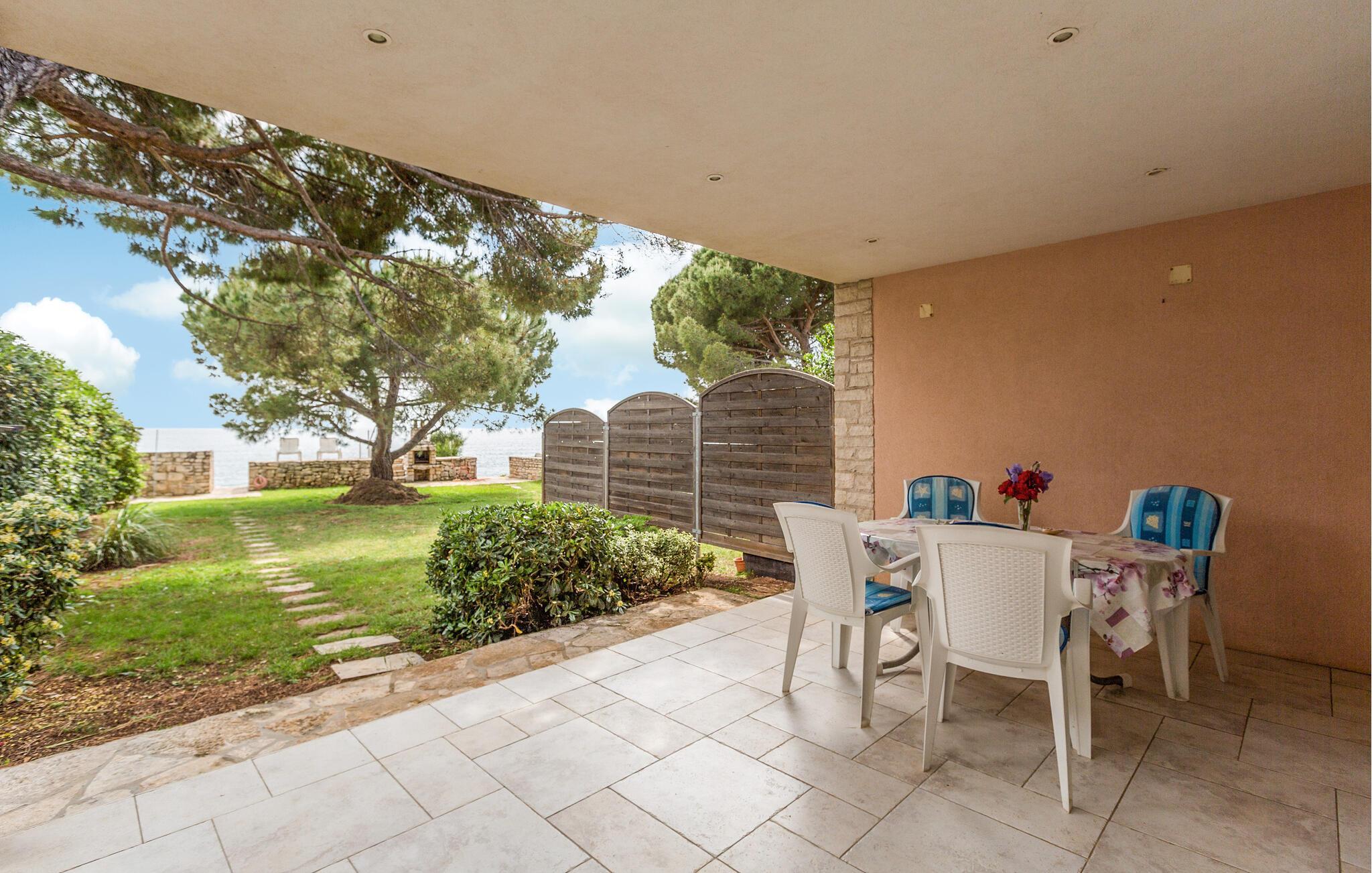 Hvad kunne være hyggeligere end at træde ud på terrassen om morgenen og lytte til bølgernes lyd? Velkommen til dette smukke hus ved stranden. Den smukke bolig byder dig og din familie velkommen i det venlige hus med en stor åben stue med galleri. Her kan du slappe af og tilberede dine yndlingsretter i det veludstyrede køkken. Start dine feriedage med morgenmad på din overdækkede terrasse og nyd den direkte udsigt over havet fra køkkenet og terrassen. Bagefter kan du opleve den ægte middelhavsstemning på dit soldæk, direkte på klippekysten, bade og solbade. Alt du behøver er et håndklæde for at nyde din ferie fuldt ud. Oplev omgivelserne og besøg de populære byer Umag og Novigrad i nærheden. Den smukke havneby Umag er præget af sin berømte lystbådehavn. Lad dig vinde over af de gastronomiske og underholdningsmuligheder. Der er regelmæssige arrangementer for alle aldre, og promenaden indbyder til en gåtur. Nyd middelhavsstemningen. Besøg også Savudrija, hvor du kan se det ældste fyrtårn ved Adriaterhavet. Glæd dig til en dejlig ferie ved Adriaterhavet!