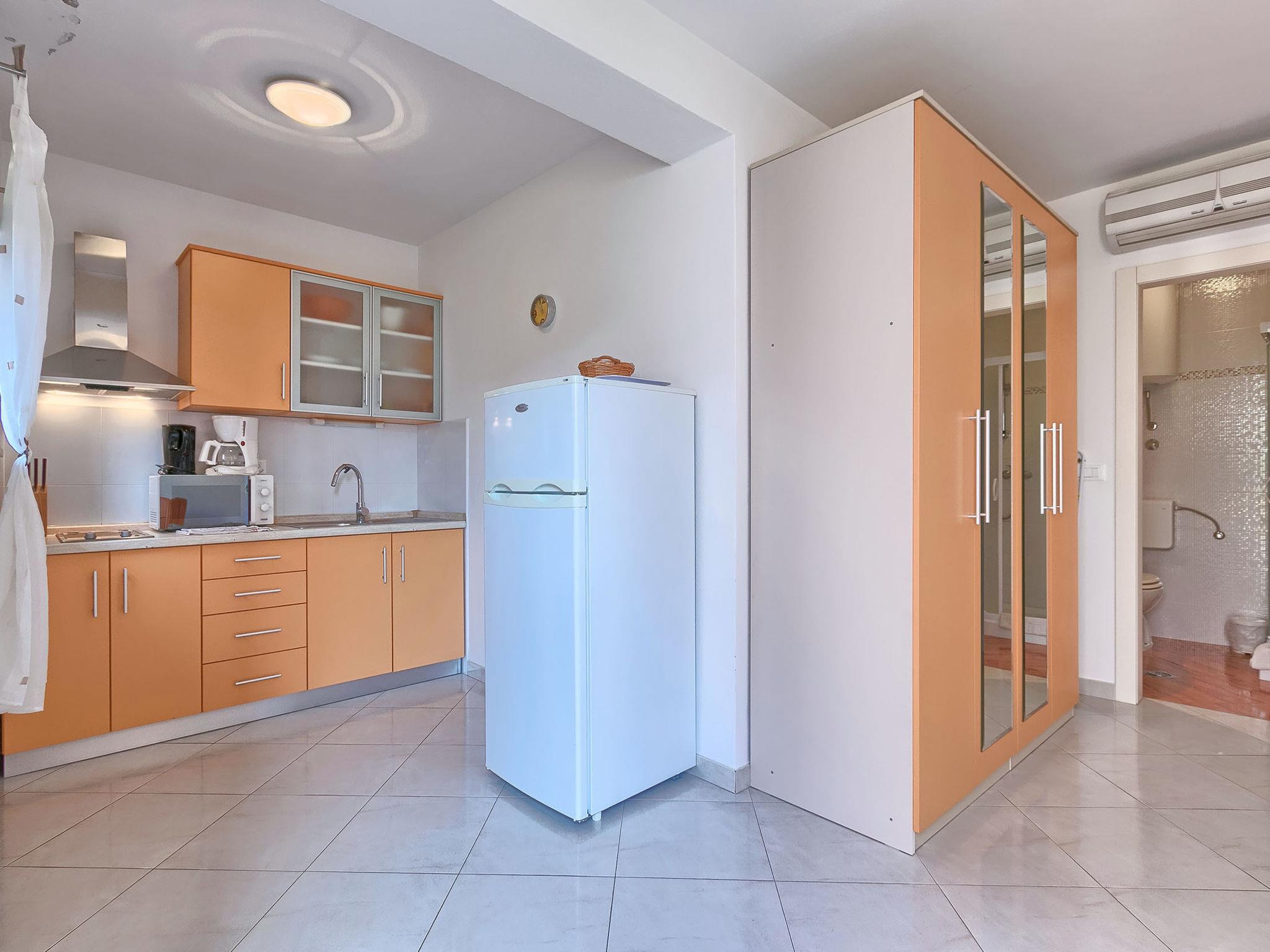 1-room apartment 25 m2, on the ground floor. Studio with 1 french bed (160 cm, length 200 cm), satellite TV (flat screen), air conditioning. Exit to the terrace. Open kitchen (2 ceramic glass hob hotplates, microwave, freezer) with dining table. Shower/WC. Terrace 8 m2. Terrace furniture. View of the garden. Facilities: safe. Internet (WiFi, free).