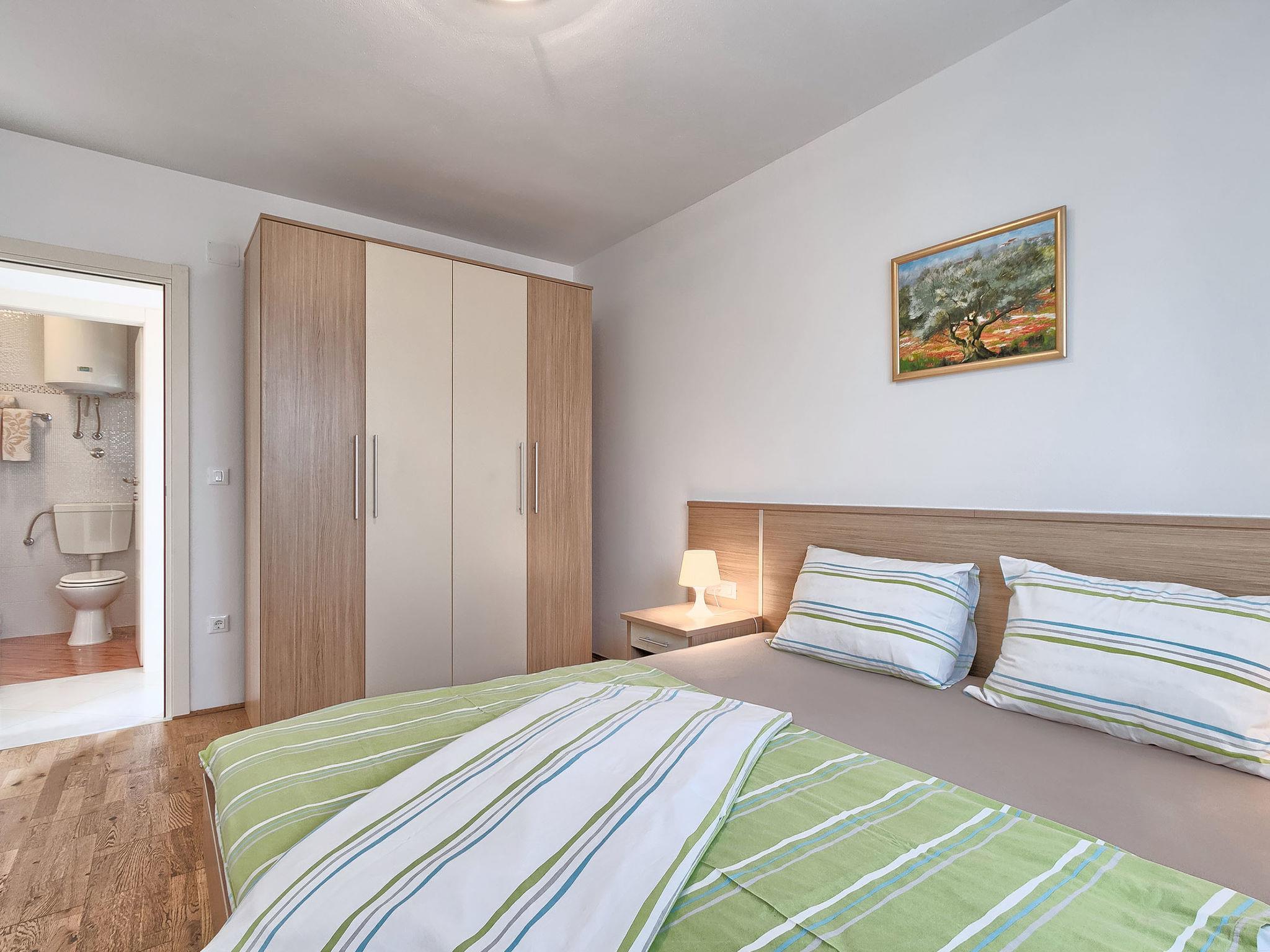3-room apartment 52 m2 on 1st floor. Living/dining room with 1 double sofabed and satellite TV (flat screen), air conditioning. Exit to the terrace. 2 rooms, each room with 1 double bed (2 x 80 cm, length 200 cm). Open kitchen (2 ceramic glass hob hotplates, microwave, freezer). Shower/WC. Terrace 6 m2. Terrace furniture. View of the garden. Facilities: Internet (WiFi, free).