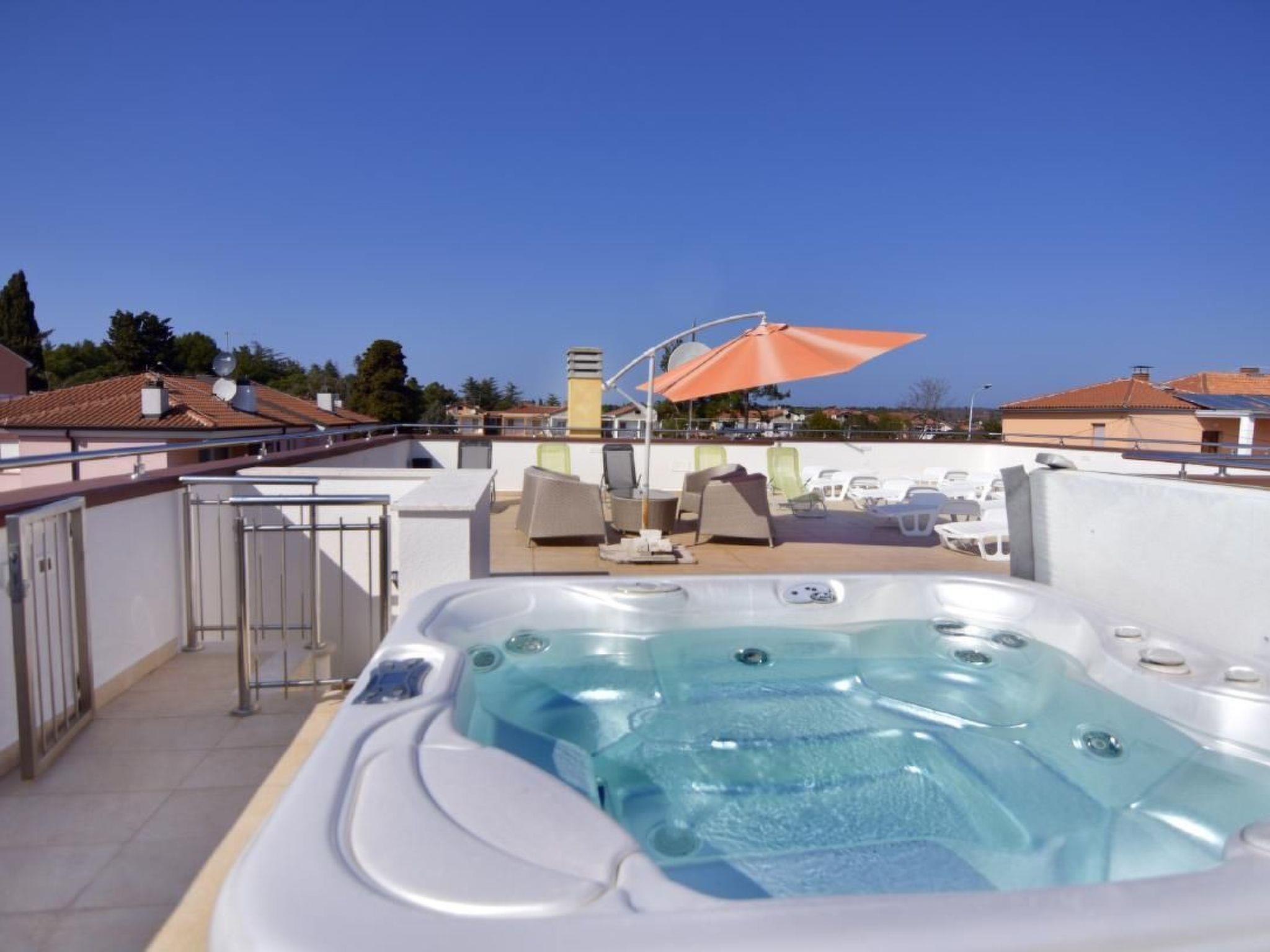 The outdoor area of the villa invites you to linger and relax. The 730 square metre property offers a small garden with play facilities for children, free private parking and a spacious roof terrace. Here you can relax on sun loungers under parasols or unwind in the outdoor hot tub, which is available for shared use. The whirlpool is used according to a set schedule, which is displayed in each flat.