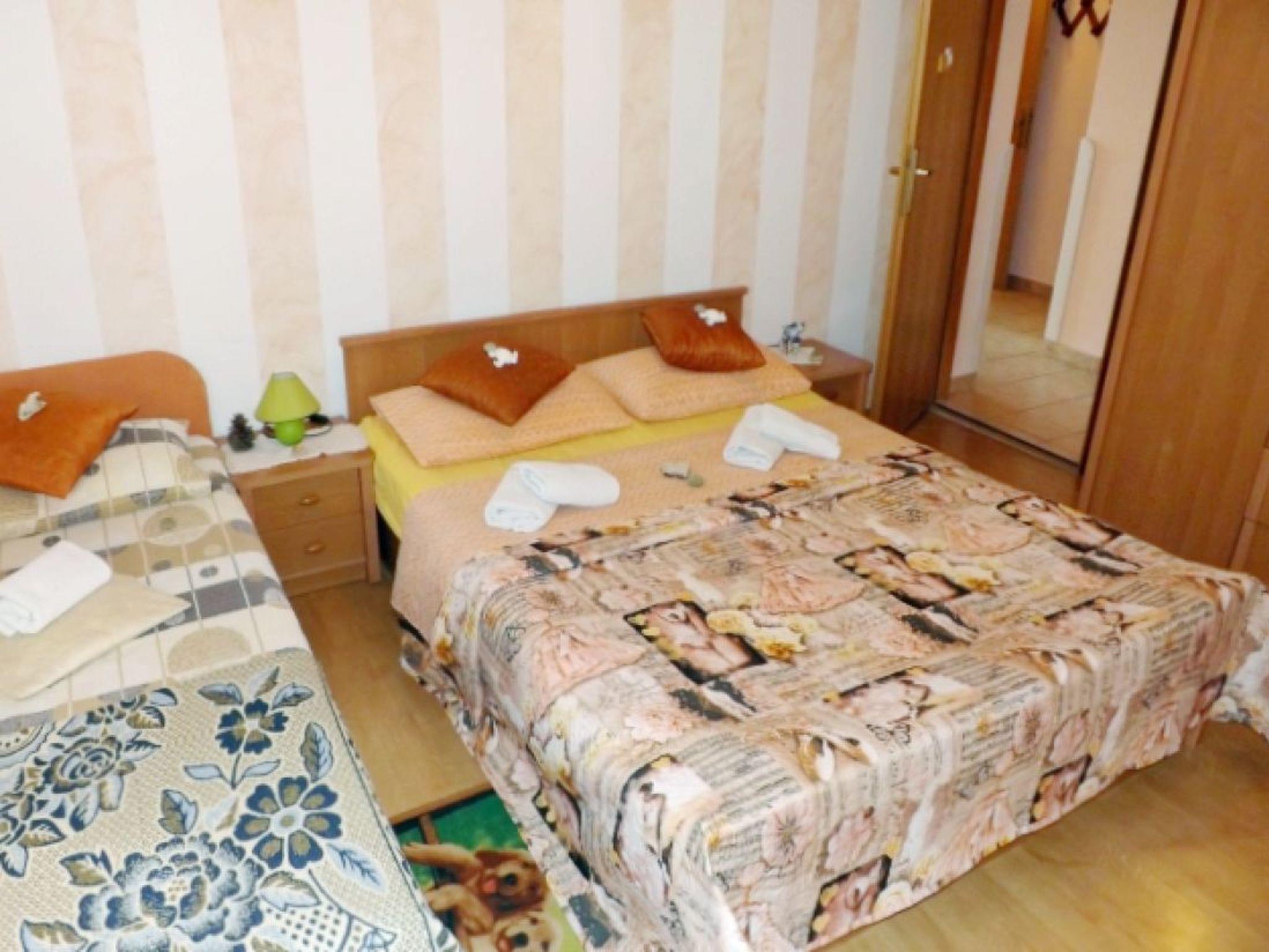 The flat has two bedrooms, one with a double bed and a single bed and the second with two single beds. The complete bathroom has a shower cubicle, washing machine, bidet, washbasin with mirror and hairdryer. The living area with kitchen is equipped with hob, microwave, filter coffee machine, kettle, fridge, dining table with chairs, sofa bed for two people, flat screen satellite TV, air conditioning and Wi-Fi connection - free Wi-Fi. The private terrace at the entrance is furnished with a table and chairs and a barbecue.
