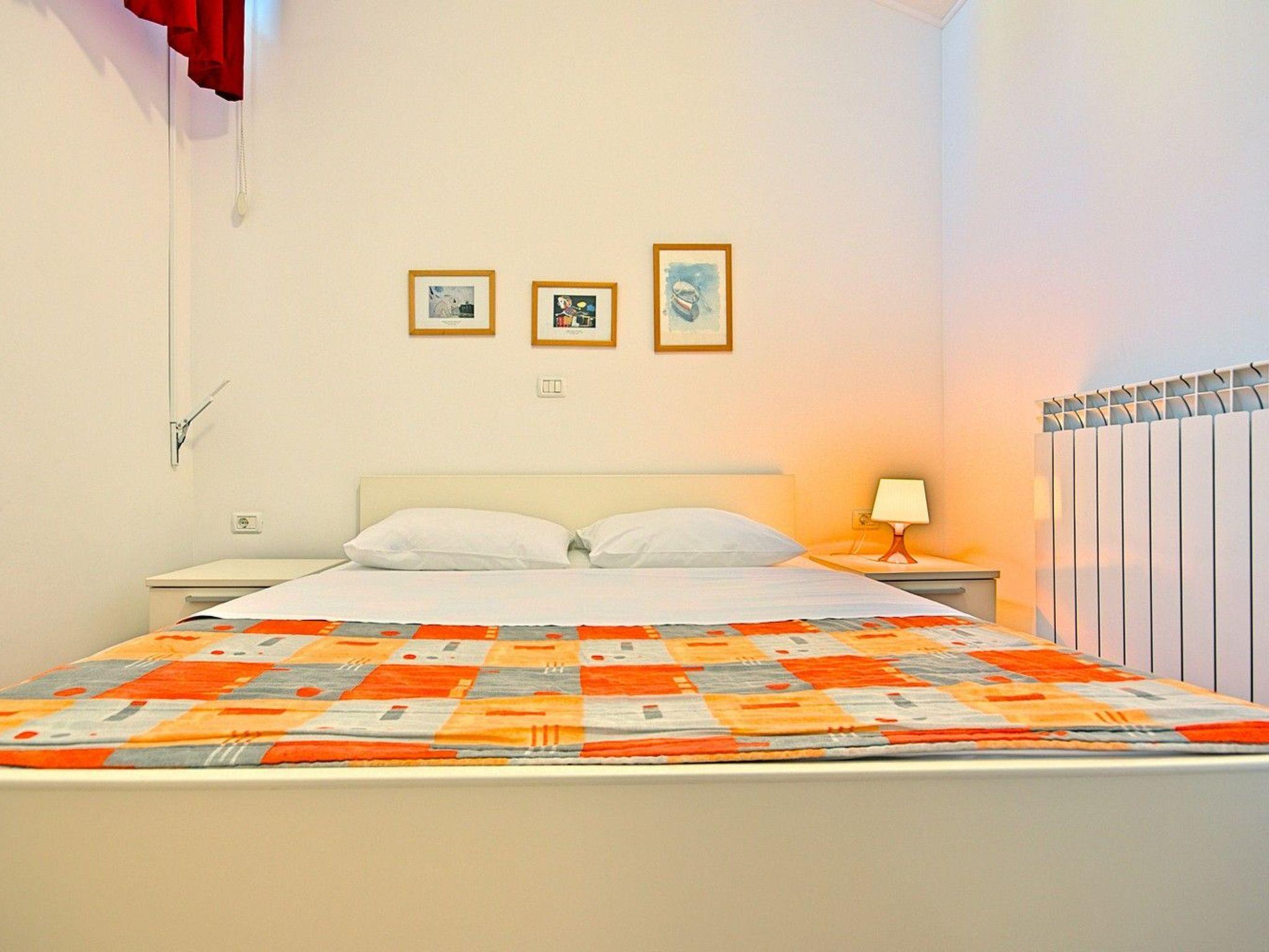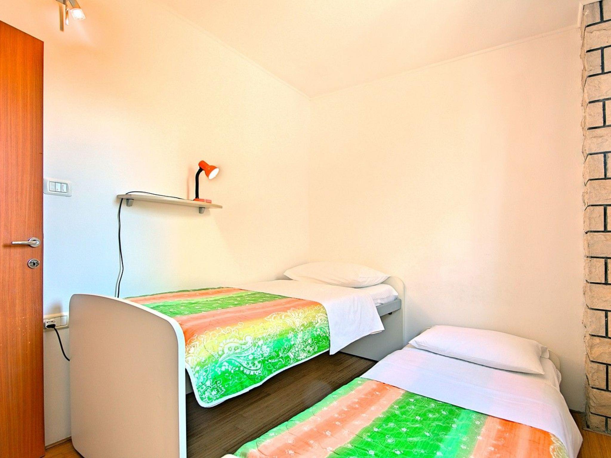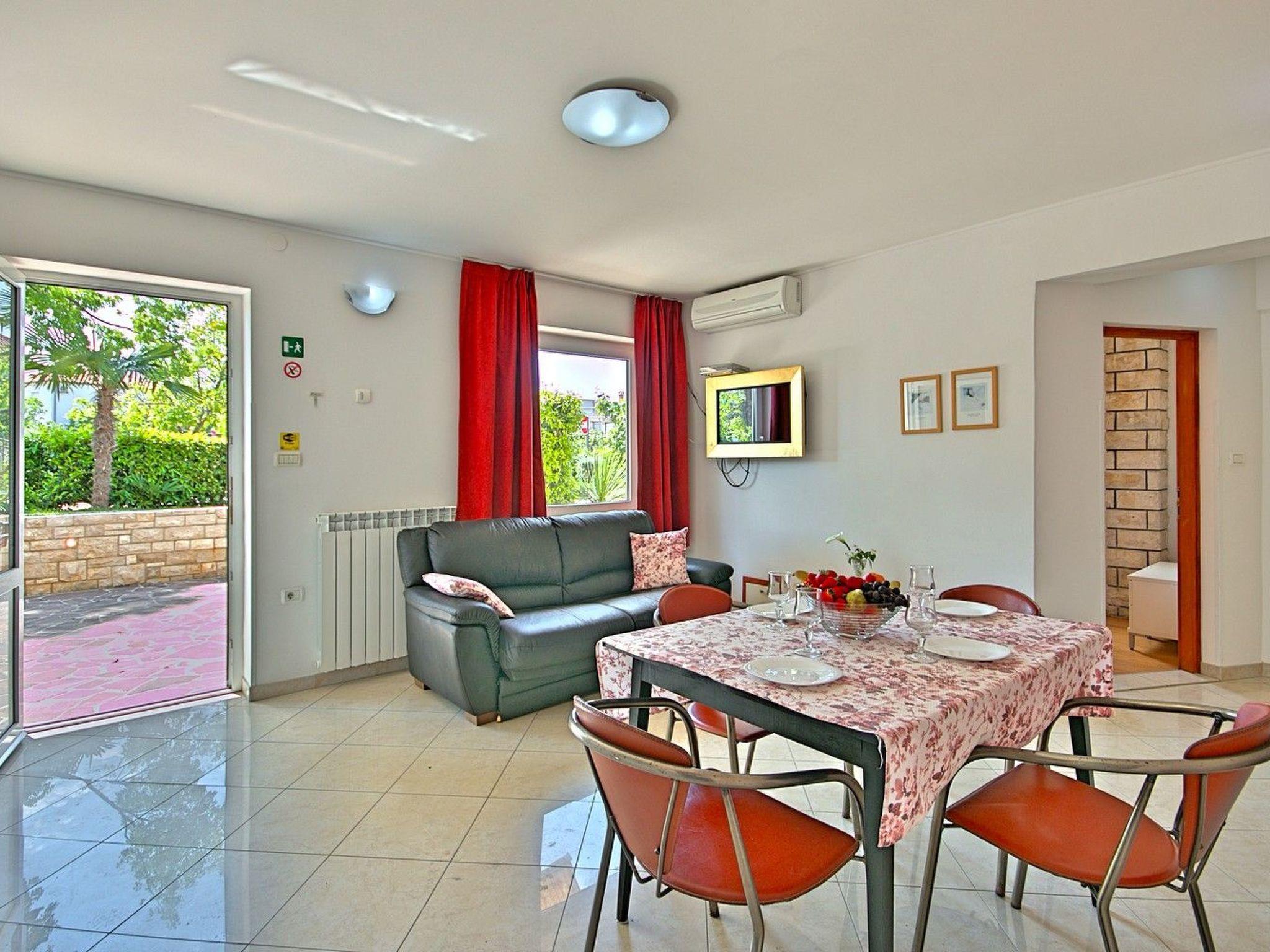 The 50 m2 apartment in a sunny position is one of the most beautiful in the house and has a large 15 m2 terrace furnished with an Istrian stone table and benches, equipped with a sunshade, to shelter from the sun during the hottest hours. 'hot of the day. From the terrace you enter the living area consisting of a living area equipped with a sofa bed for two people, flat-screen satellite TV, air conditioner, free Wi-Fi internet connection. The kitchenette is equipped with an electric ceramic hob with 4 hotplates, fridge, kettle, coffee machine, plates and cutlery, kitchen utensils, a dining table with chairs is available. The apartment has two bedrooms. A bedroom with double bed (160 cm, length 200 cm), wardrobe, bedside tables, the second bedroom has 2 single beds (80 cm, length 200 cm) one is extractable as shown in the photo, the bed linen is supplied (changed weekly). The bathroom with shower and hydromassage, sink with mirror, toilet, bidet, two bath towels per person are provided. The terrace has a magnificent view of the well-kept garden.