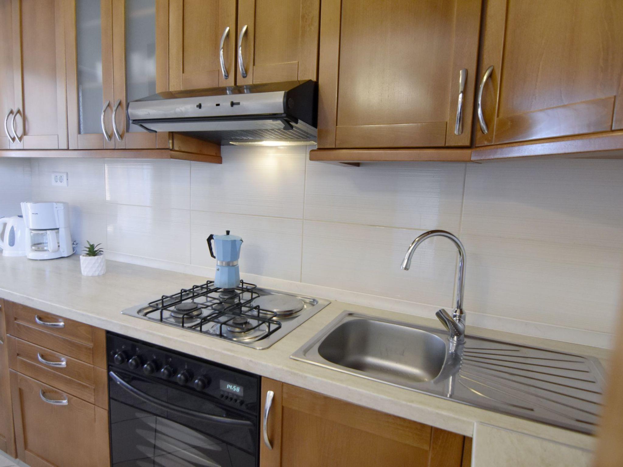 The apartment consists of two comfortable bedrooms, each with a double bed, two bedside tables with night lamps, wardrobe, bed linen is provided (changed weekly). The bathroom is equipped with a bathtub, bidet, mirror, sink with cabinet, toilet and external window. Two bath towels per person are provided (changed weekly). The living area has a fully equipped kitchenette, equipped with a hob with three gas burners and an electric hob, oven, extractor hood, fridge with freezer area, coffee machine and mocha. The dining room connected to the kitchenette has a table and chairs, sofa and TV