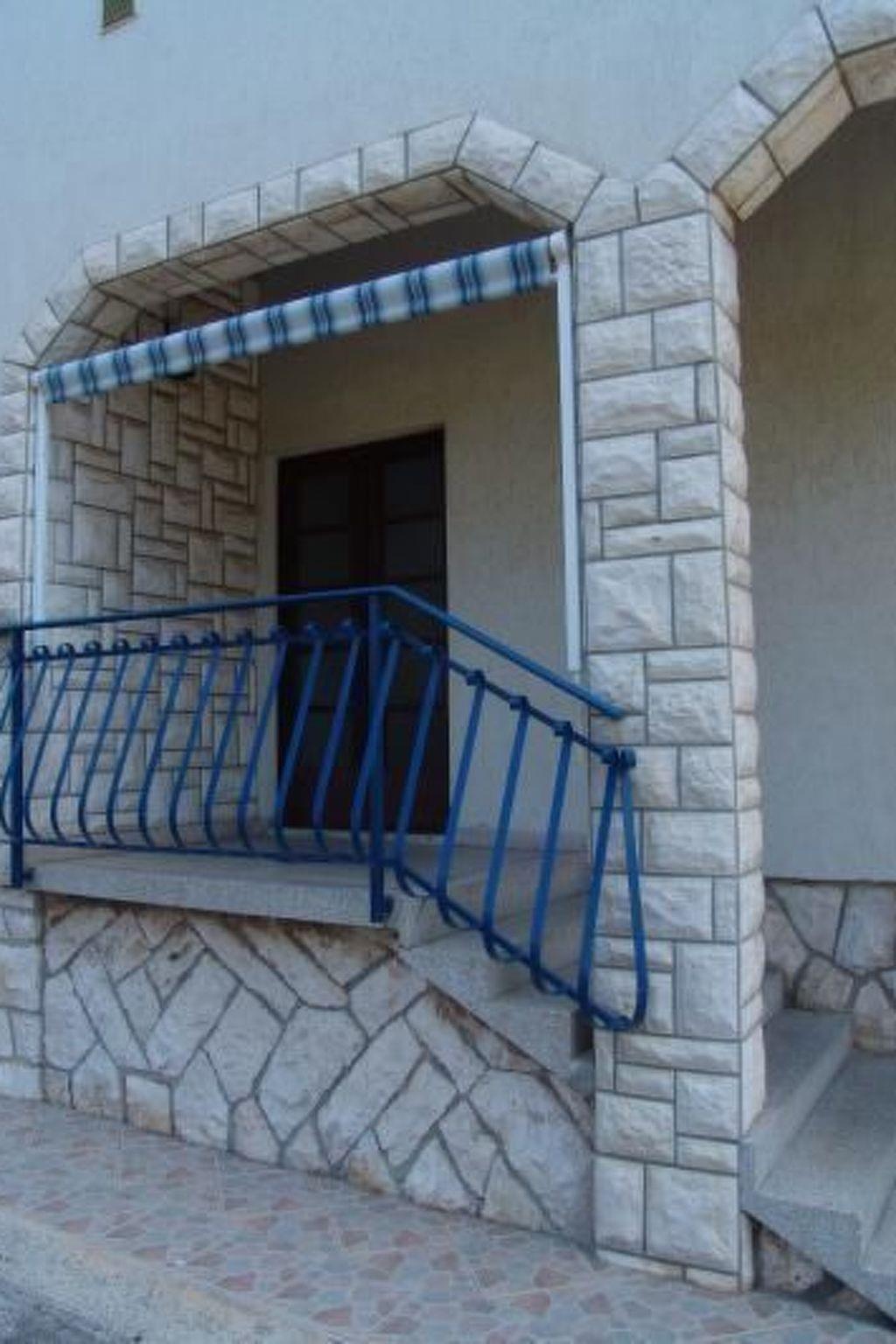 On the ground floor fully equipped flat D-6* for 5 persons, fully equipped kitchen, living room with seating, bathroom with shower, washbasin and toilet, two separate bedrooms: bedroom 1 with a double bed, bedroom 2 with a double bed and with a single bed, both bedrooms with doors opening onto large French balcony with terrace furniture with sea view, air-conditioning.
