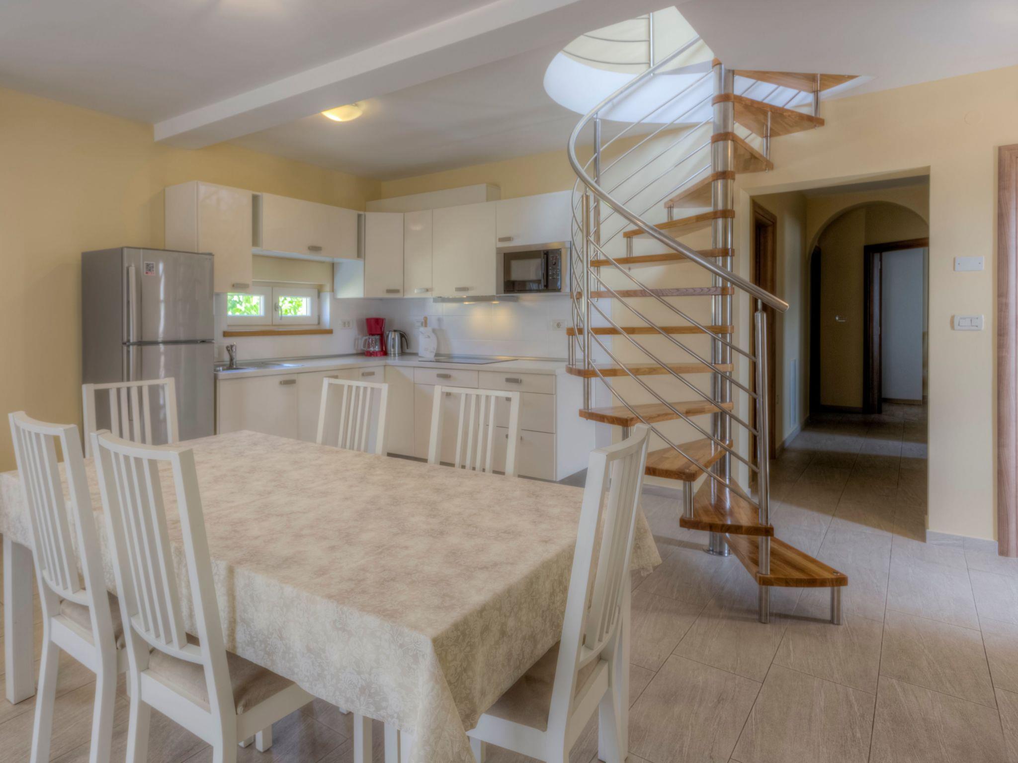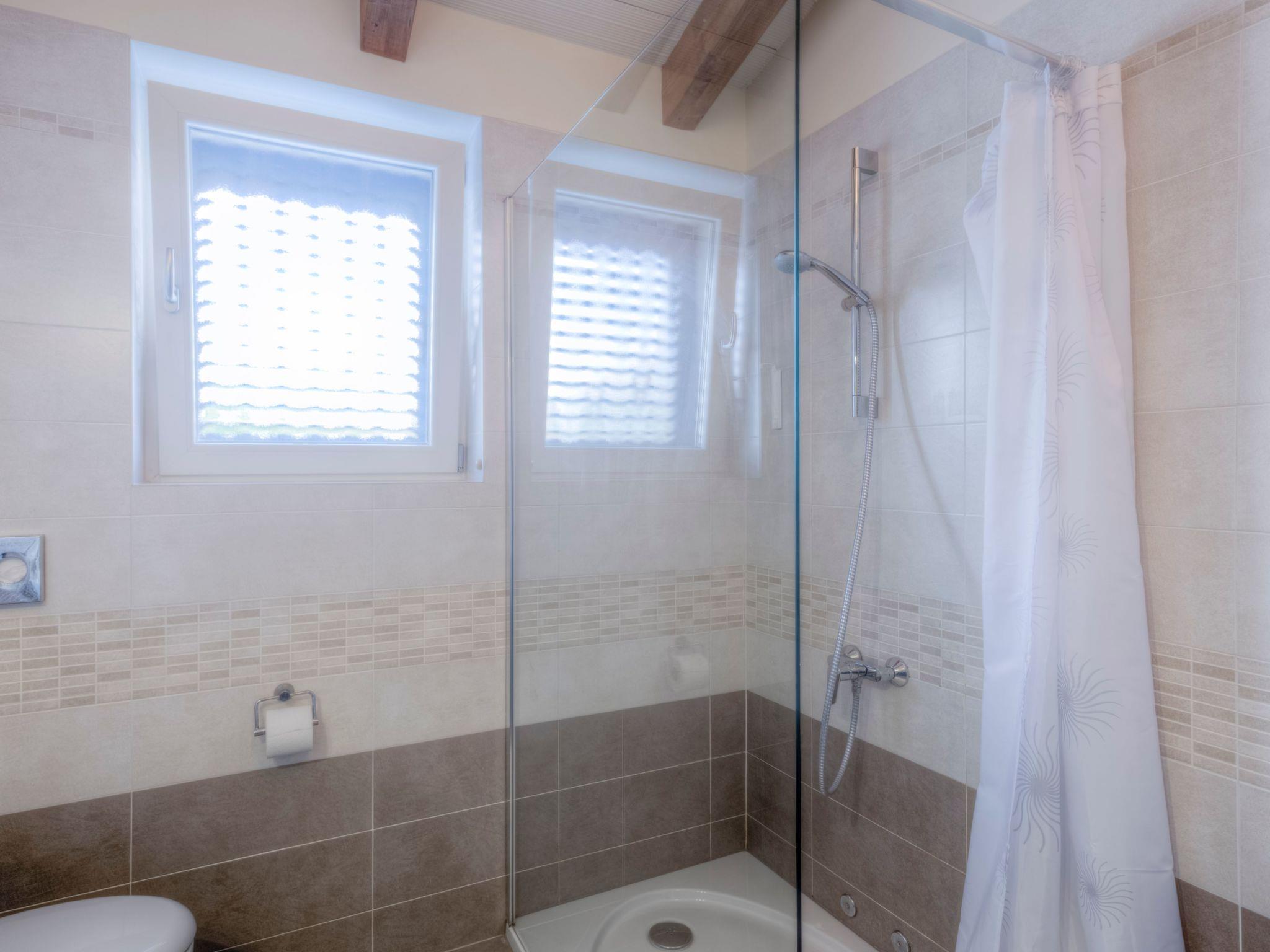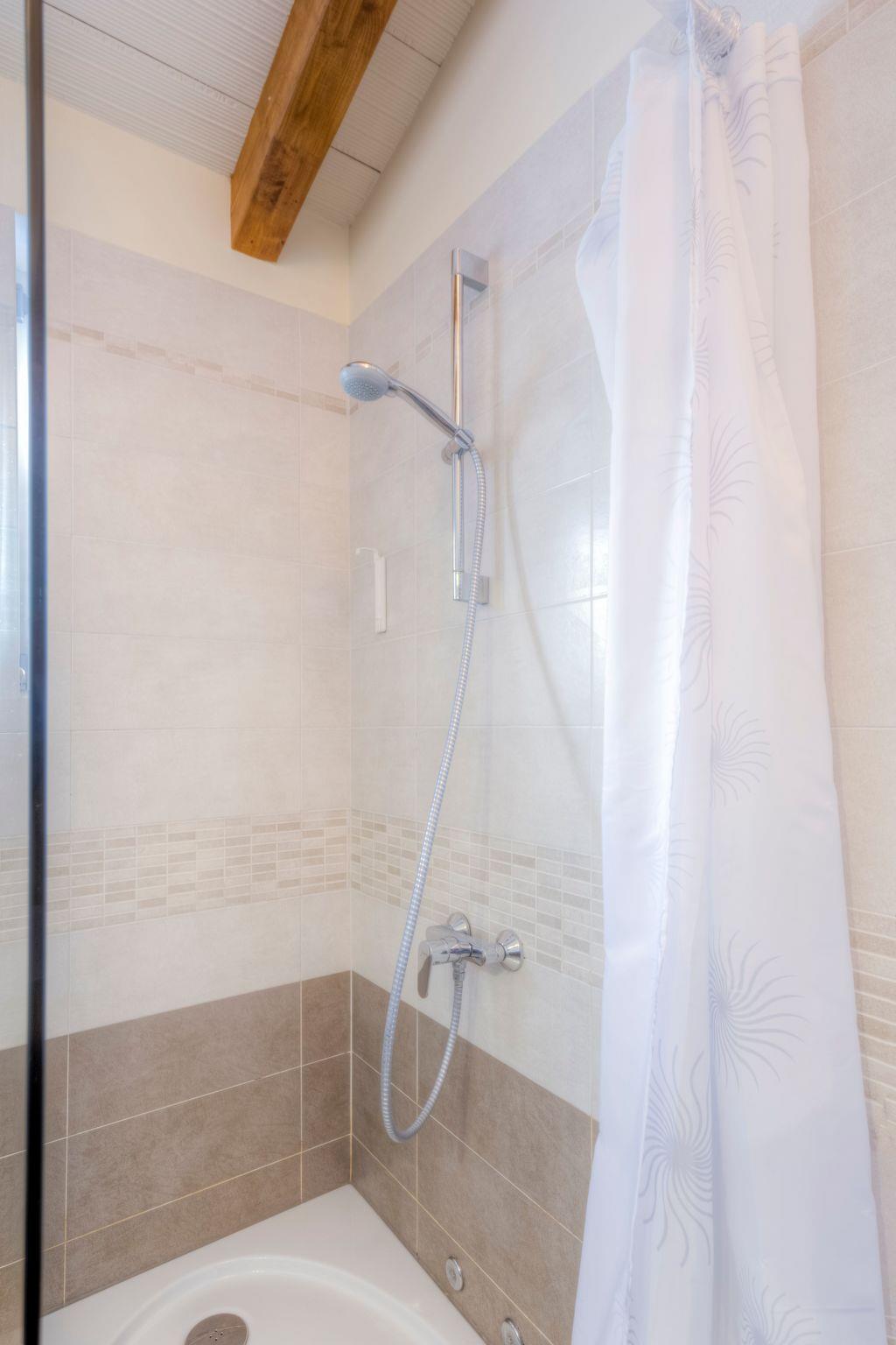 This apartment is modern and fully furnished. It is on the first floor and receives ample daylight. It has three rooms. Two bedrooms are with a double bed and one with a single bed of 120x200cm. There is also a sofa bed for children or teenagers in the living room. There is a fully-equipped, open kitchen with a living and dining area, with a dining table and chairs. Here there is also a TV with satellite reception and wireless Internet access is available. The two bathrooms have a shower and WC and there is also an outdoor shower. A hairdryer and an iron are provided.