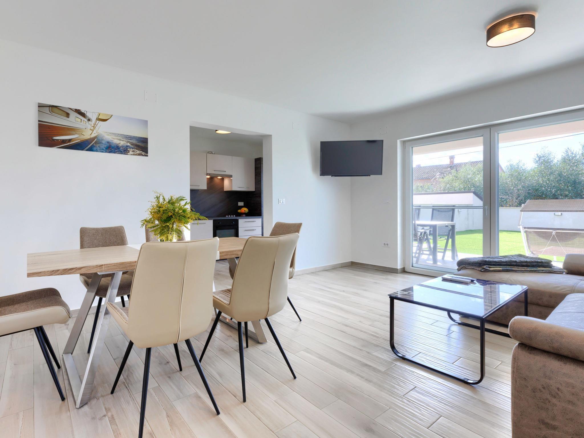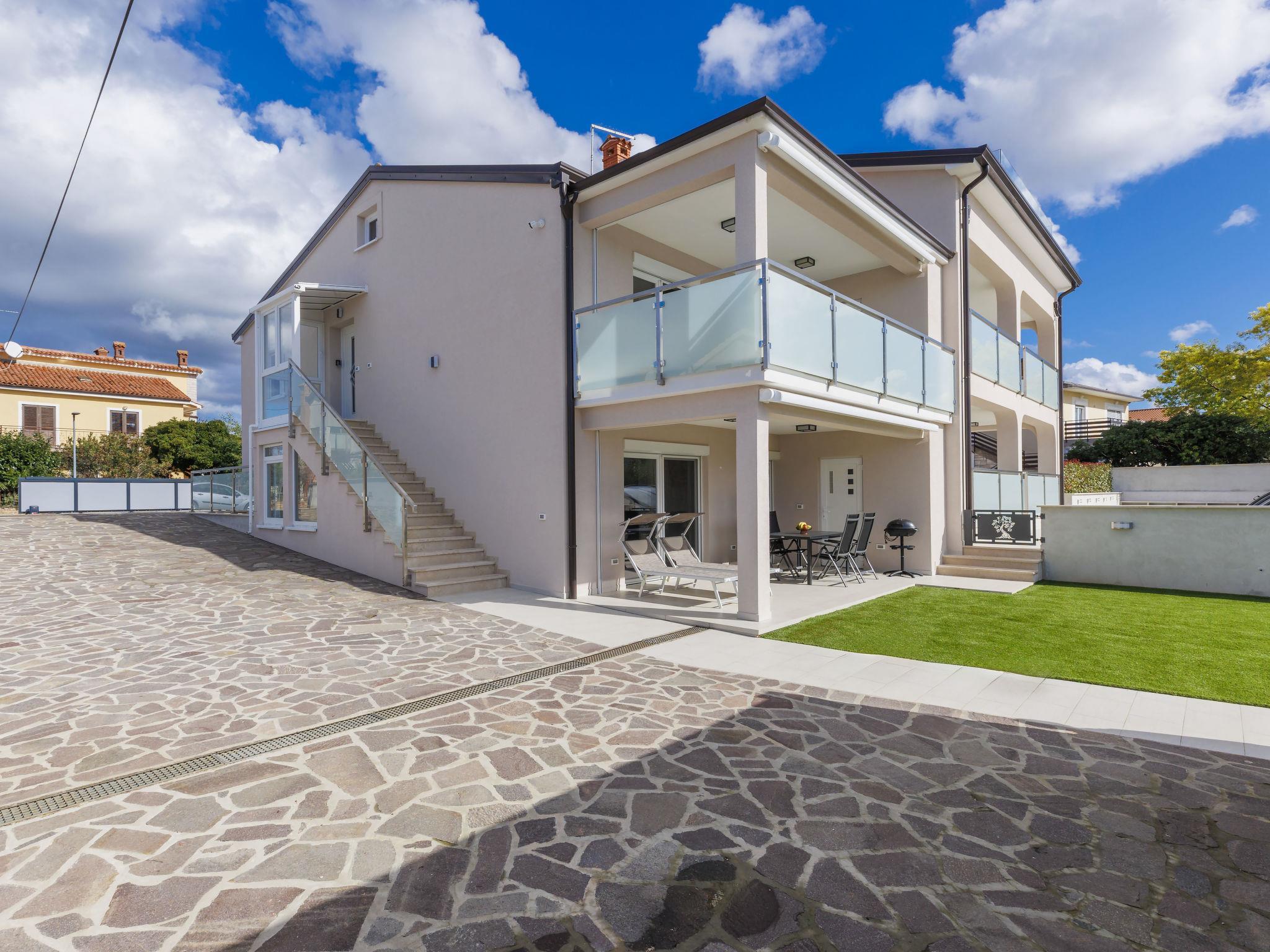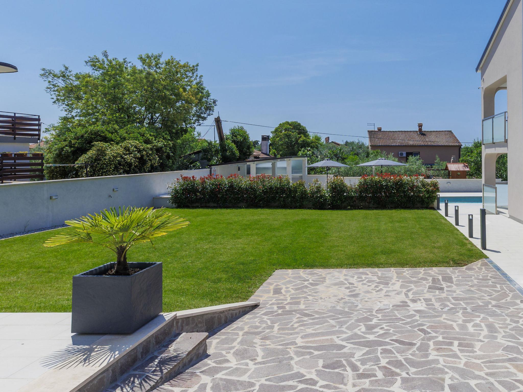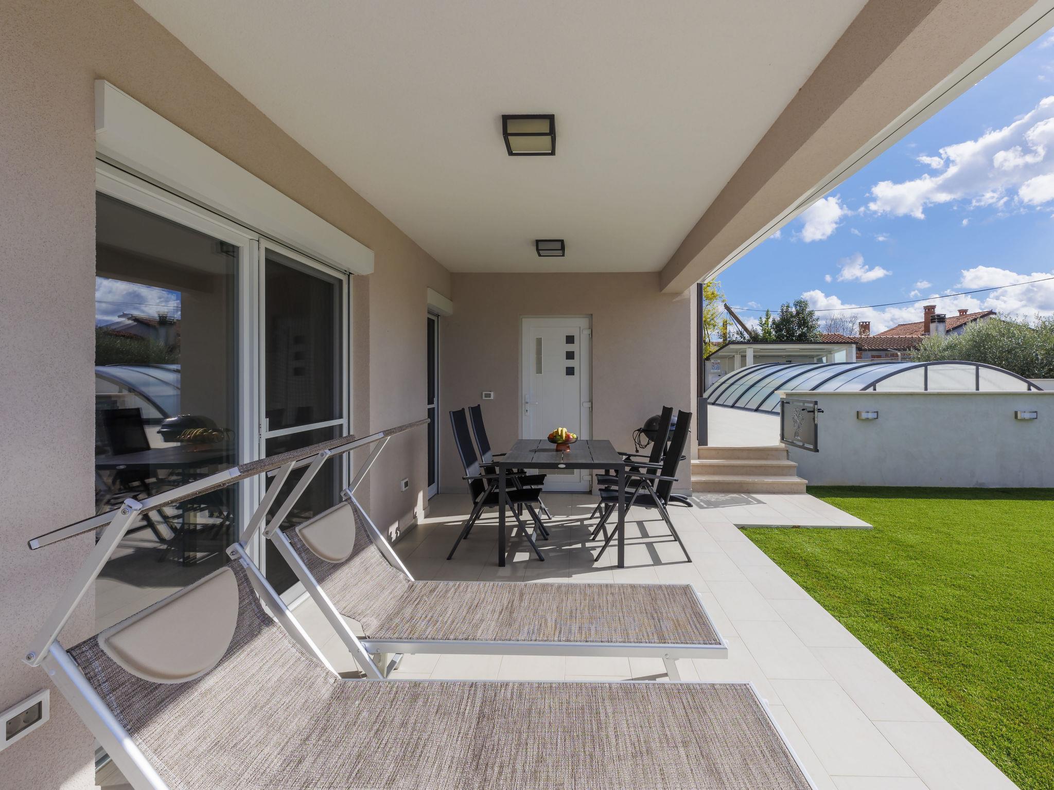 Murine 3 km from Umag: Apartment house "Villa Galici", built in 2022. In the hamlet Galici 1 km from the centre of Murine, in a sunny position, 2.5 km from the sea, 2.5 km from the beach. For shared use: property 1'000 m2 with lawn, swimming pool angular heated (10 x 5 m, depth 150 cm, seasonal availability: 01.Jan. - 31.Dec.) with internal staircase and shutter cover. Outdoor shower. In the house: internet access, table football. Parking at the house on the premises. Shop 1.5 km, restaurant 800 m, bus stop 4.1 km, pebble beach 2.5 km, rocky beach 2.5 km. Walking paths from the house 100 m, cycle lane 150 m. The owner does not accept any youth groups.