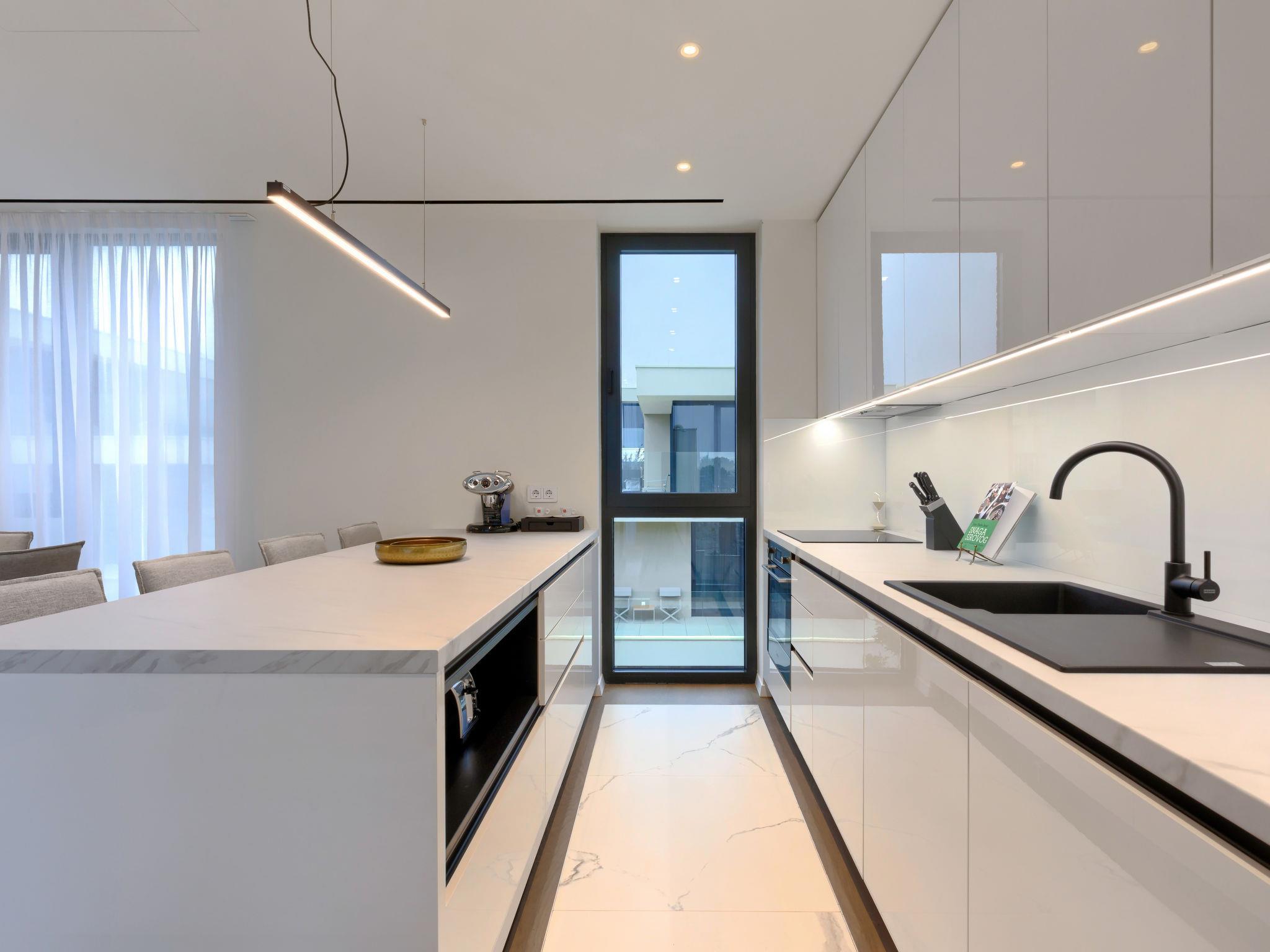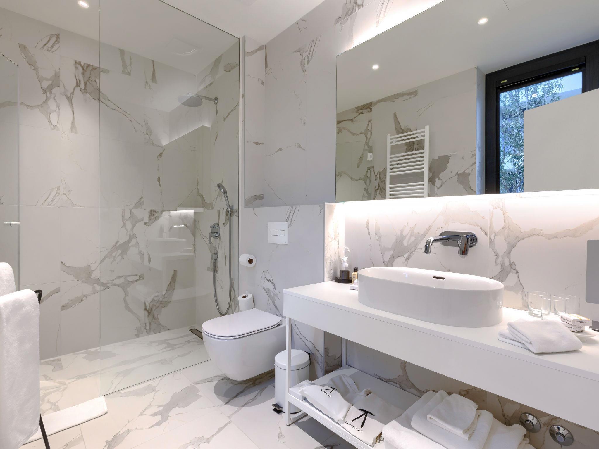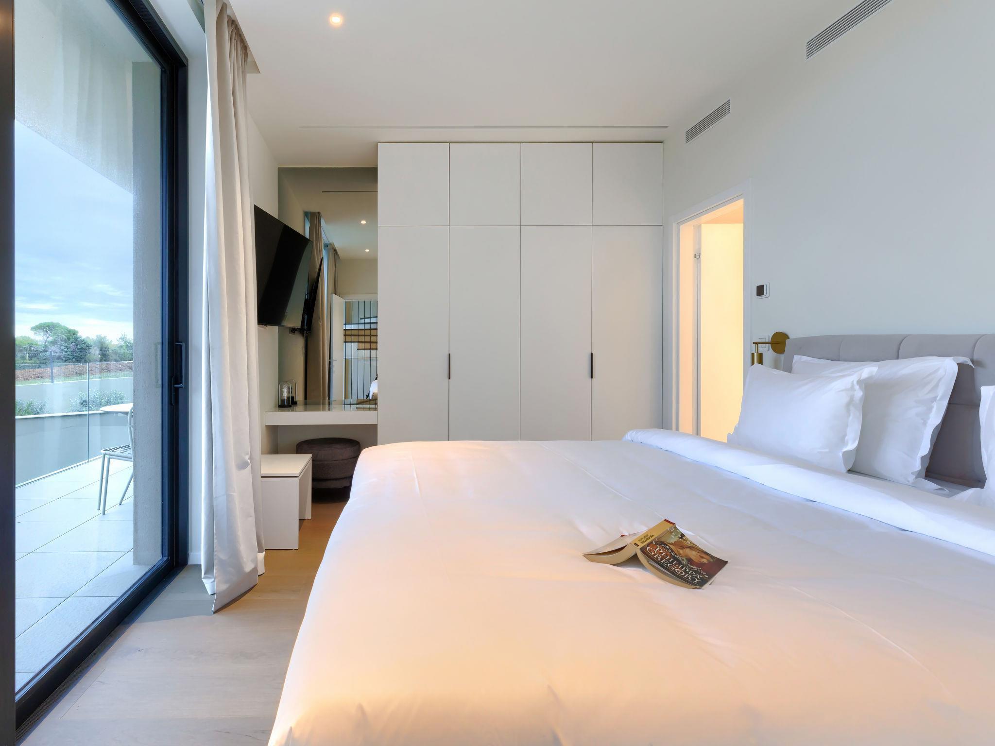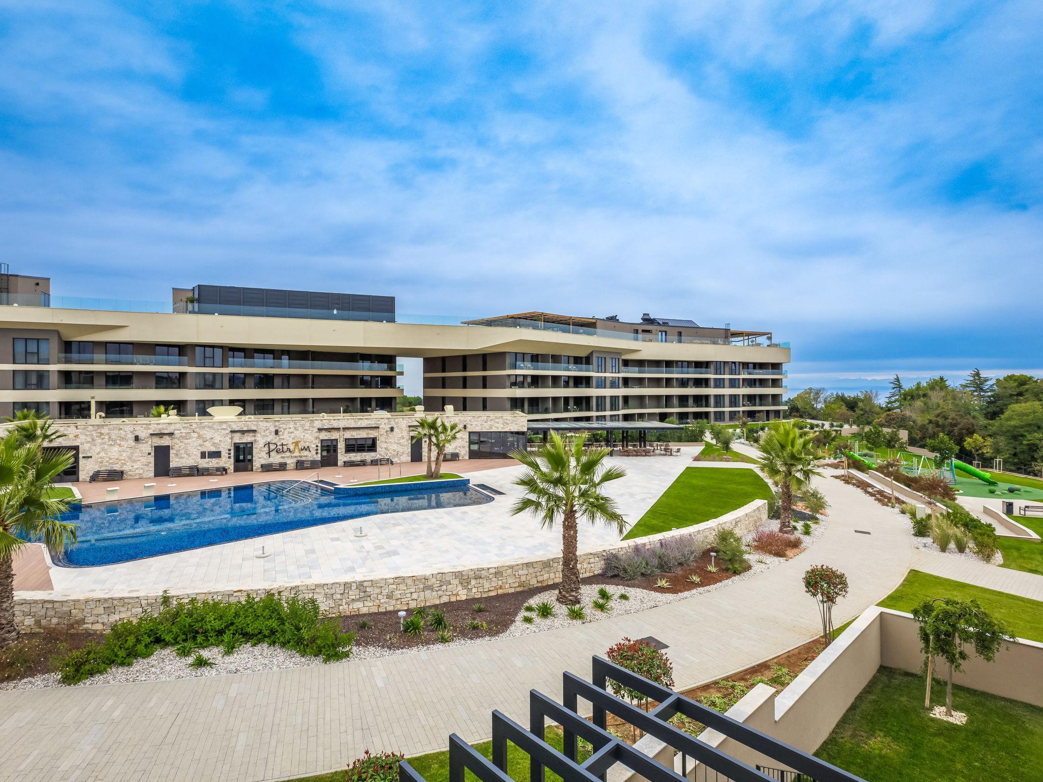 Semi-detached house "Semi-detached Villas Crveni vrh", built in 2023. 1.5 km from the centre of Savudrija, 10 km from the centre of Umag, in a quiet position on a slope, residential area (villas), 500 m from the sea. For shared use: property with lawn, 2 swimming pools, indoor pool (105 m diameter, depth 50 - 140 cm, seasonal availability: 01.Jan. - 31.Dec.) with internal staircase. Unconventional pool shape. Shower/WC in the pool area, children's pool, tennis (extra), children's playground. Private: property (fenced). In the complex: reception, restaurant, bar, bistro, internet access, sauna, fitness room, massage (extra). Hot tub, relaxation room, spa area, playroom, shopping facilities, lift, sun terrace. Parking at the house on the premises. E-charging station. Shop 1 km, supermarket 10 km, bus stop 8 km, railway station 33 km, sandy beach 5 km pebble beach 2 km, rocky beach 500 m. Golf course (18 hole) 2 km, tennis 500 m, walking paths from the house 100 m. Please note: 24hr guard. The photograph shows a typical example. Neighbourhood highly sensitive to noise. Quietness and good behaviour expected.