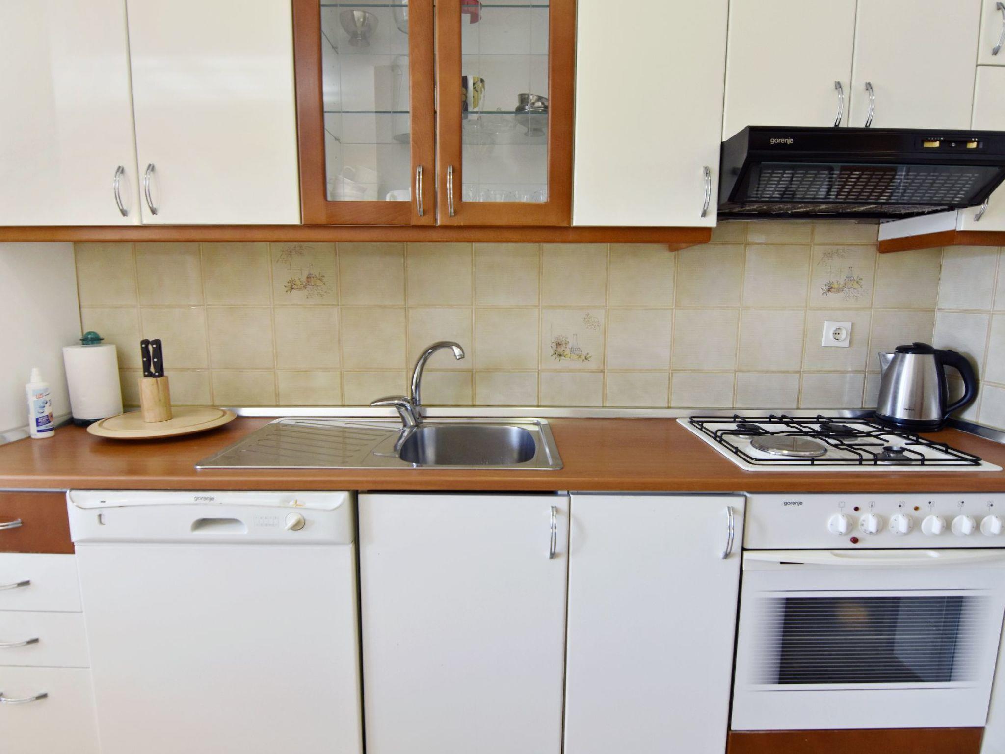 The apartment has a bedroom with a double bed 160x200, two bedside tables with night lamps, cabinet with mirror, wardrobe, the second bedroom with two single beds 80x200, wardrobe, bedside table with lamp, bed linen is provided (changed weekly) , the bathroom with bathtub, bidet, washing machine, sink with cabinet and mirror, two bath towels per person are provided (changed weekly). The living area with equipped kitchenette, refrigerator with freezer area, coffee machine, kettle, dishwasher, oven, stove with three gas burners and an electric hob, extractor hood, kitchen utensils. The dining corner with dining table and 5 chairs, the living corner with sofa bed, kitchen cabinet, flat-screen satellite TV, free Wi-fi internet connection, air conditioner, exit to the terrace. The terrace furnished with table and chairs, portable barbecue for shared use available. Free private parking near the house.
