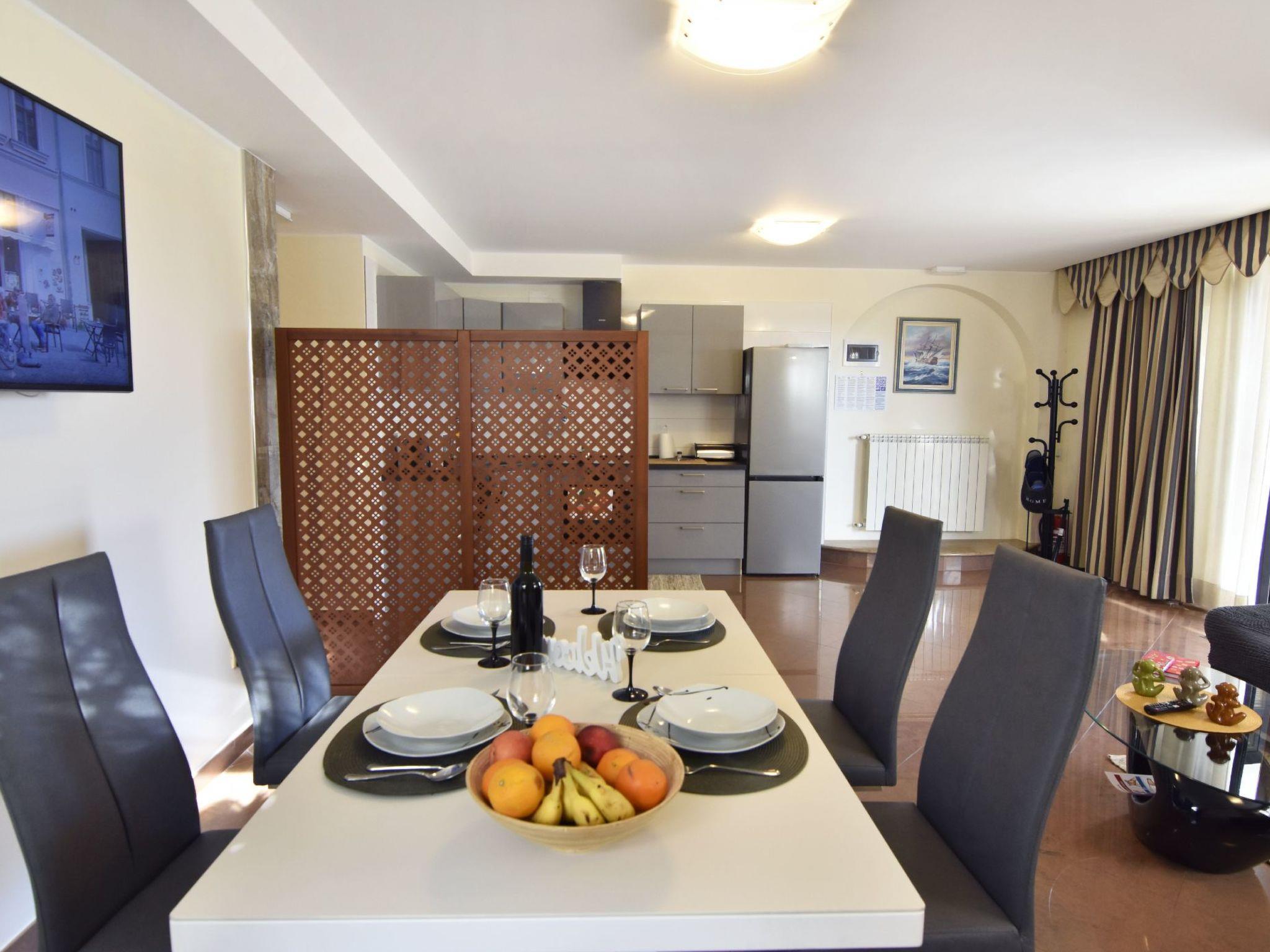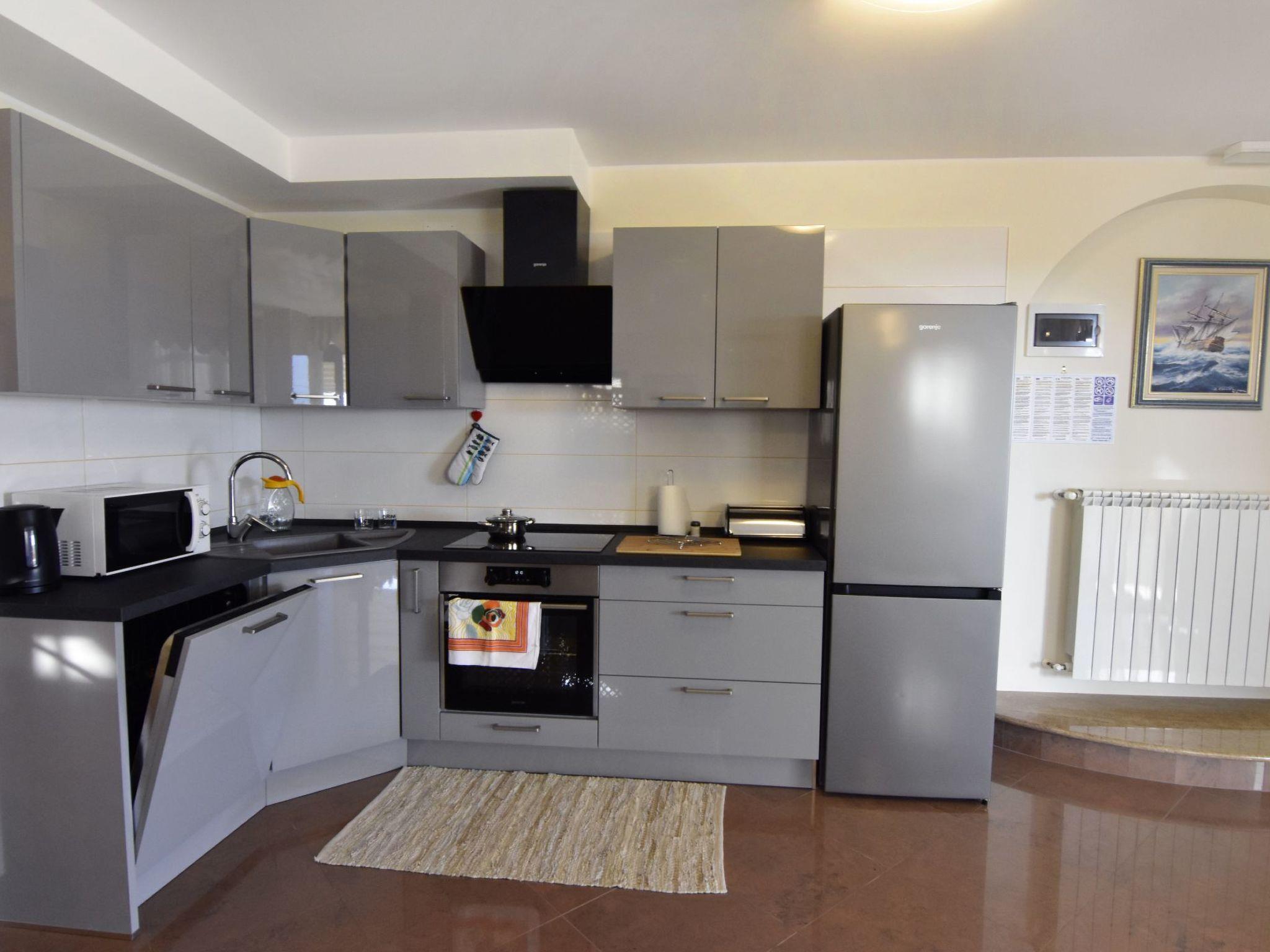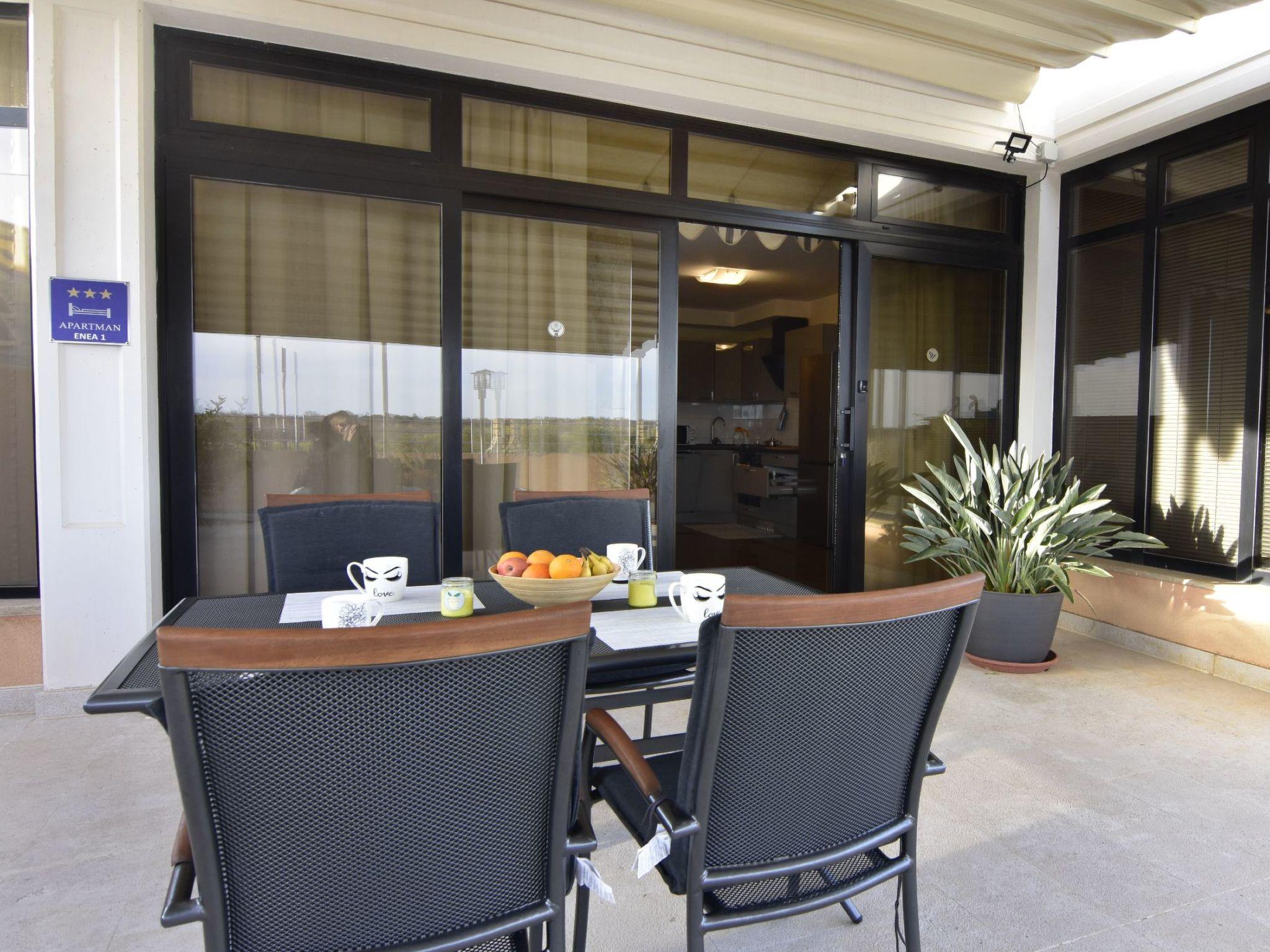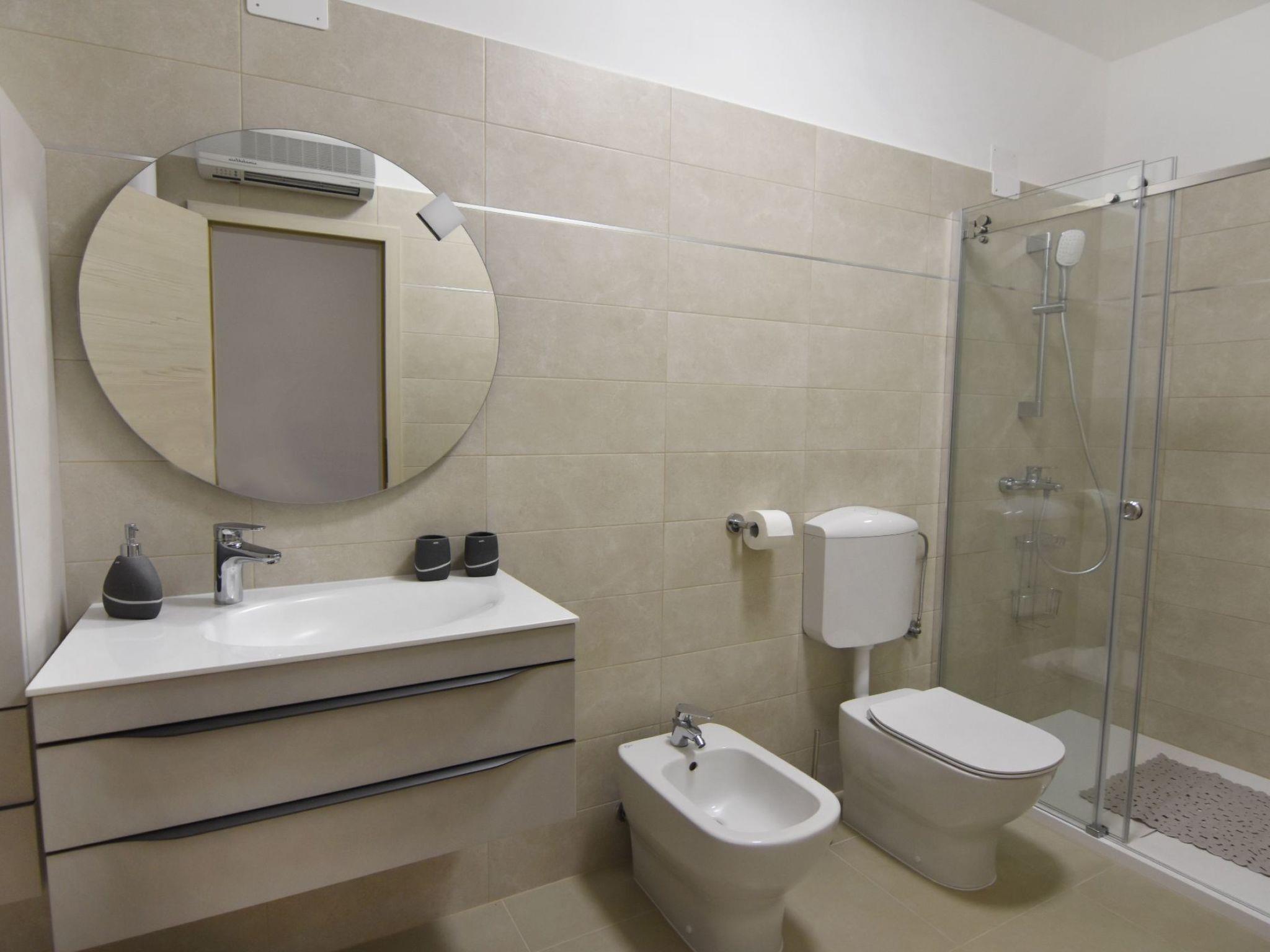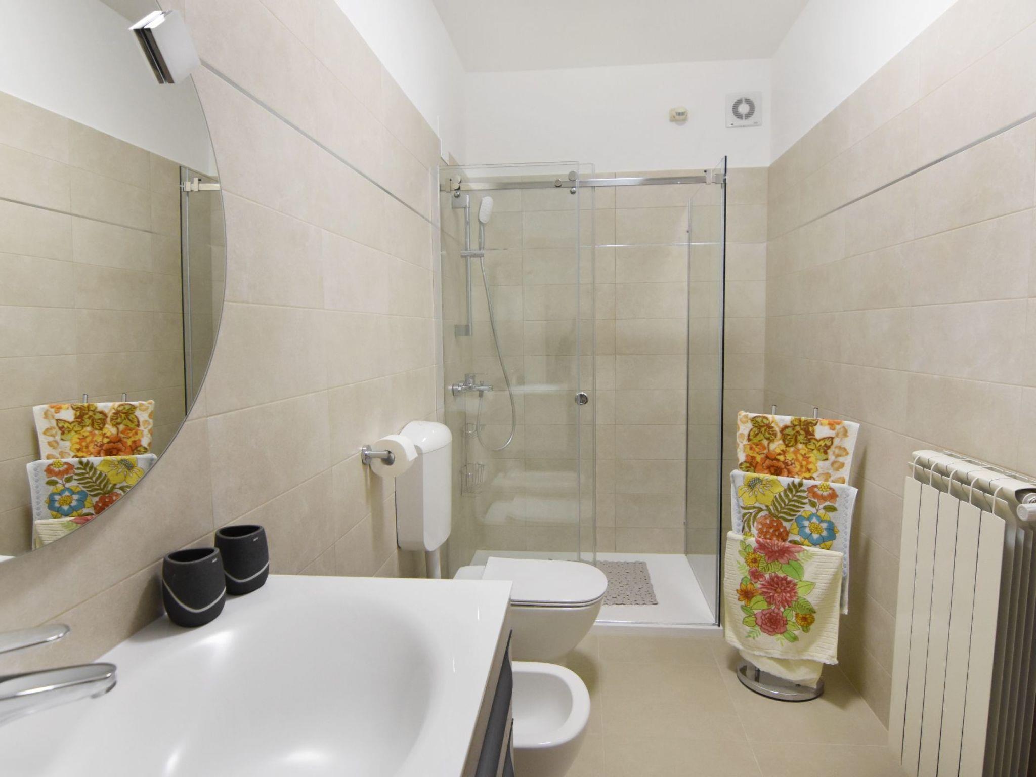 The new and comfortable flat is located on the ground floor of the house with a large private covered terrace with table and chairs at the entrance.the kitchen is modern and equipped with fridge with freezer compartment, dishwasher, ceramic hob with 4 hotplates, extractor bonnet, oven, microwave, coffee maker, kettle, toaster, crockery, cutlery, kitchen utensils. The bathroom with shower, washbasin with mirror and vanity unit, bidet, towels is provided two per person.the flat offers a bedroom with double bed (180x200), bedside tables and night lamps, large wardrobe. The living area has a dining table with 4 chairs, a flat screen satellite TV, a coffee table, a sofa bed for two people, air conditioning and a free Wi-Fi internet connection.