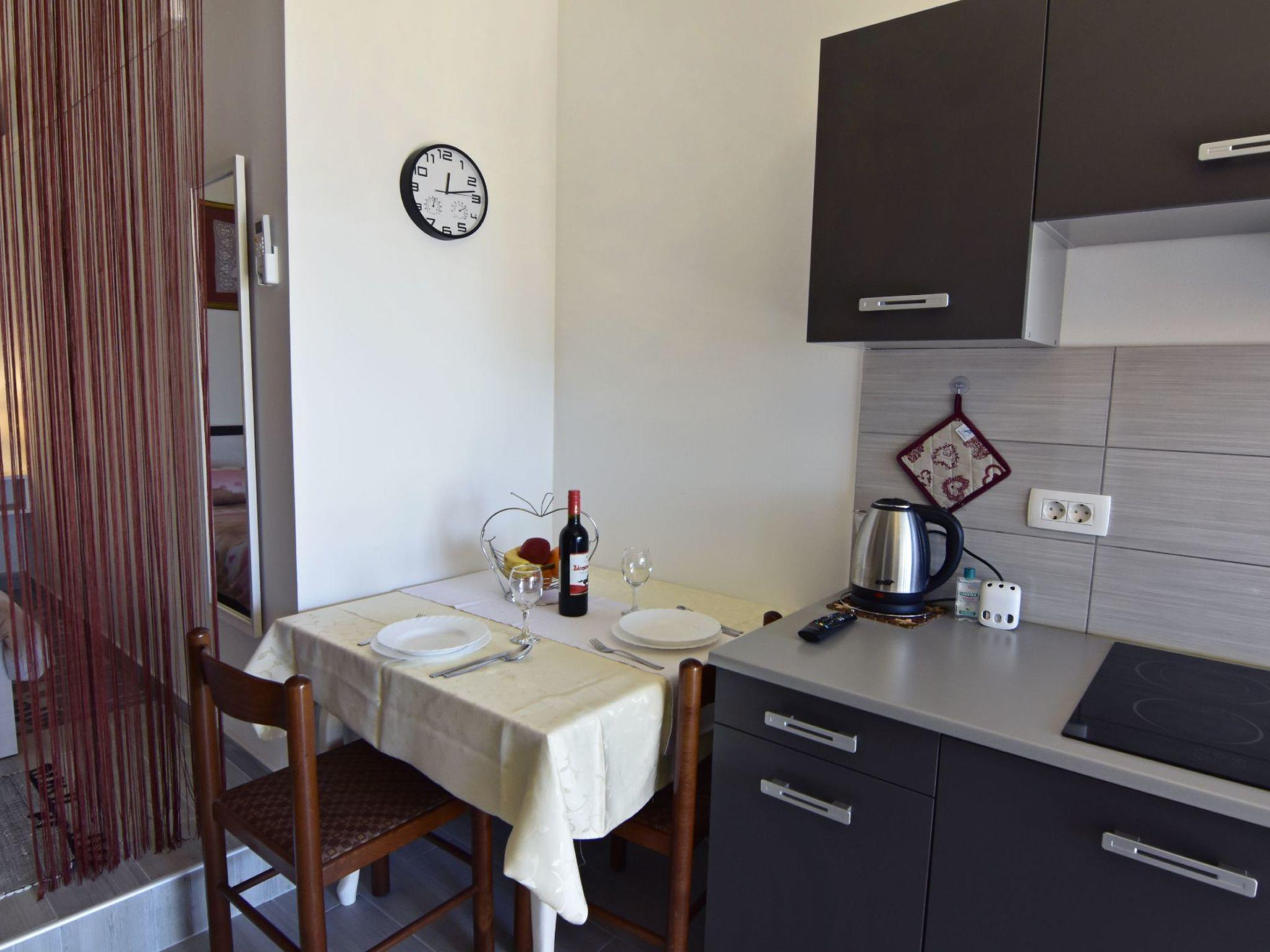The studio apartment has a private terrace with table and benches at the entrance, a kitchen equipped with two electric cooking points, a kettle, a fridge, a dining table and chairs. The sleeping area has a double bed, bed linen is provided, wardrobe, air conditioner, flat screen satellite TV. The bathroom with shower, sink with mirror, toilet, towels for the bathroom are provided.