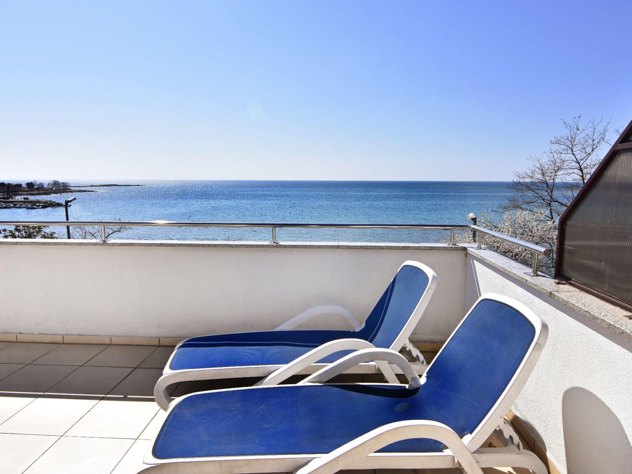 Apartment 2 on the second floor has a bedroom with a double bed, bedside tables and wardrobe with exit to the terrace with sea view, bathroom with shower, sink and toilet, kitchen with a stove, refrigerator, dining table and 4 chairs, a sofa bed for two people, coffee table, air conditioning and flat-screen satellite TV. Exit to the magnificent spacious sea view terrace equipped with deck chairs, table and benches is ideal for breakfast or enjoying a glass of Istrian wine in the evening while admiring the sunset