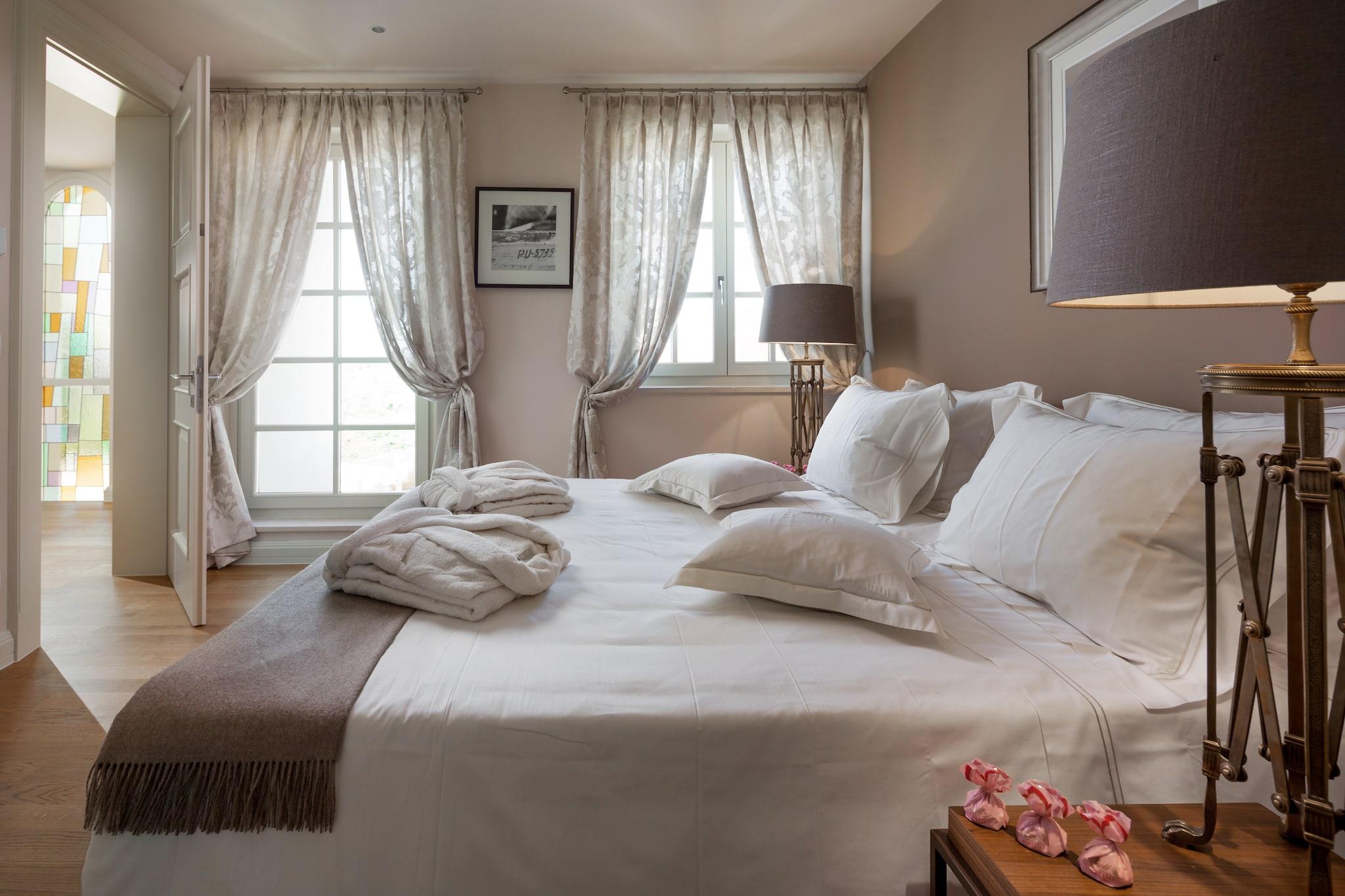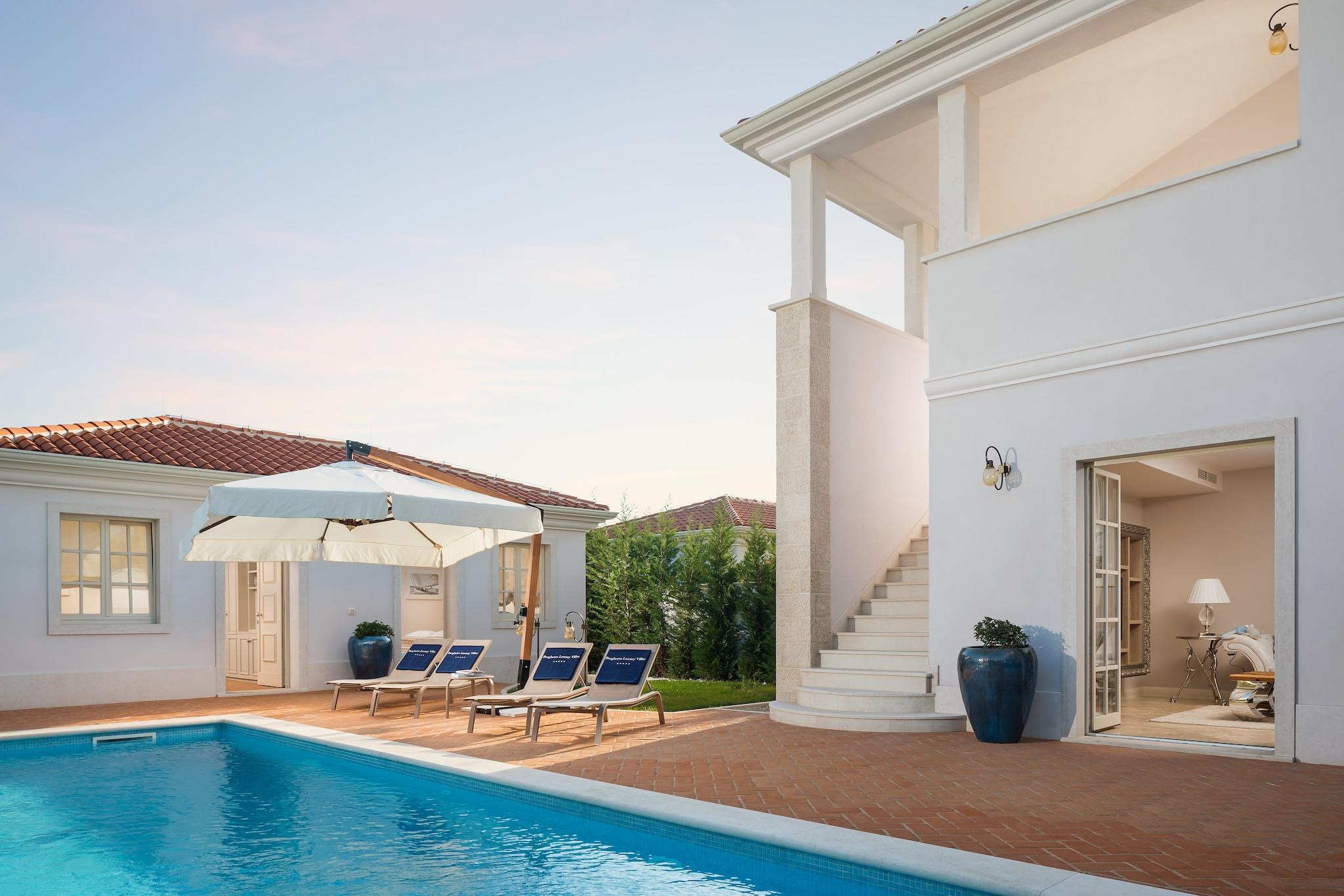 Villa Bianca er designet til at rumme op til 8 personer i 4 soveværelser hver med eget badeværelse. På stueetagen strækker en komfortabel stue med udstyret køkken, stort spisebord og sidde sæt. Rummet er indrettet med kunst fra berømte kroatiske kunstnere, og der er også SatTv, trådløst internet og aircondition på alle områder. Fra stuen er der udsigt og adgang til pool og have, og på siden er der grill og grillplads med bord og stole. To værelser, hver med separat indgang, en dobbeltseng og et privat badeværelse er placeret i udvidelsen af huset. En trappe fører til første sal i villaen, med to komfortable soveværelser, hver med privat bad har et soveværelse adgang til en stor balkon med trapper, der fører til poolen. Eksklusiv Villa Bianca er indrettet i en meget elegant tidløs klassisk stil og giver dig fornøjelsen af privatliv og komfort til din drømmeferie! For at være tryg med os, Vi arrangerer udflugter, besøg på berømte vingårde eller fremragende restauranter. Gratis adgangskort til hotelkomplekset Lanterna, hvor sandstrande og børns underholdning er. Gæsterne får Iremandia Water Park-gavepakken!