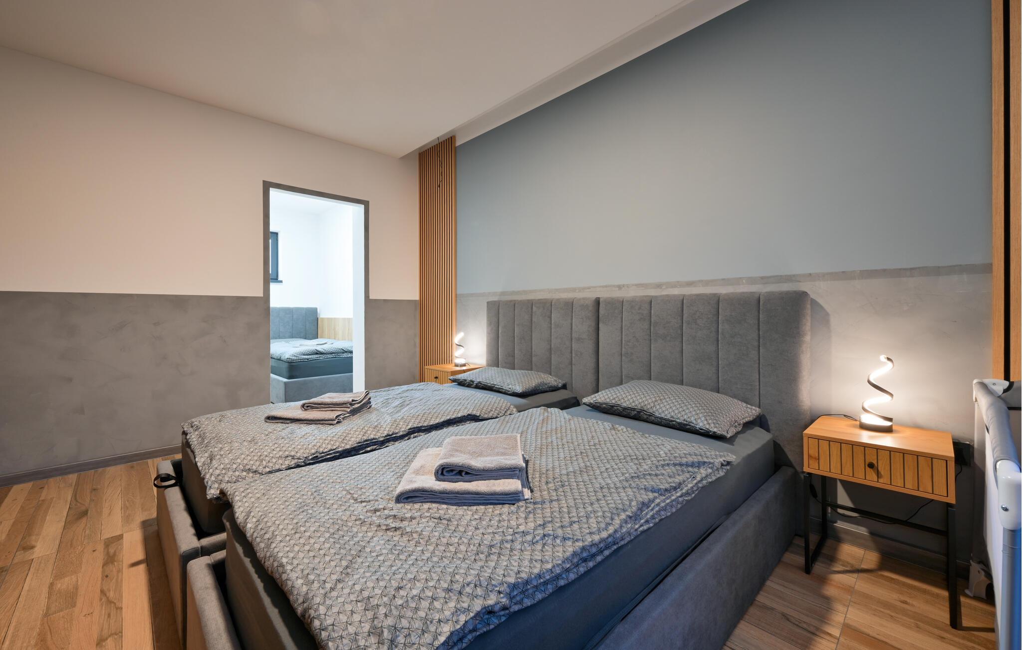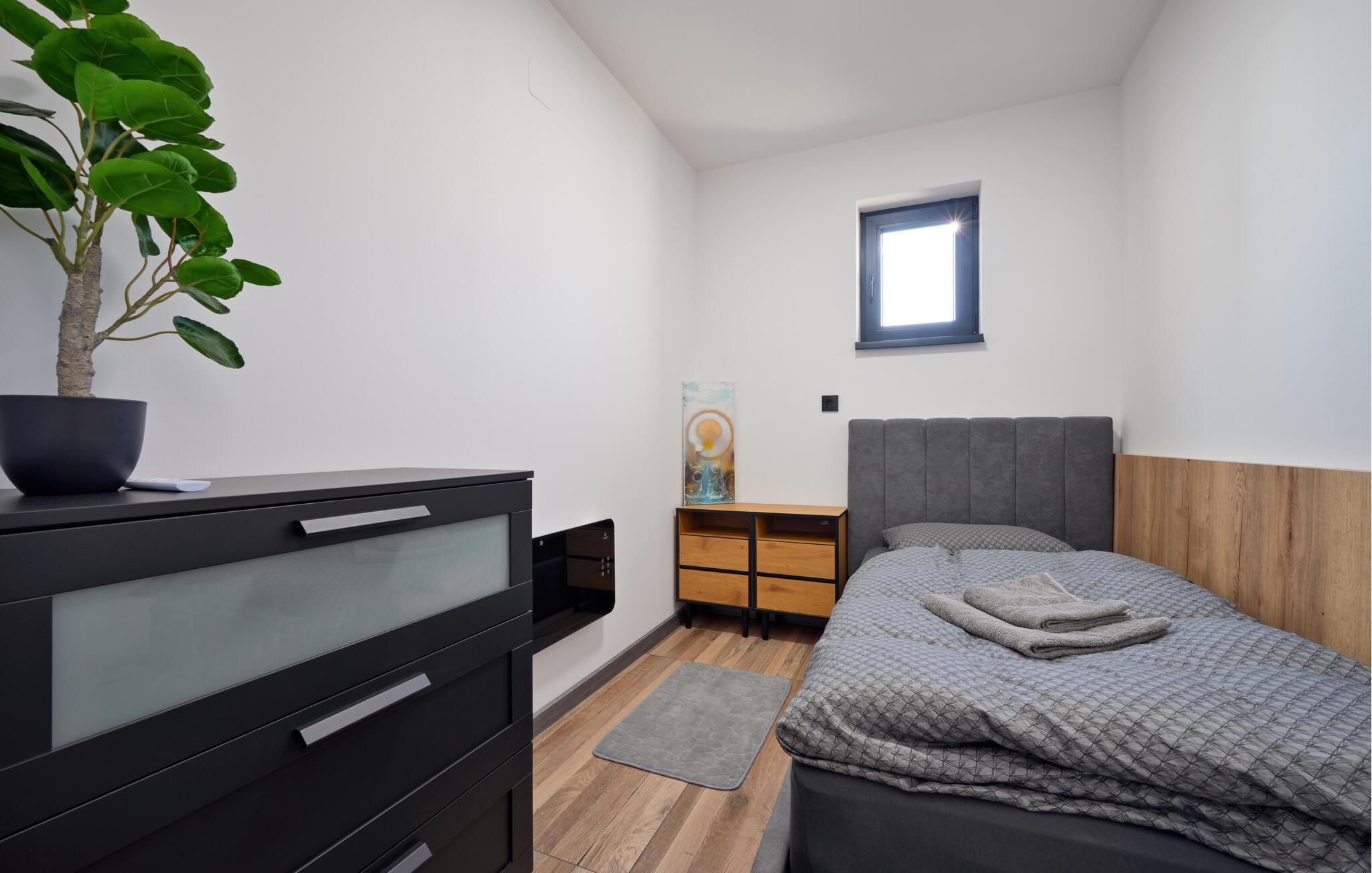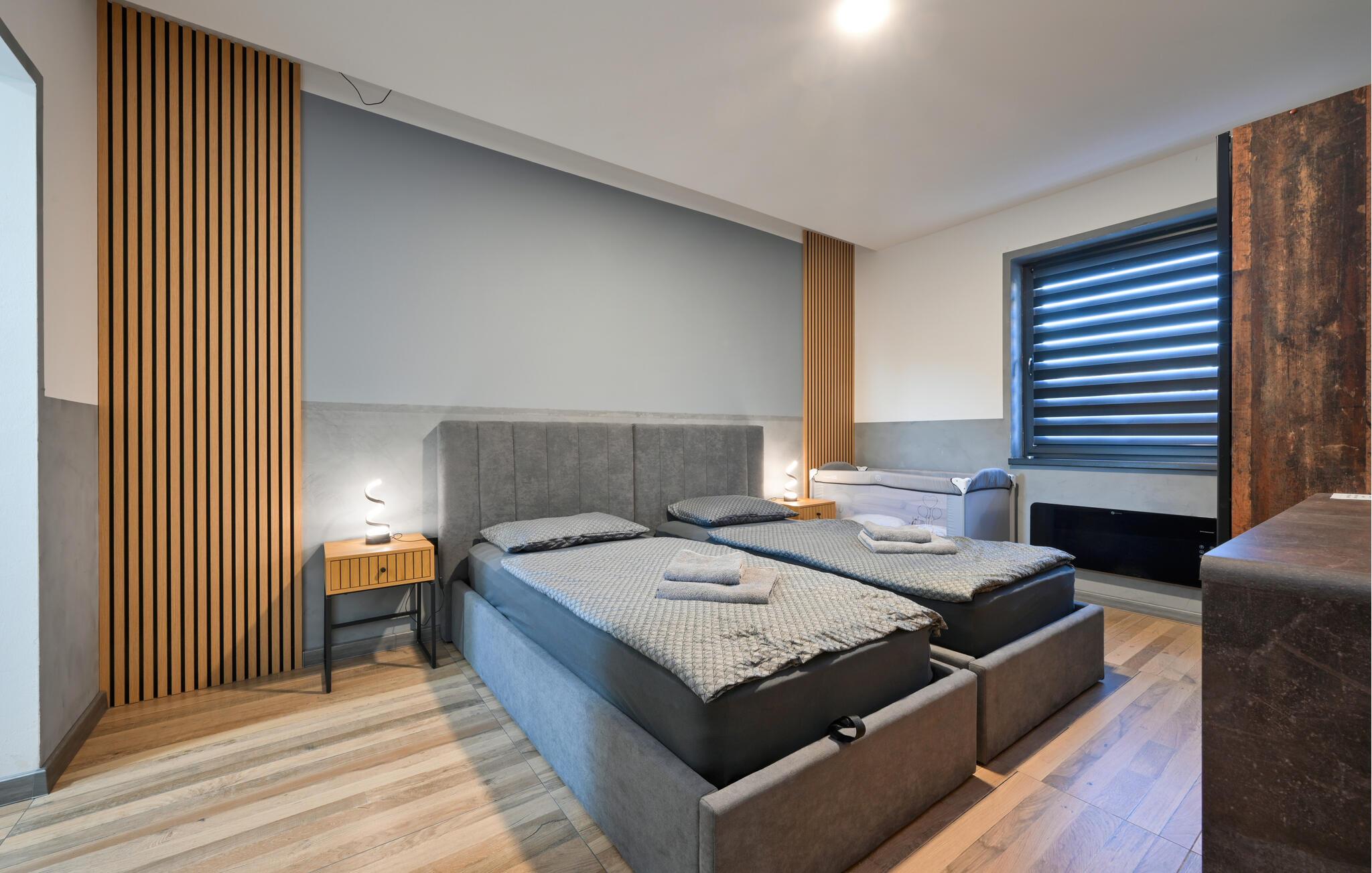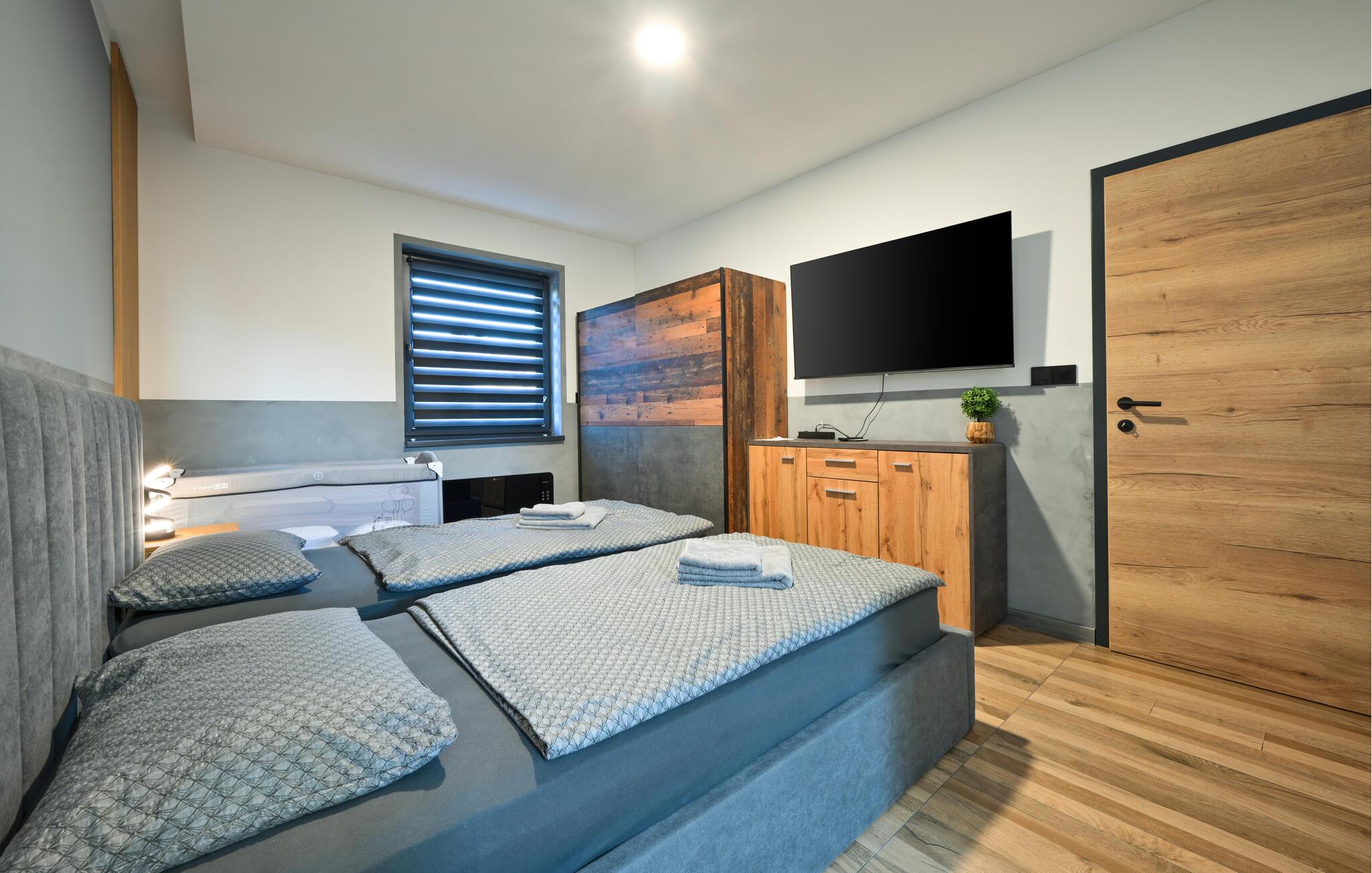 Tilbring en afslappende ferie i dette moderne feriehus med pool og spabad. Dette hus kombinerer harmonisk hygge og komfort. Diskrete farver, smukke træfinisher og en behagelig sofa vil få jer til at føle jer hjemme. Stream jeres yndlingsprogrammer, nyd en sjov eftermiddag med spil, eller lav et lækkert måltid sammen i det moderne køkken. Gå udenfor med jeres morgenkaffe og nyd den behagelige atmosfære. Tag en dukkert i poolen eller spil vandpolo med børnene. Slap af med en kølig drink på en liggestol, inden I afslutter dagen med en grillfest. Nyd den landlige ro i Sracinec, og hvis I leder efter lidt urban stemning, kan I besøge Varaždin med dens barokke gamle bydel, slot og charmerende gadecaféer. Gå en tur gennem de velholdte parker og langs Drava-floden, perfekt til afslappende eftermiddage ved vandet. Tag korte cykelture og prøv lokale specialiteter.