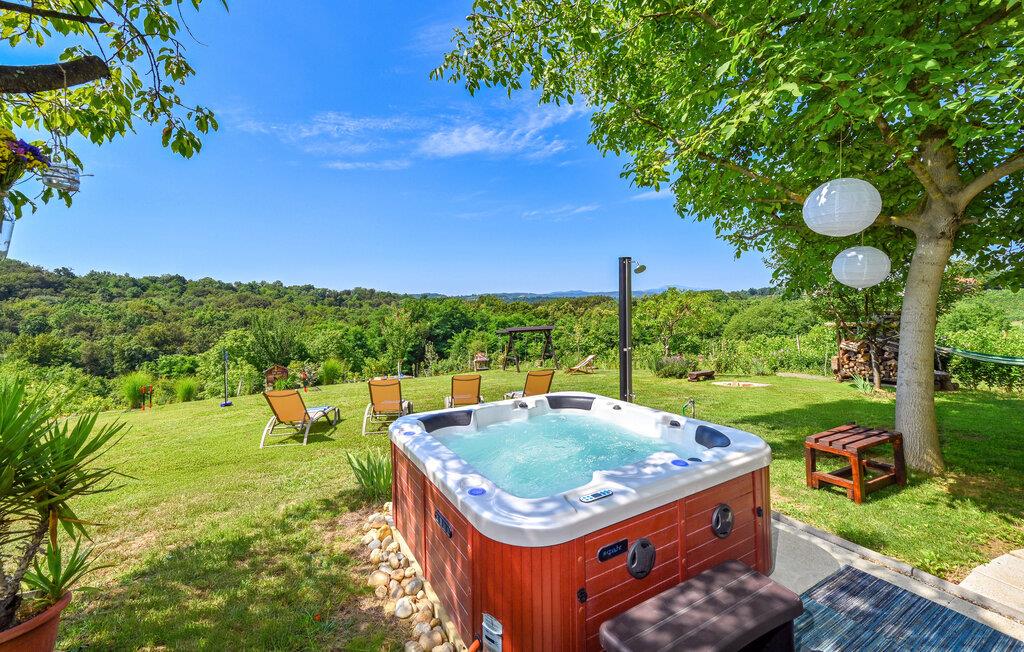 Dette feriehus med udendørs jacuzzi ligger på en smuk bakke med betagende udsigt.