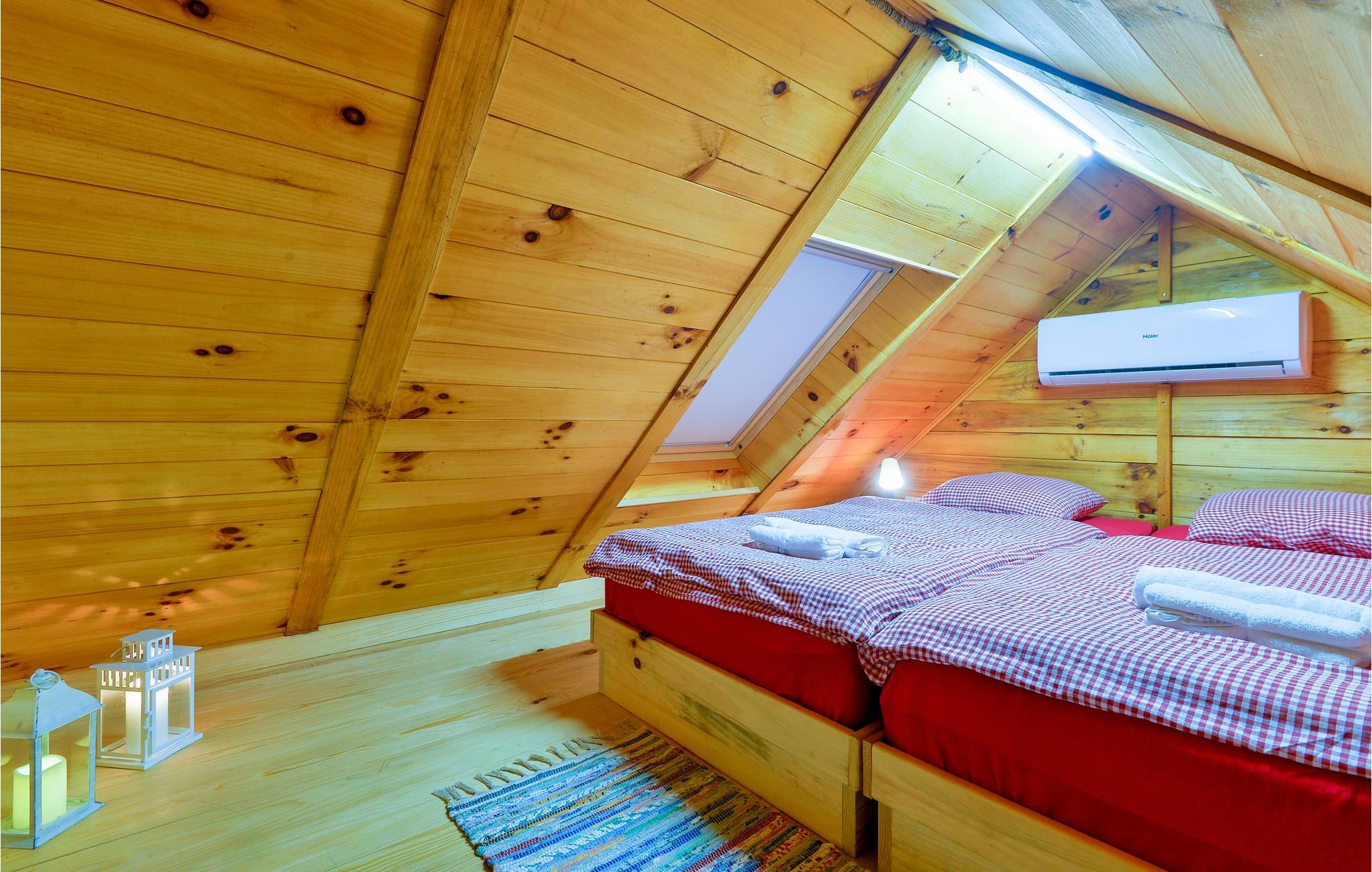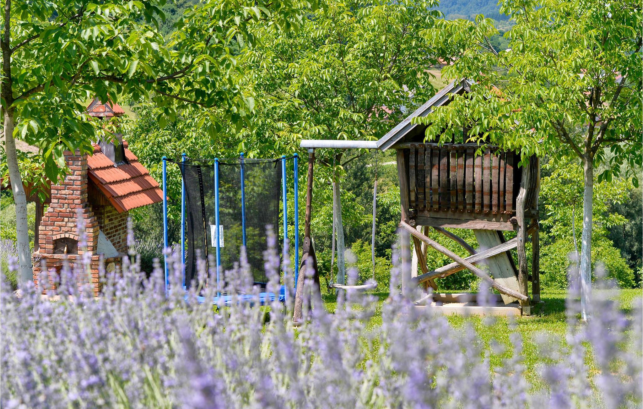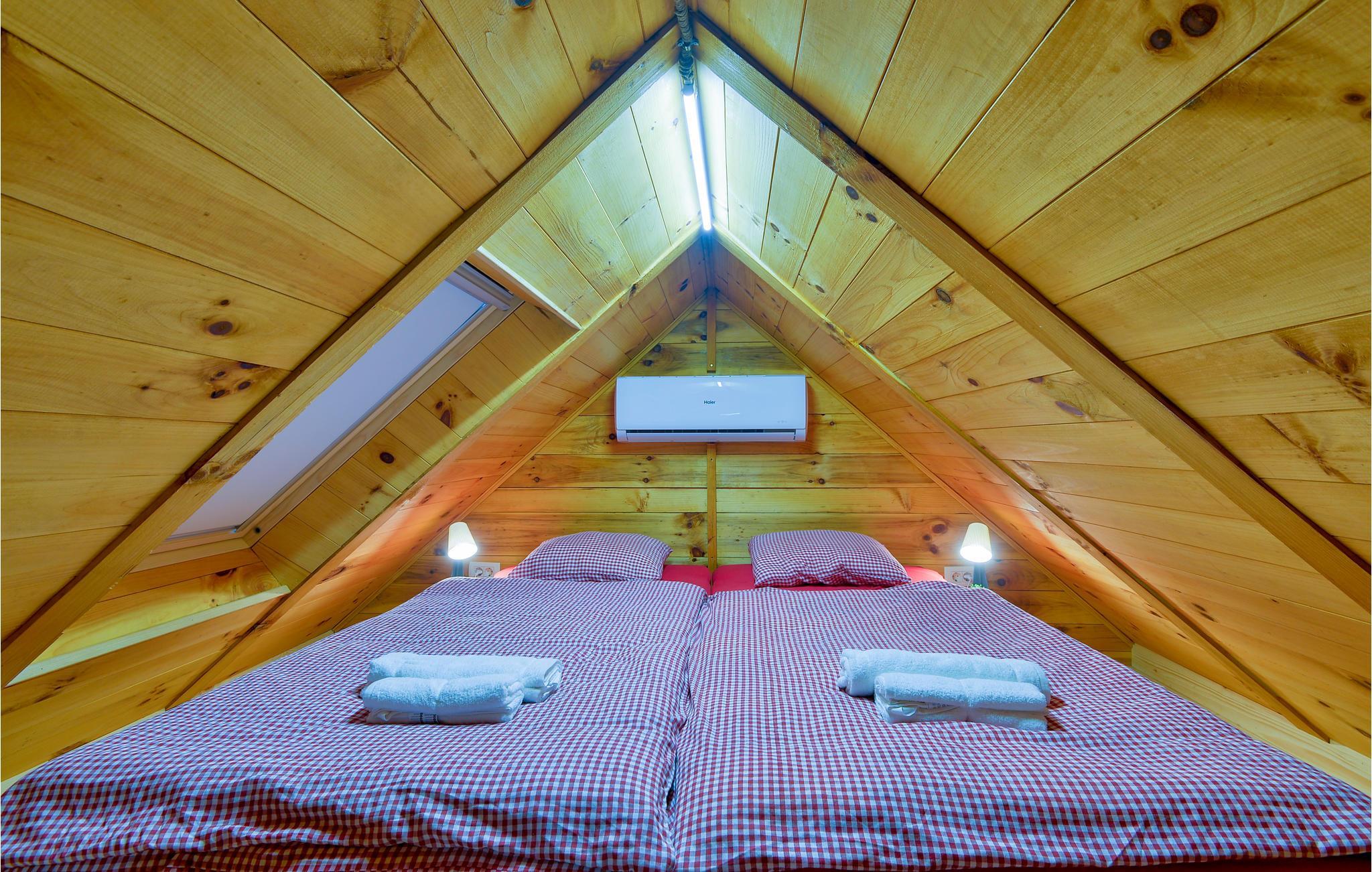 Dette charmerende feriehus ligger i nærheden af Lepoglav og ligger på en stor, grøn grund i dejligt rolige omgivelser, langt væk fra den travle by. For enden af grunden er der en lille dam, hvor I kan fiske efter aftale med ejer – i søen er der arter som karperne græskarpe og sølvkarpe. Huset er af træ og i to etager: stueplan med køkken og stue i et og badeværelse og på første sal to soveværelser. Det ene soveværelse er gennemgangsrum og her er skrå vægge ned til 10 cm i siden. Nyd at sidde på den overdækkede terrasse og nyd udsigten over de grønne omgivelser. Ved siden af huset ligger jeres pool, som er behandlet med elektrolyse på en miljøvenlig måde. I frugthaven kan I plukke alt det, der er spisemodent.