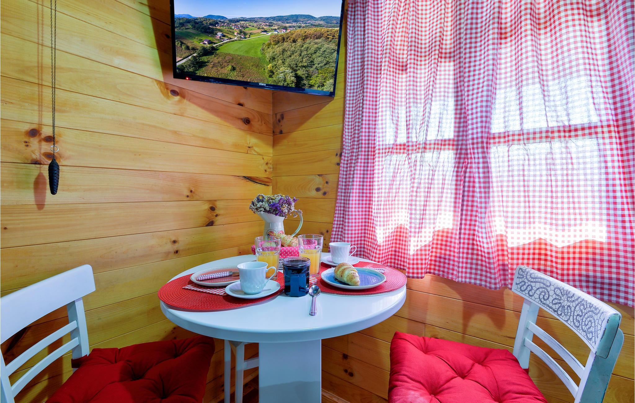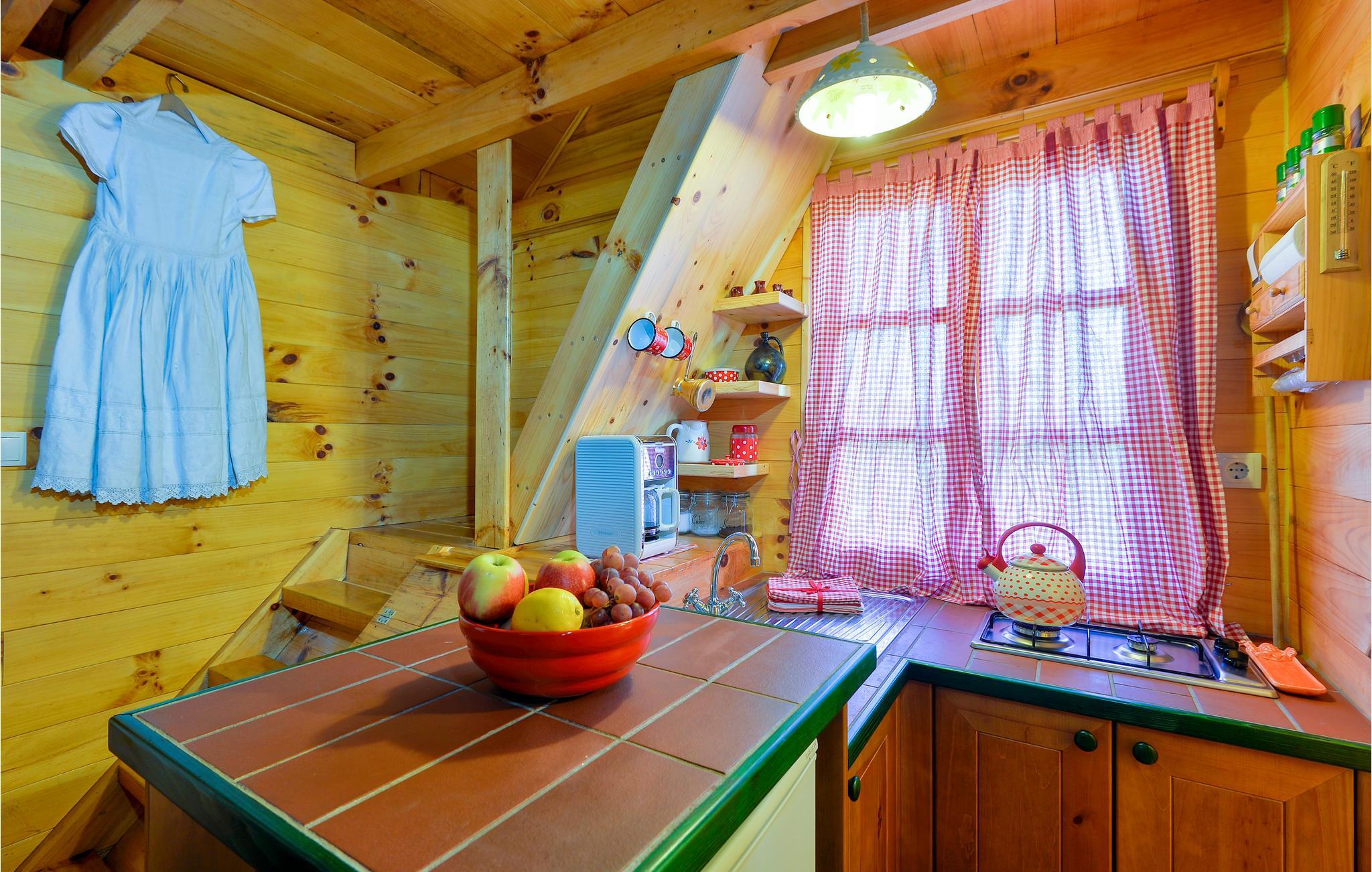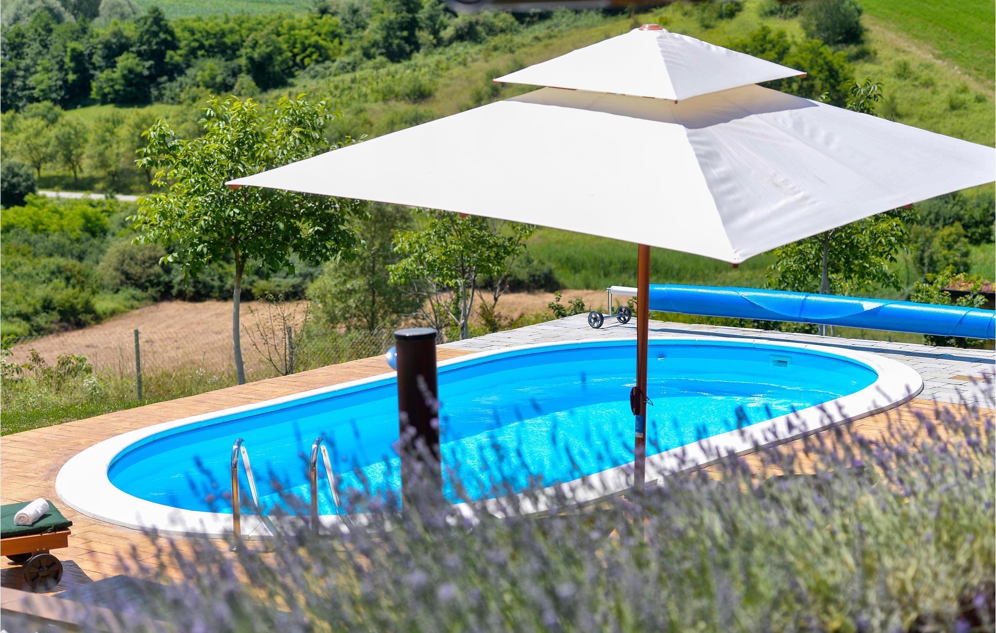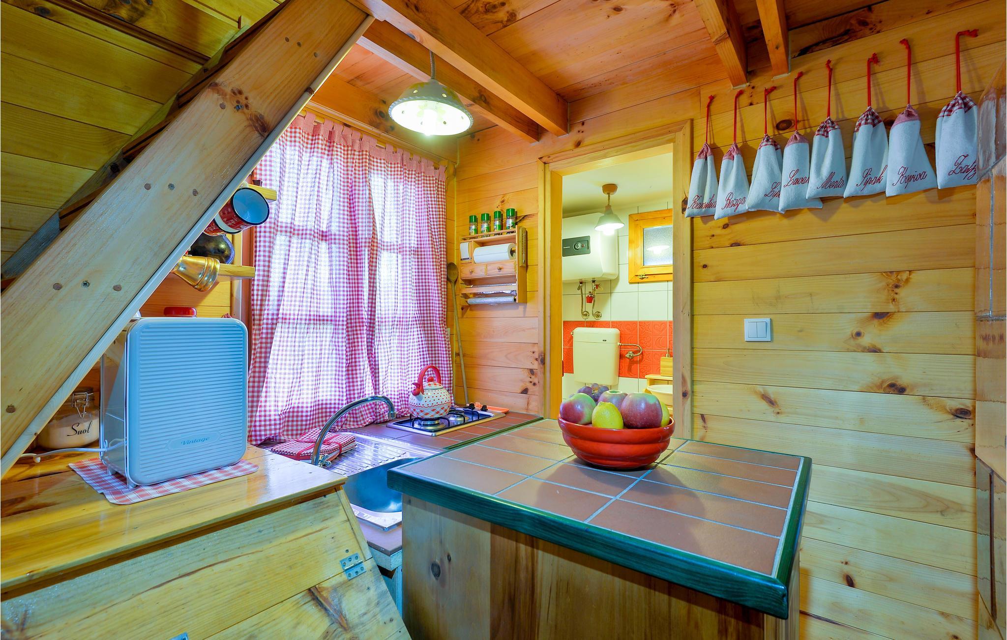 Dette charmerende feriehus ligger i nærheden af Lepoglav og ligger på en stor, grøn grund i dejligt rolige omgivelser, langt væk fra den travle by. For enden af grunden er der en lille dam, hvor I kan fiske efter aftale med ejer – i søen er der arter som karperne græskarpe og sølvkarpe. Huset er af træ og i to etager: stueplan med køkken og stue i et og badeværelse og på første sal to soveværelser. Det ene soveværelse er gennemgangsrum og her er skrå vægge ned til 10 cm i siden. Nyd at sidde på den overdækkede terrasse og nyd udsigten over de grønne omgivelser. Ved siden af huset ligger jeres pool, som er behandlet med elektrolyse på en miljøvenlig måde. I frugthaven kan I plukke alt det, der er spisemodent.