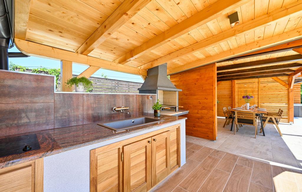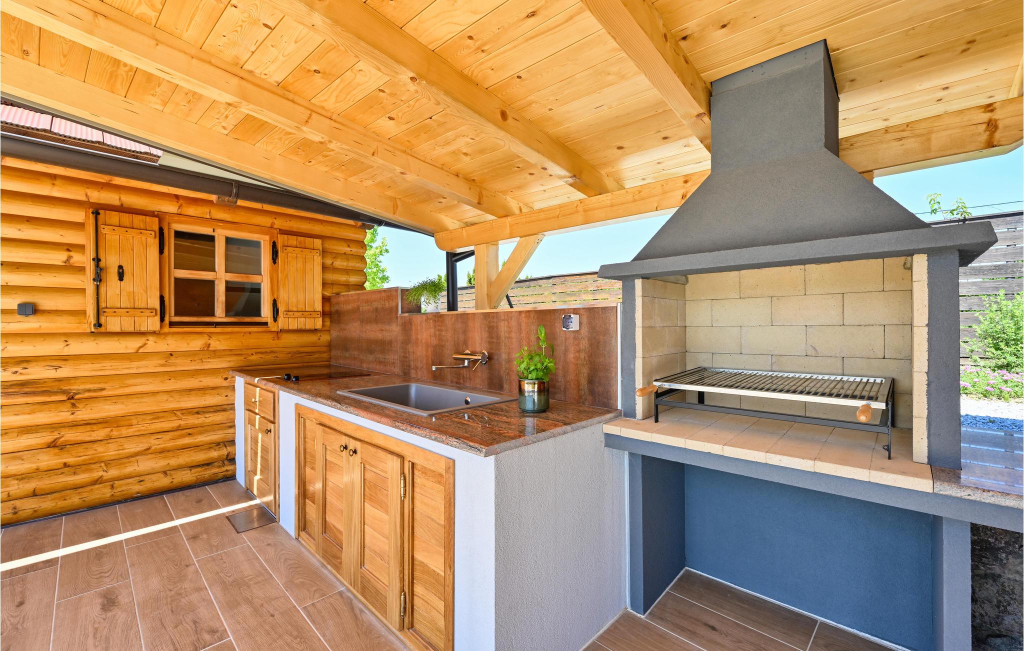 Velkommen til dette feriehus, der udstråler ren ferieidyl! Til huset hører et skønt udendørsområde med en opvarmet udendørspool, hvor I kan køle af og plaske rundt i timevis på varme sommerdage. Spabadet og saunaen indbyder til rendyrket ferieafslapning. Fra huset kan I nyde en vidunderlig udsigt over de omkringliggende grønne bakker. Haven byder på forskellige underholdningsmuligheder for både børn og voksne. Ved siden af poolen er der en overdækket terrasse, hvor I kan tilberede lækre feriemåltider i sommerkøkkenet.