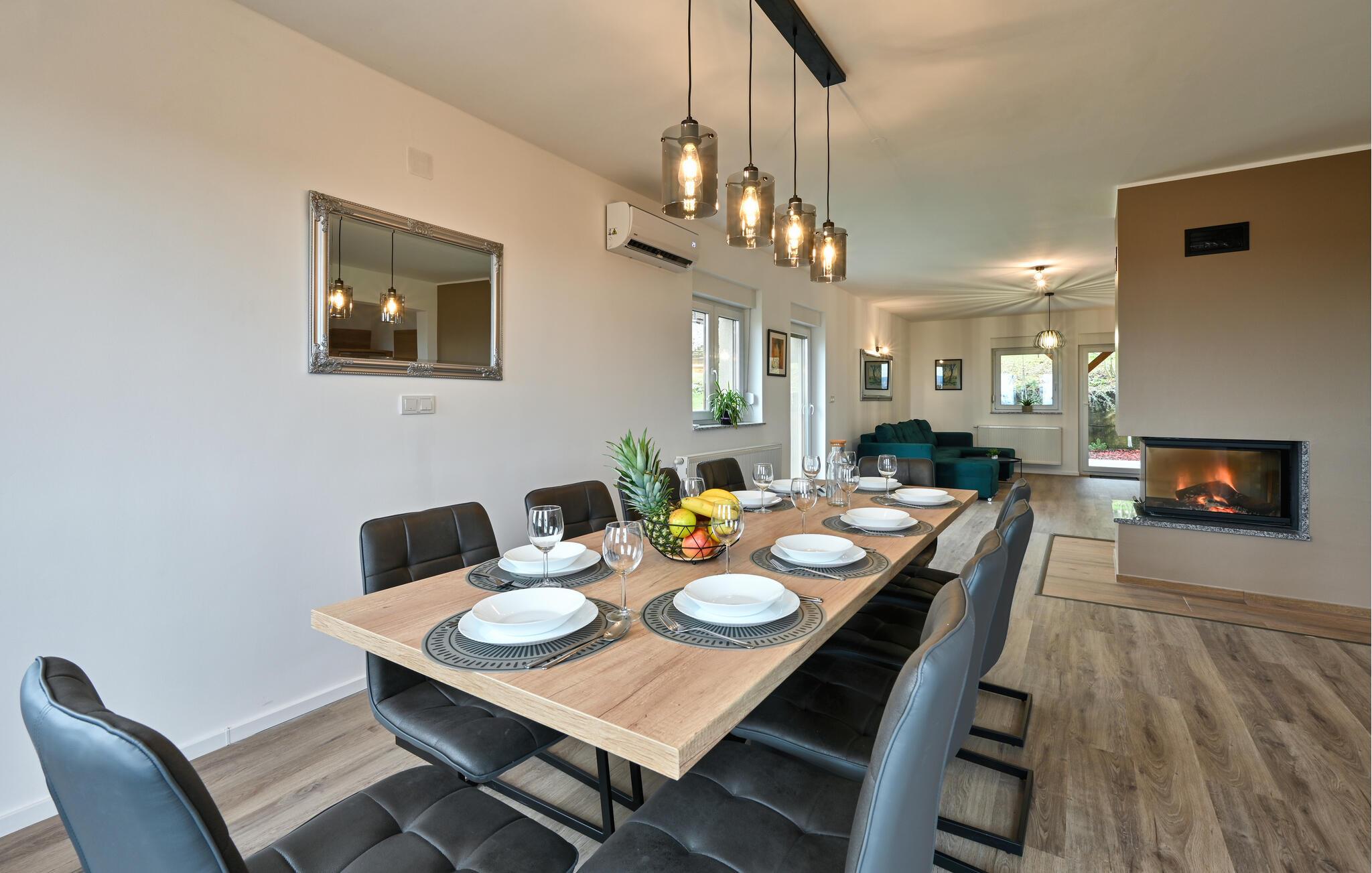 Dette komfortable feriehus giver jer mulighed for at tilbringe en afslappende ferie med familie eller venner. Lav mad sammen i det åbne, veludstyrede køkken og nyd jeres måltider i store grupper ved det indbydende spisebord. På køligere aftener kan I tænde pejsen, streame en film og føle jer godt tilpas i det komfortable sofaområde.
