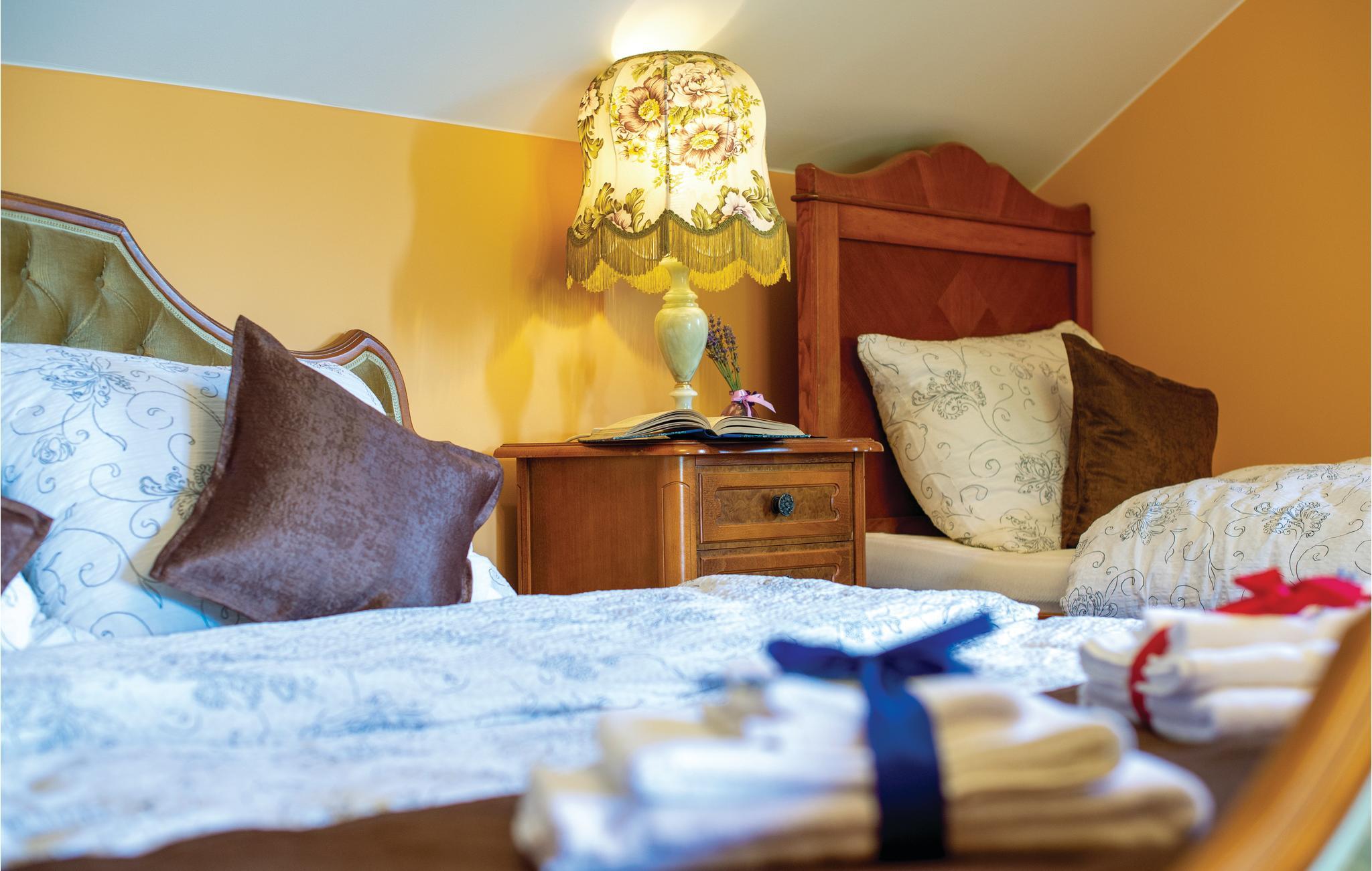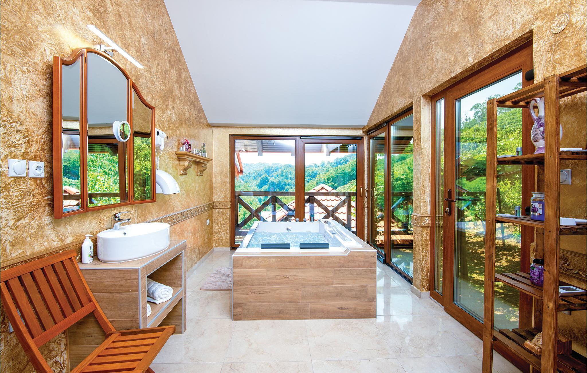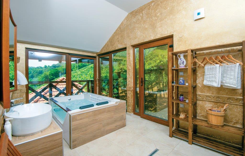 Dette traditionelt møblerede feriehus ligger på en bakke omgivet af vinmarker, frugtplantager og skove. Hele huset er indrettet med stor opmærksomhed for lækre detaljer. Placeringen er perfekt til naturelskere og aktive feriegæster. I stueetagen er der et spisekøkken med opholdsstue, mens øverste etage har boblebad, sauna og to soveværelser. Slap af i jeres eget spa-område med udsigt over de smukke omgivelser og det bølgende landskab. I gården er der en grillterrasse med behagelige havemøbler. I nærheden ligger en dam, hvor der kan fiskes. Dermed er der her grundlag for en skøn, alsidig ferie.