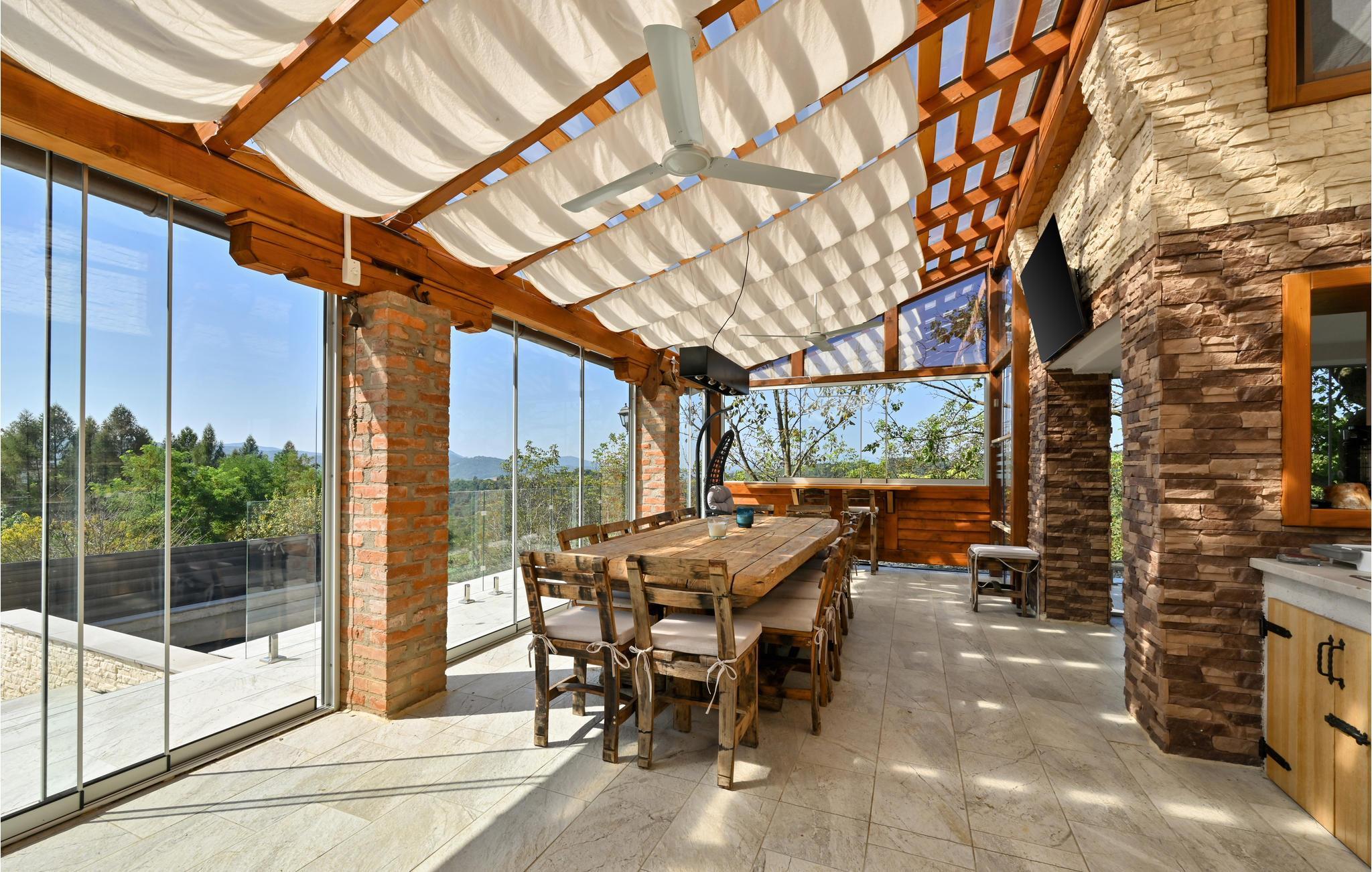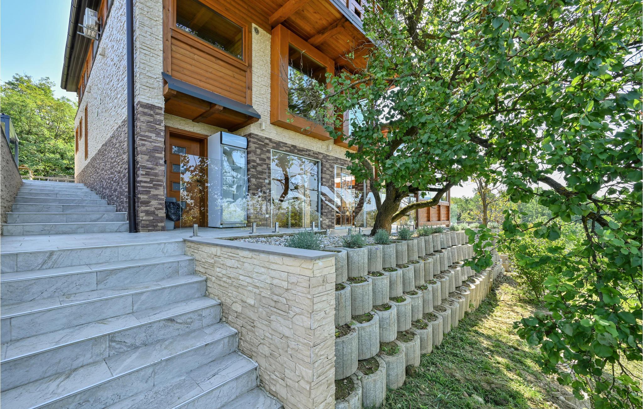 Huset her er bygget i træ og sten og ligger tæt på udstrakte skove med en vidunderlig udsigt. Det er et oplagt feriested for en familie eller en gruppe venner, husdyr er også velkomne. Huset er stort og fremstår flot og stilfuldt. Oplev øjeblikke af afslapning i den udendørs pool eller spa med udsigt over de smukke, bakkede landskaber. I saunaen venter mange stunder med fordybelse og ro. Den åbne terrasse er et skønt sted at læse, solbade og spise i det fri - udsigten alene er en sikker kilde til ny energi.
