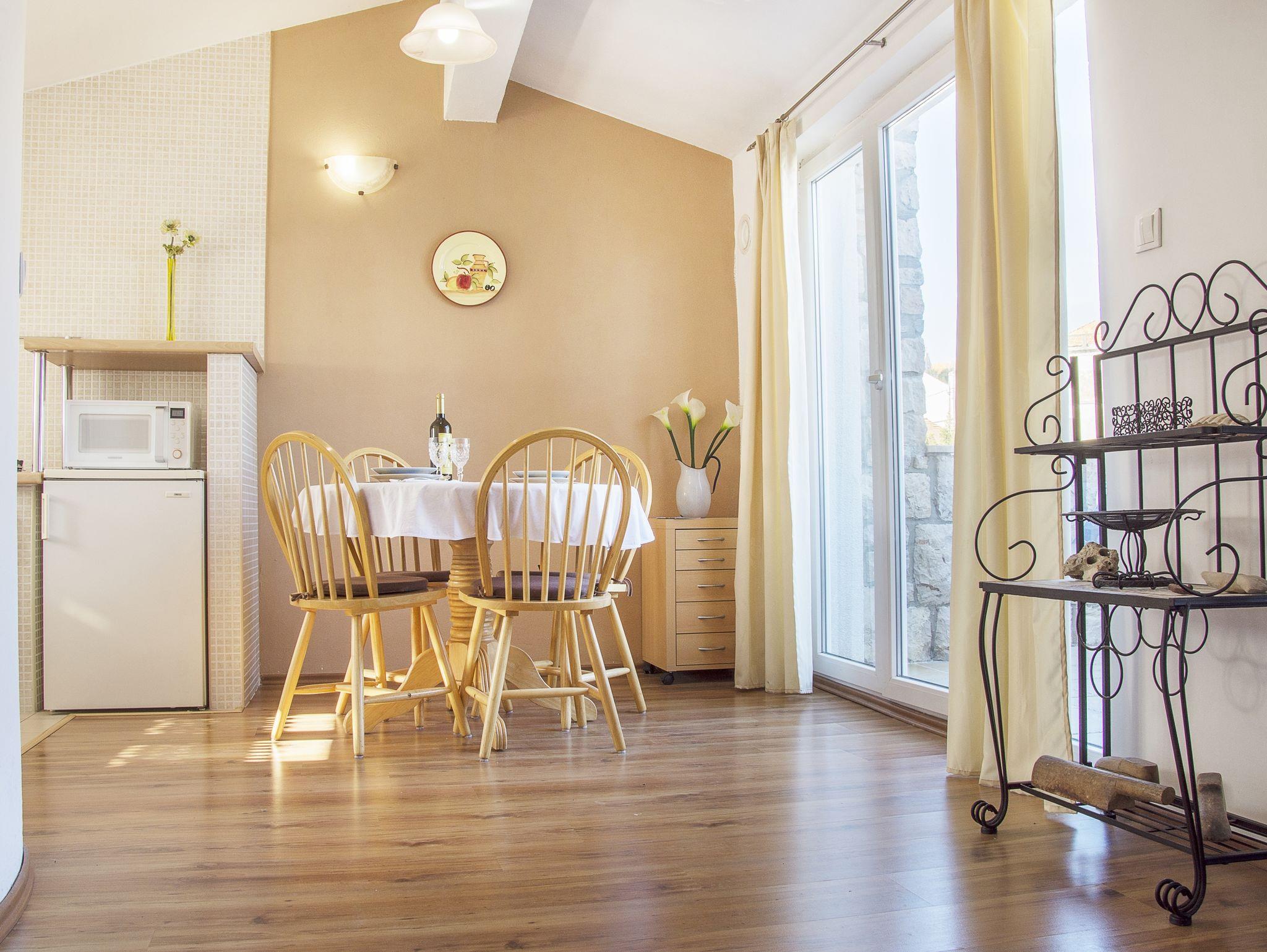Ferienwohnung bietet Platz für 3 Gäste. Die Betten sind in Schlafzimmern, die es 1 gibt, und in Wohnzimmer, innerhalb einer Gesamtfläche von 40m2, angeordnet. Die Gäste haben eine eigene Terrasse zur Verfügung, auf der sie in warmen Sommernächten genießen können. Das Apartment bietet Meerblick. Für vollen Genuss und Entspannung gibt es einen privaten Grill für Gäste dieser Unterkunft. In der Unterkunftseinheit besteht die Möglichkeit des Mitbringens von Haustieren gegen Aufpreis. IM PREIS INBEGRIFFEN: Kurtaxe, Endreinigung, Klimatisierung, Parkplatz, Internet, Bootsanlegeplatz, Kinderbett, Zusatzbett, Bügeleisen, Bügelbrett, Föhn, Sonnenschirm. VERBINDLICHE ZUSÄTZLICHE KOSTEN: Aufzahlung für Kurzaufenthalte (prozentualer Zuschlag pro Nächtigungsanzahl: 30% - 1, 20% - 2, 10% - 3). UNVERBINDLICHE ZUSÄTZLICHE KOSTEN: Haustiere (5,00 € pro Nacht). Die Verfügbarkeit zusätzlicher Dienstleistungen in Ihrem reservierten Termin und die Preise derselben (falls nicht aufgeführt) müssen im Voraus überprüft werden. Zusätzliche Dienstleistungen die in der Zahlungsaufforderung nicht aufgeführt sind werden direkt beim Vermieter bezahlt, angenommen der Gast nutzt auch diese.