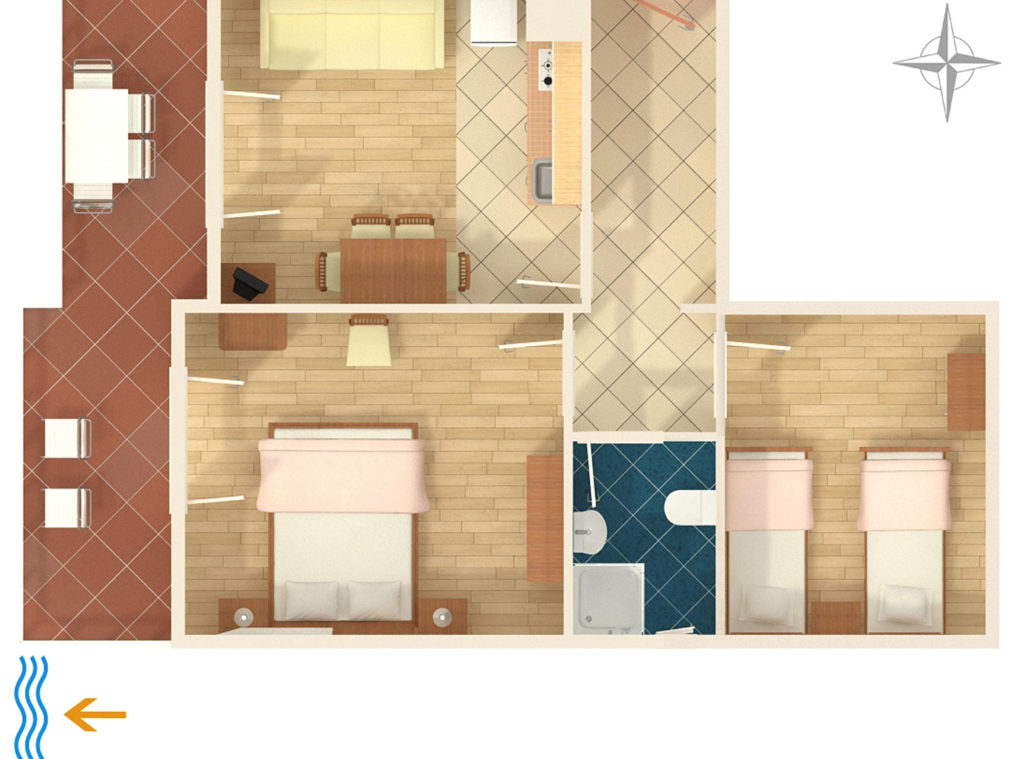 Ferienwohnung bietet Platz für 6 Gäste. Die Betten sind in Schlafzimmern, die es 2 gibt, und in Wohnzimmer, innerhalb einer Gesamtfläche von 49m2, angeordnet. Die Gäste haben eine eigene Terrasse zur Verfügung, auf der sie in warmen Sommernächten genießen können. Das Apartment bietet Meerblick. Es ist erlaubt, Speisen auf dem Gemeinschafts-Grill vorzubereiten. IM PREIS INBEGRIFFEN: Kurtaxe, Endreinigung, Klimatisierung, Parkplatz, Internet, Bootsanlegeplatz, Bügeleisen, Bügelbrett, Föhn. VERBINDLICHE ZUSÄTZLICHE KOSTEN: Aufzahlung für Kurzaufenthalte (prozentualer Zuschlag pro Nächtigungsanzahl: 30% - 1, 20% - 2, 10% - 3). UNVERBINDLICHE ZUSÄTZLICHE KOSTEN: Boot (50,00 € pro Nacht). Die Verfügbarkeit zusätzlicher Dienstleistungen in Ihrem reservierten Termin und die Preise derselben (falls nicht aufgeführt) müssen im Voraus überprüft werden. Zusätzliche Dienstleistungen die in der Zahlungsaufforderung nicht aufgeführt sind werden direkt beim Vermieter bezahlt, angenommen der Gast nutzt auch diese. Ermäßigung auf den Grundpreis: Gratistag 14=13 (bei einem Aufenthalt von 14 Tagen oder mehr erhalten Sie einen Gratistag für den Aufenthalt bis 31.12.26).