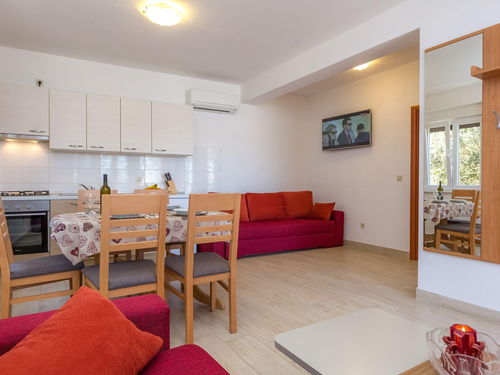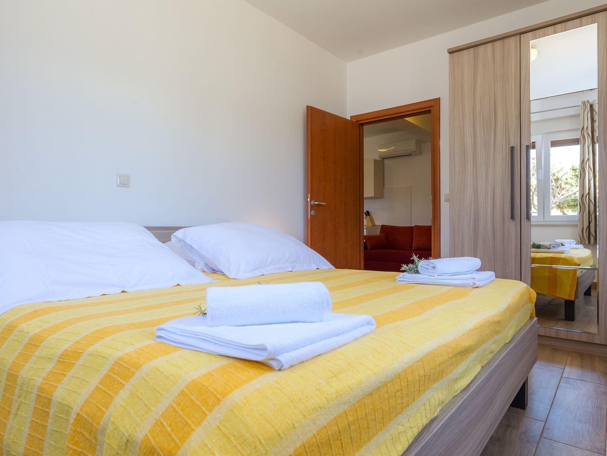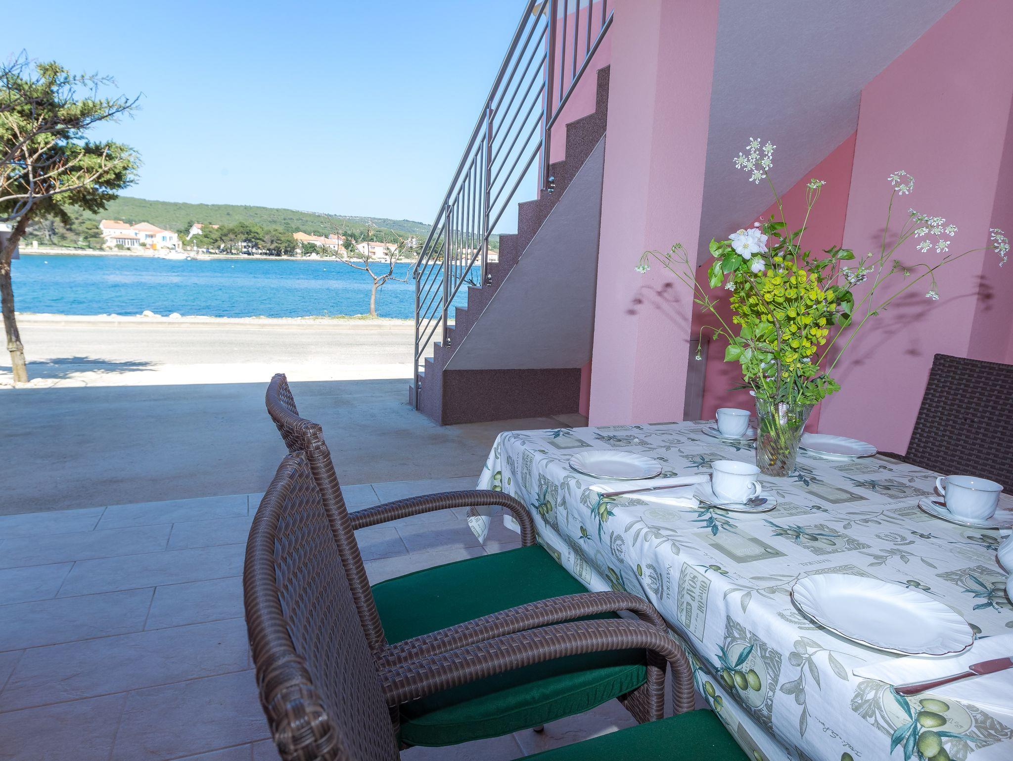 Ferienwohnung bietet Platz für 5 Gäste. Die Betten sind in Schlafzimmern, die es 1 gibt, und in Esszimmer, innerhalb einer Gesamtfläche von 40m2, angeordnet. Die Gäste haben eine eigene Terrasse zur Verfügung, auf der sie in warmen Sommernächten genießen können. Das Apartment bietet Meerblick. Es ist erlaubt, Speisen auf dem Gemeinschafts-Grill vorzubereiten. IM PREIS INBEGRIFFEN: Kurtaxe, Endreinigung, Klimatisierung, Parkplatz, Internet, Wäschewaschen, Bootsanlegeplatz. Die Verfügbarkeit zusätzlicher Dienstleistungen in Ihrem reservierten Termin und die Preise derselben (falls nicht aufgeführt) müssen im Voraus überprüft werden. Zusätzliche Dienstleistungen die in der Zahlungsaufforderung nicht aufgeführt sind werden direkt beim Vermieter bezahlt, angenommen der Gast nutzt auch diese.