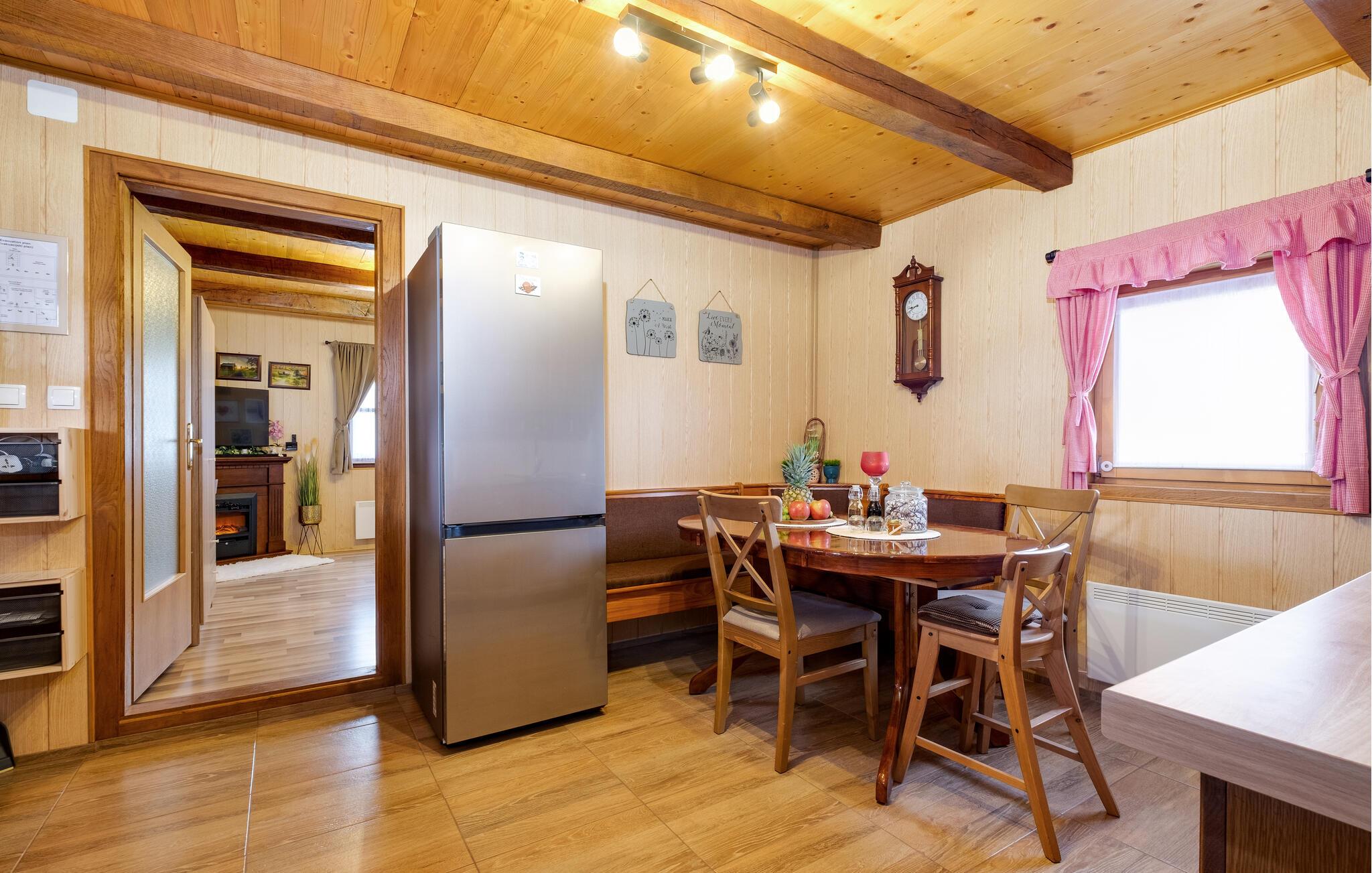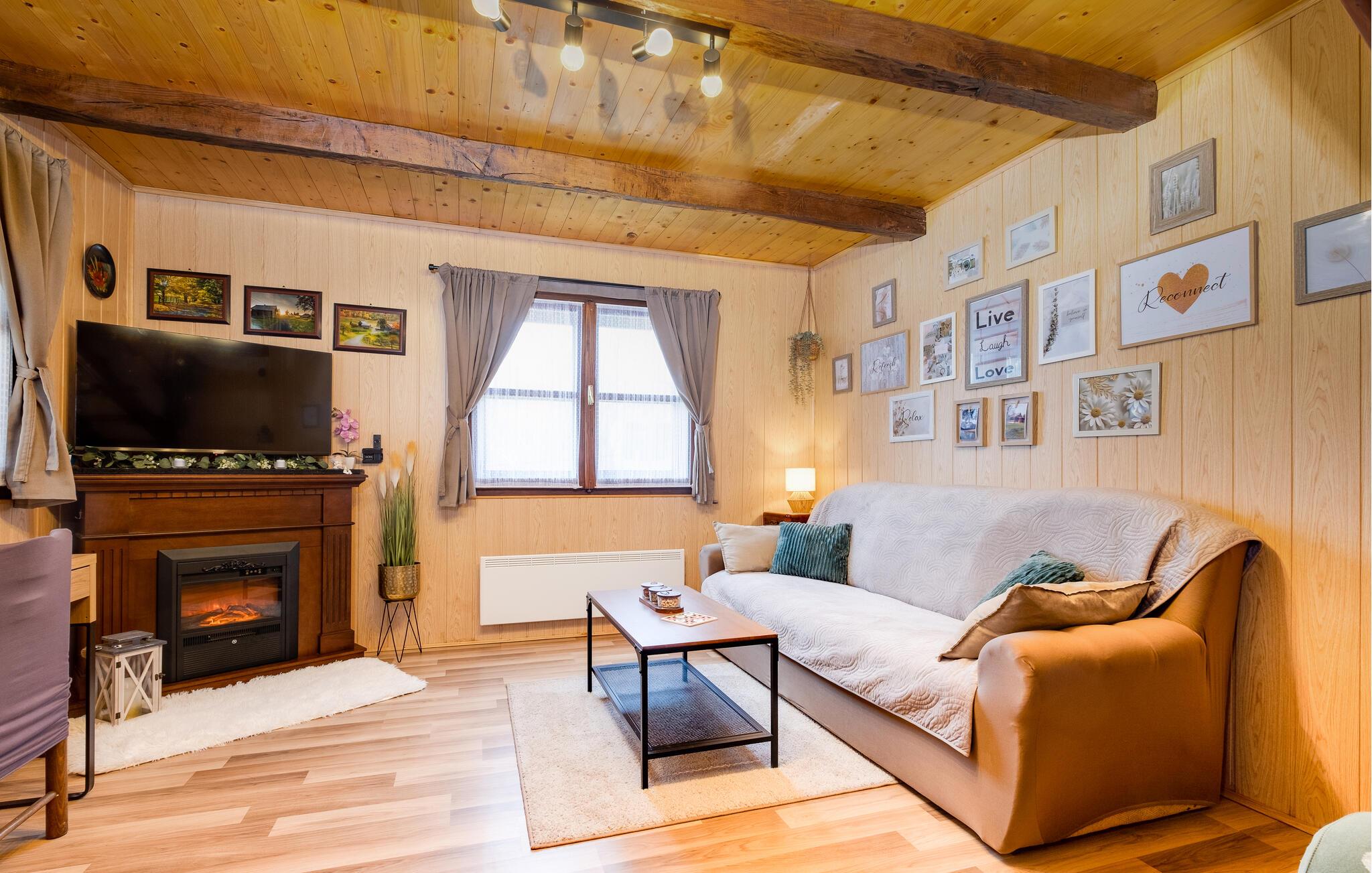 Velkommen til dette hyggelige og familievenlige feriehus omgivet af idyllisk natur. Nyd en aften foran den knitrende pejs i den smukt dekorerede stue, slap af i saunaen, eller hyg jer med en filmaften på den komfortable sofa. Det fuldt udstyrede køkken giver jer mulighed for at tilberede kulinariske højdepunkter sammen og nyde dem ved det rustikke spisebord.