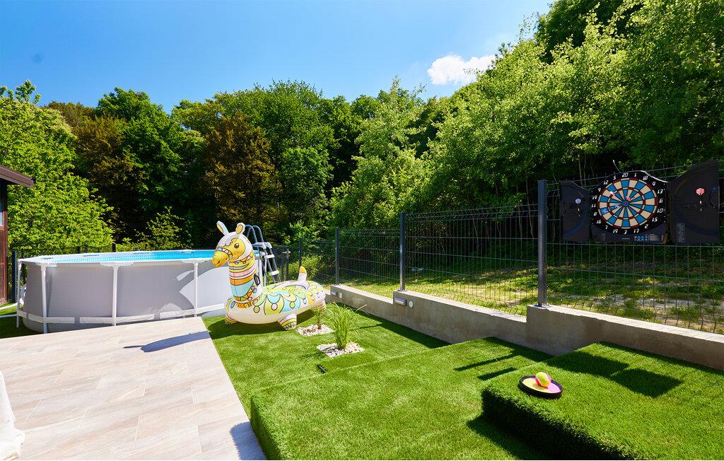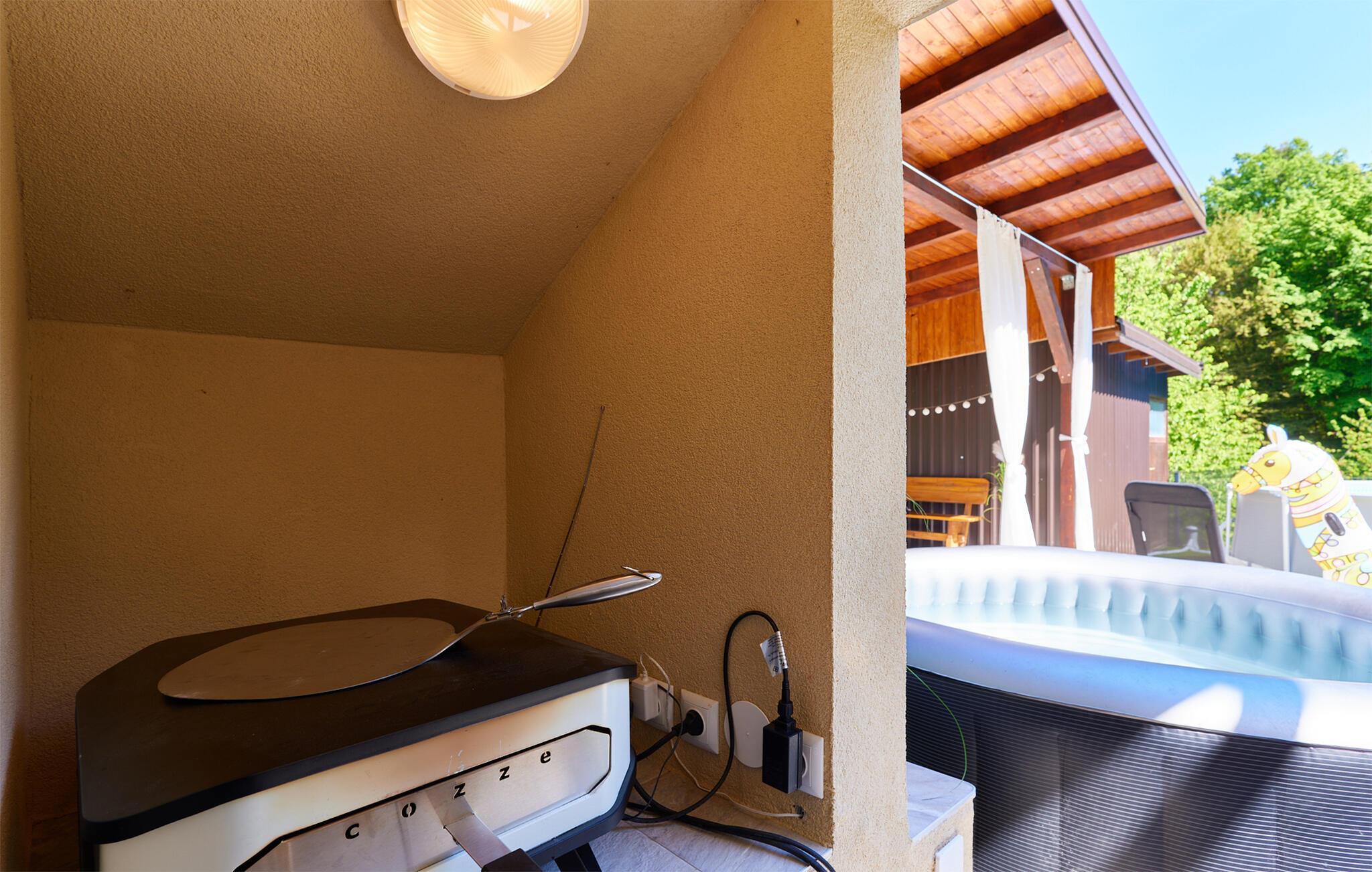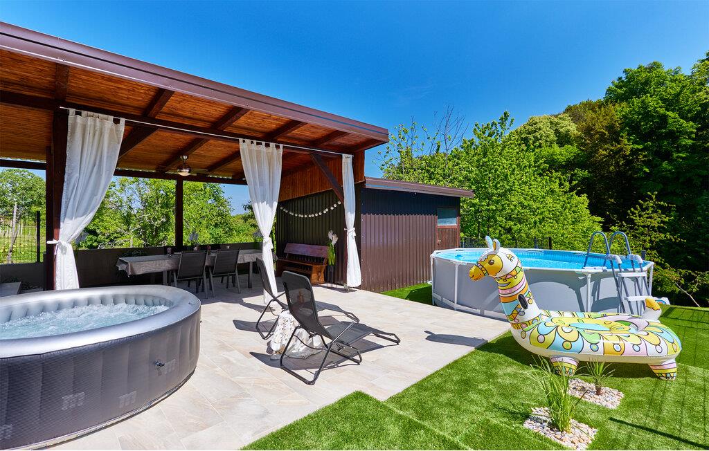 I kan også nyde tiden udenfor, da to terrasser indbyder til hyggelige middage og forfriskninger i løbet af dagen. Mens jeres børn leger i haven, kan I slappe af i spabadet og nyde omgivelserne med frugttræer og uberørt natur.