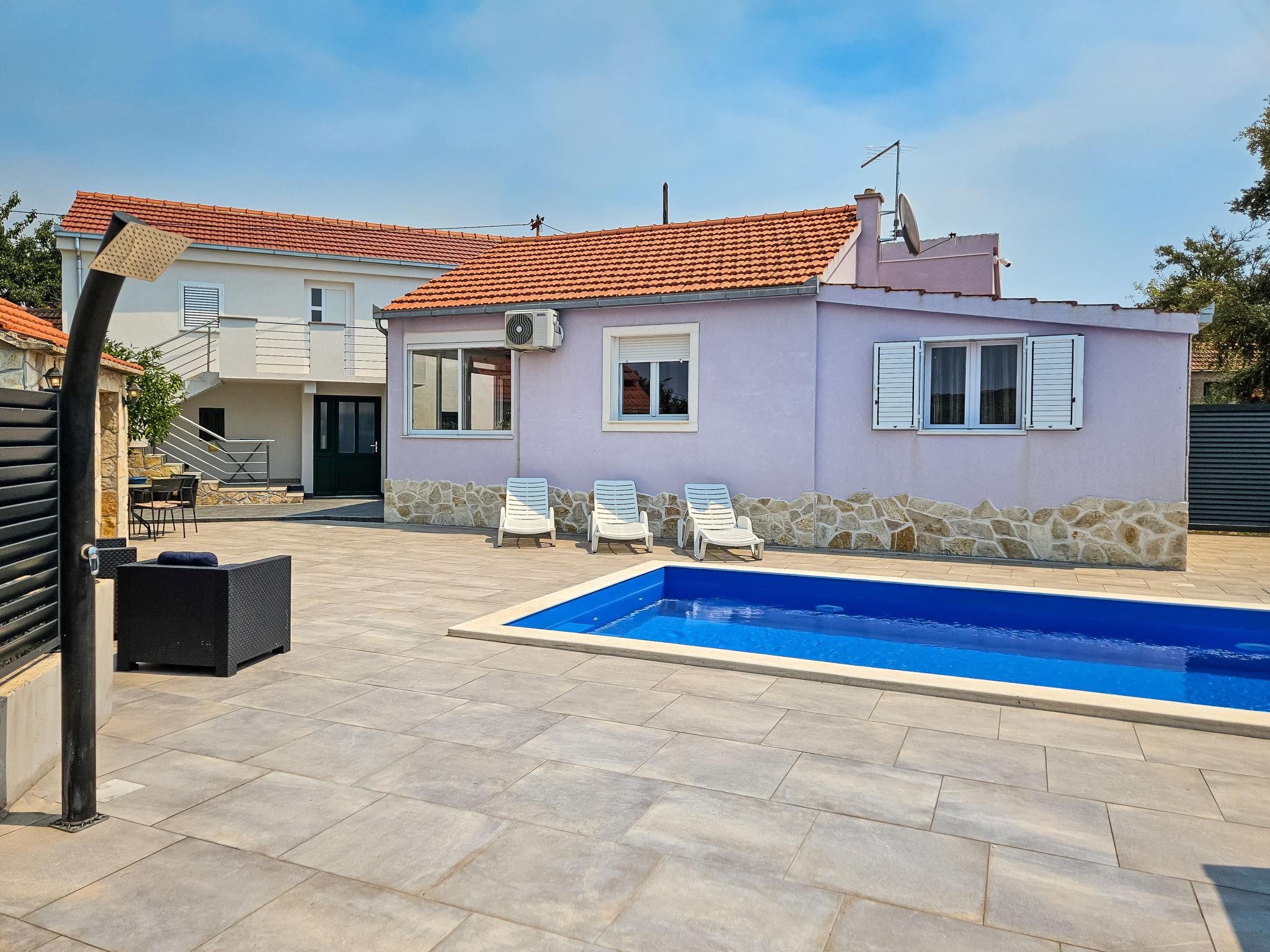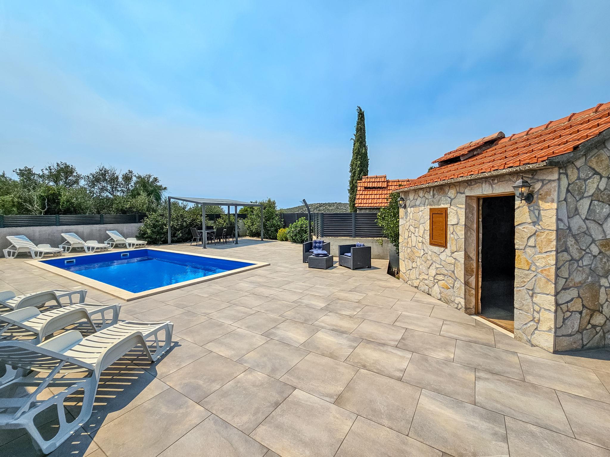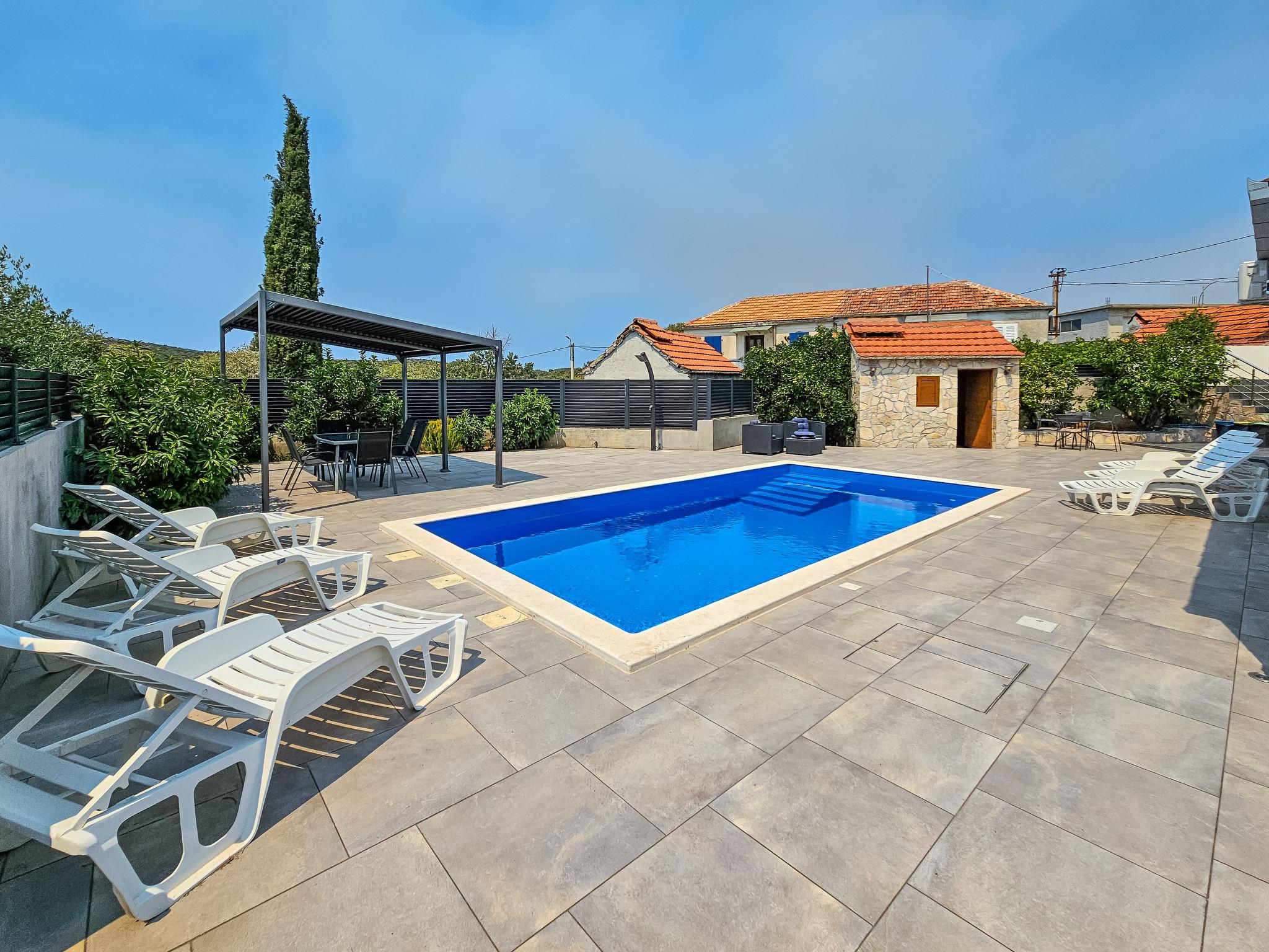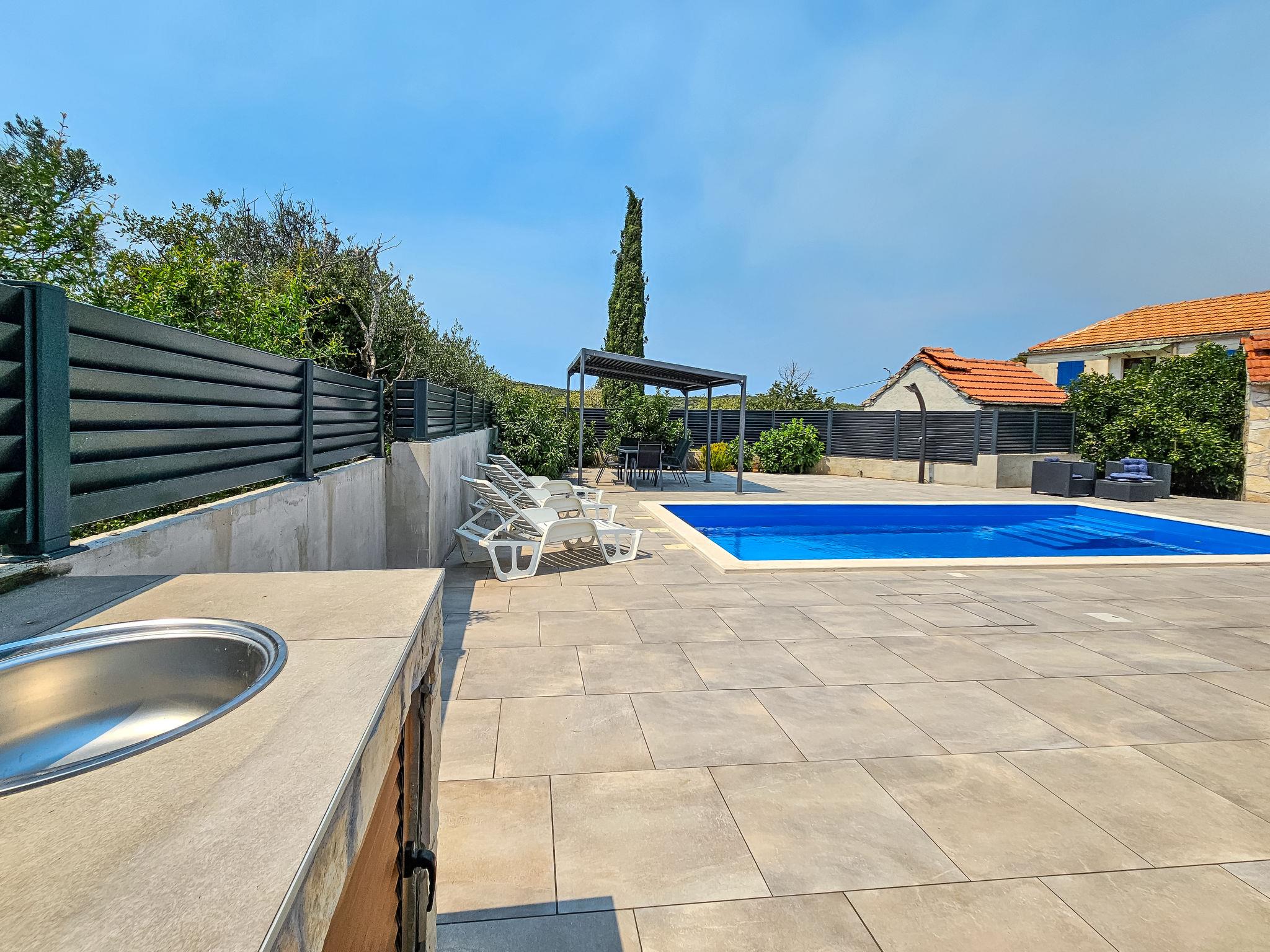 House "Nancy". 2 km from the centre of Vinišce, in a quiet, sunny position, 2 km from the sea, 2 km from the beach. Private: property 300 m2 (fenced), swimming pool angular (32 m2, seasonal availability: 01.May. - 01.Nov.) with internal staircase. Outdoor shower, terrace (50 m2), garden furniture, barbecue house, pool maintenance by the owner/gardener. In the house: internet access, trampoline, washing machine. 25 m long narrow motor access to the house. Parking at the house on the premises. Grocery 2 km, supermarket 4.2 km, restaurant 2.2 km, bus stop "Milasi 2" 130 m, pebble beach 2 km. The owner does not accept any youth groups. Please note: airfield 23 km from the property.