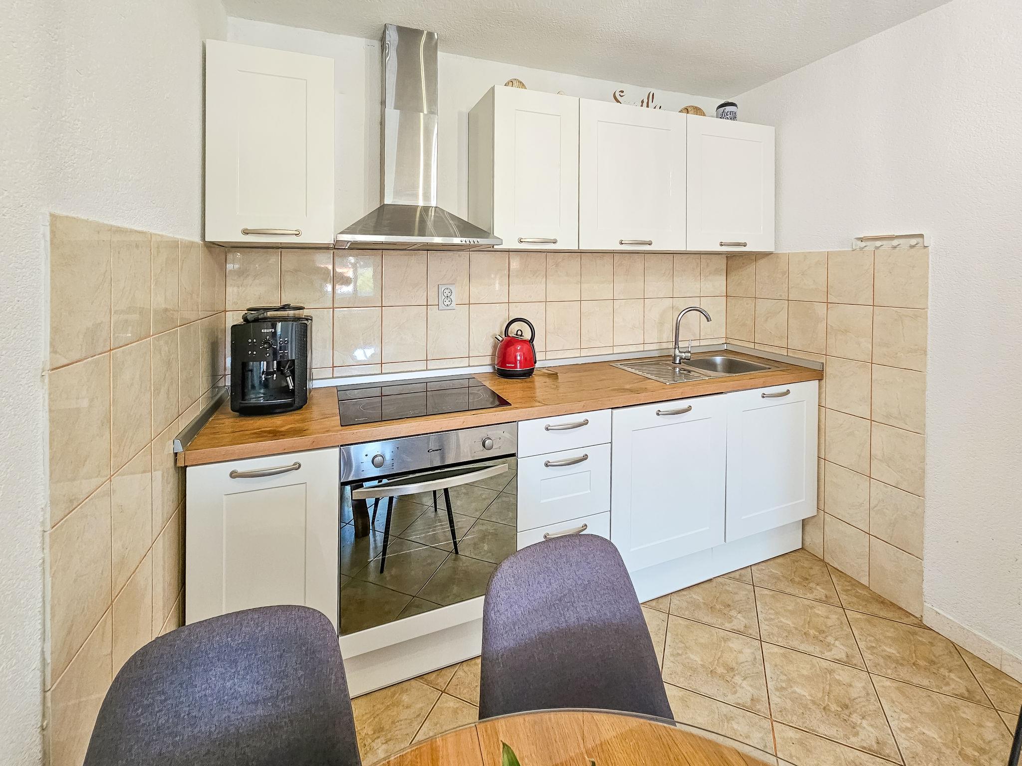 3-room house 58 m2. Living/dining room with satellite TV and air conditioning. 2 rooms, each room with 1 french bed (160 cm, length 200 cm). Open kitchen (oven, dishwasher, 4 ceramic glass hob hotplates, toaster, kettle, microwave, freezer, electric coffee machine) with dining table. Shower/WC, sep. WC. Deck chairs (6). Beautiful panoramic view of the countryside. Facilities: safe, iron, hair dryer. Internet (WiFi). Please note: non-smoking house.