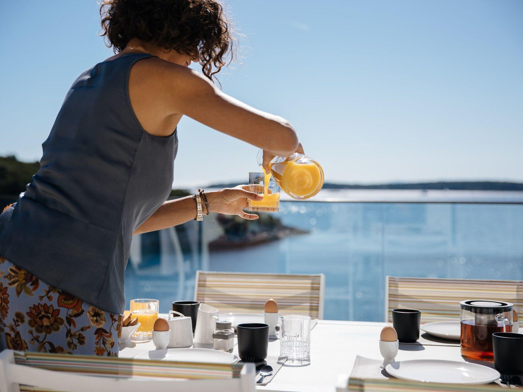 On the terrace, raised tiles provide non-slip safety, especially for children when walking. A heated L-shaped pool invites you to enjoy a pleasant swim even in the low season. Comfortably designed pool loungers and matching lounge furniture invite you to chill out and sunbathe. An outdoor shower by the pool and a built-in barbecue with equipment mean you can sit happily in the shady corner of the terrace and enjoy the fantastic view in the evening.