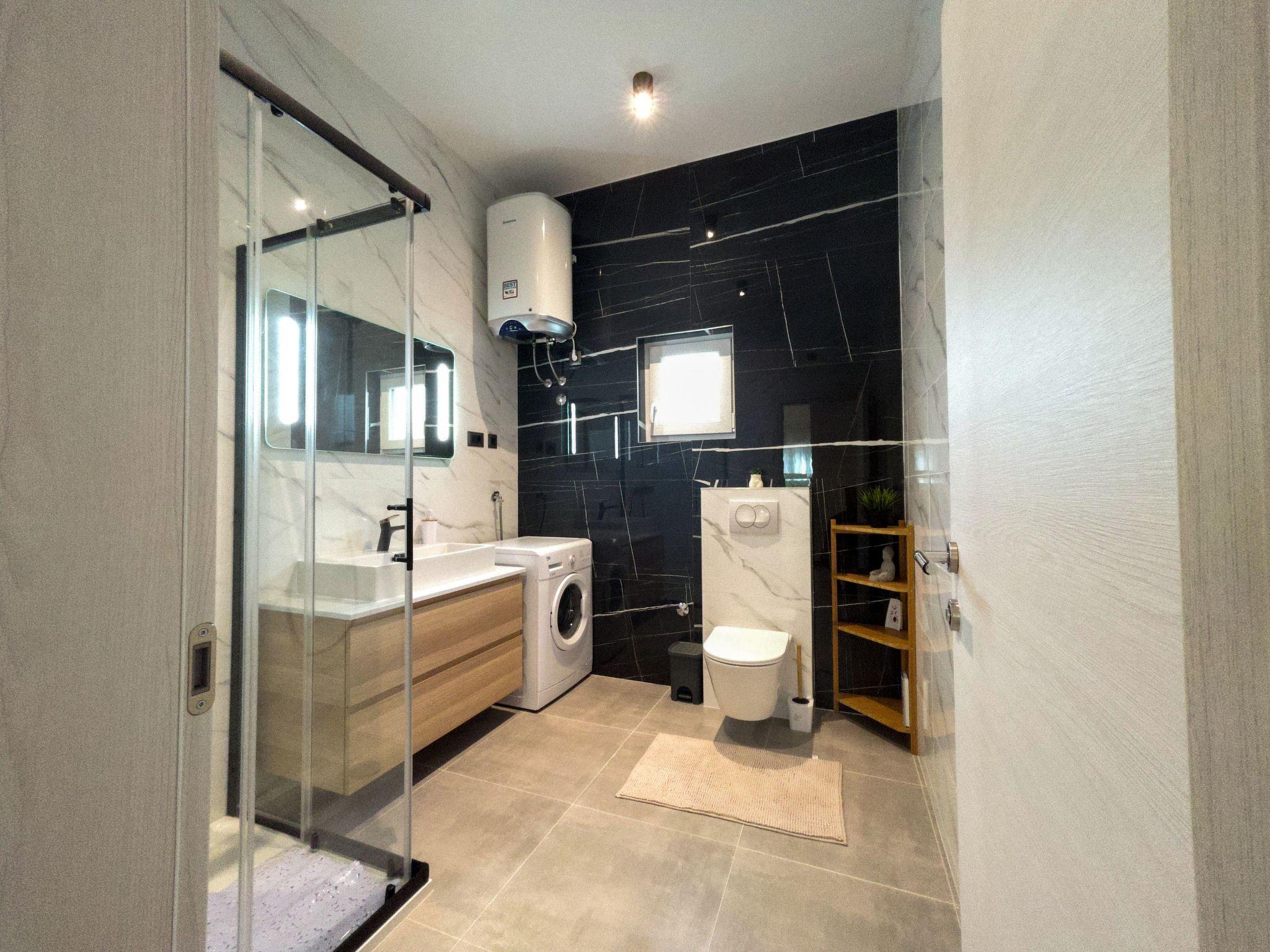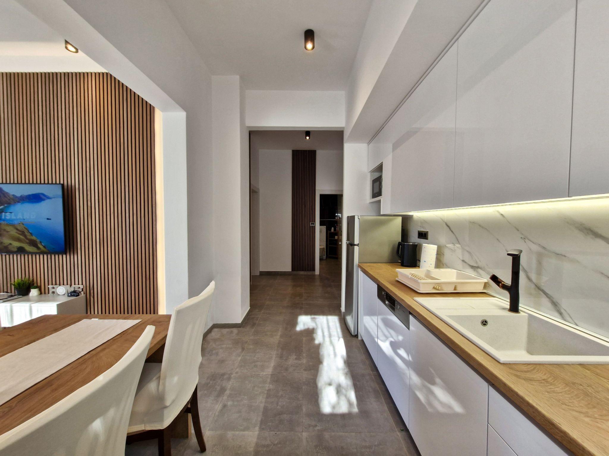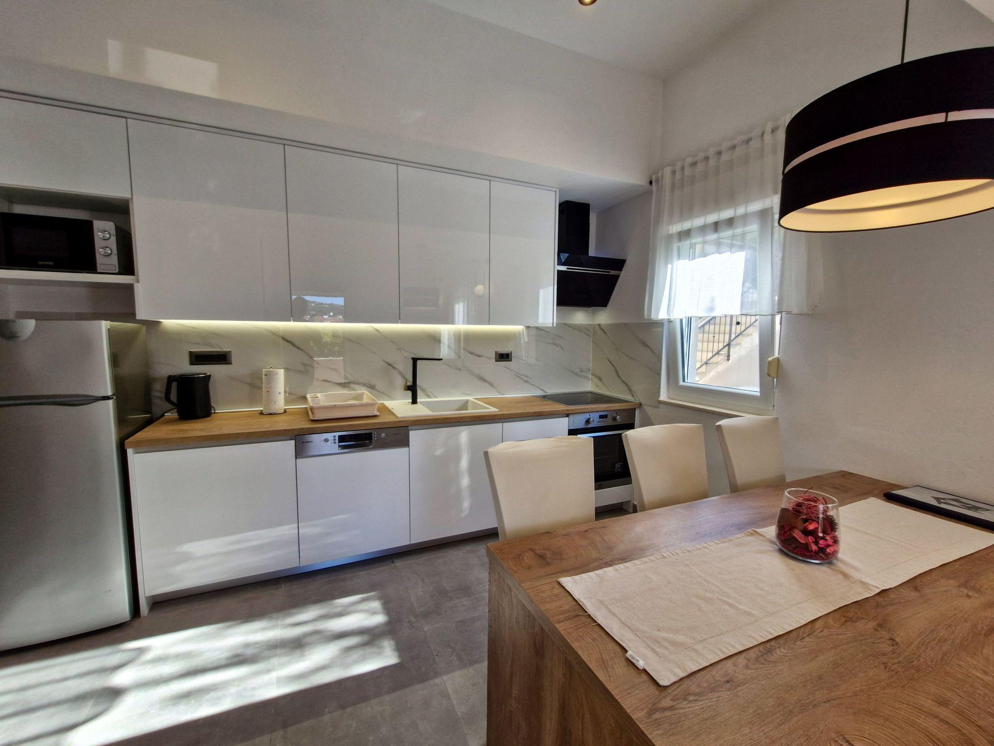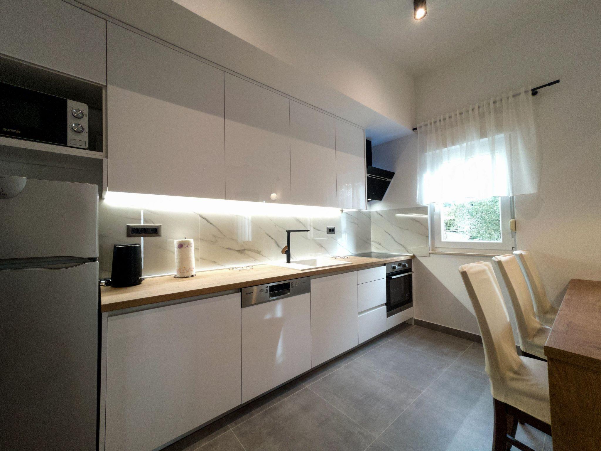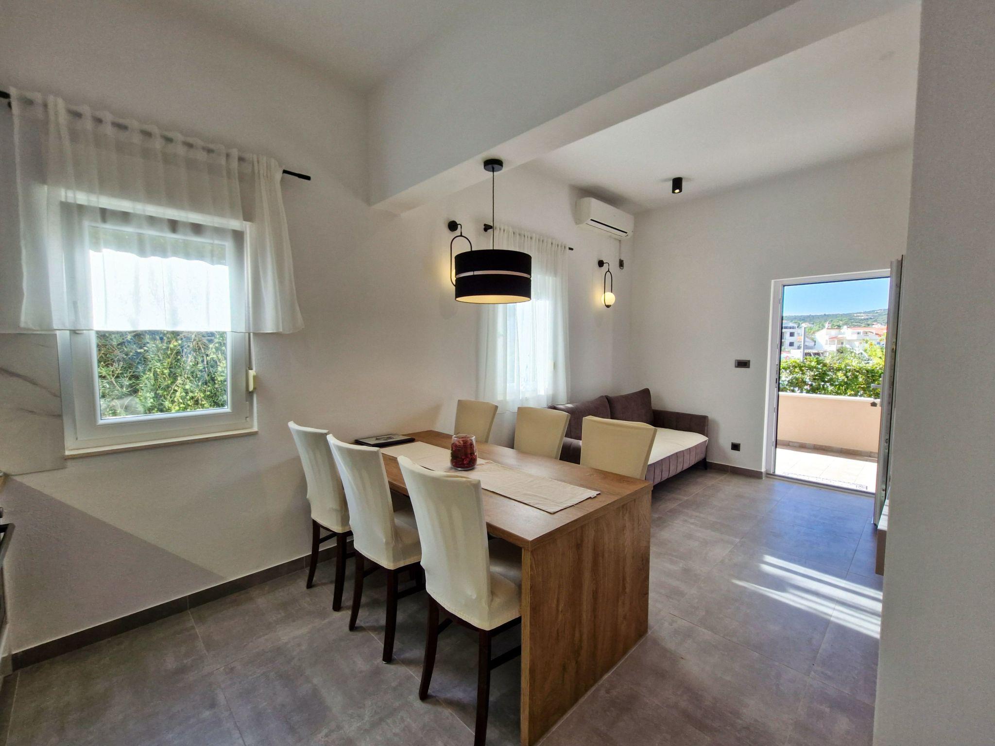 The modern renovate holiday apartment for 2024. season is on the ground floor and provides 85m² of living space with 20 m2 of terrace for up to six people. It has three bedrooms with a king size bed and two bathrooms. All bedrooms and living room have air contioner. The open kitchen is fully-equipped with a hob, oven, microwave, fridge with freezer compartment and dishwasher. It also has a big dining table with chairs. The living room has a flatscreen TV with satellite channels where you can enjoy your movies from comfortable sofa.