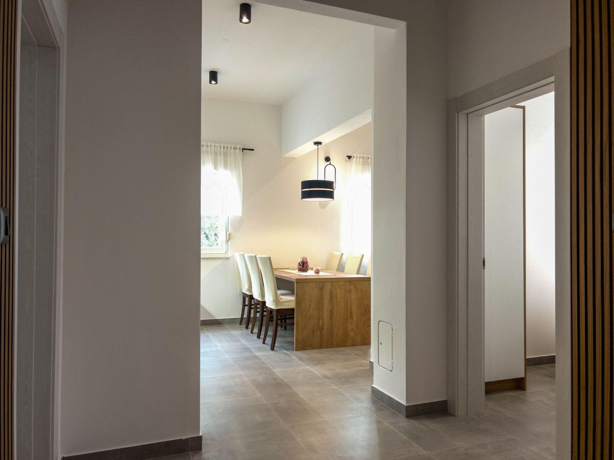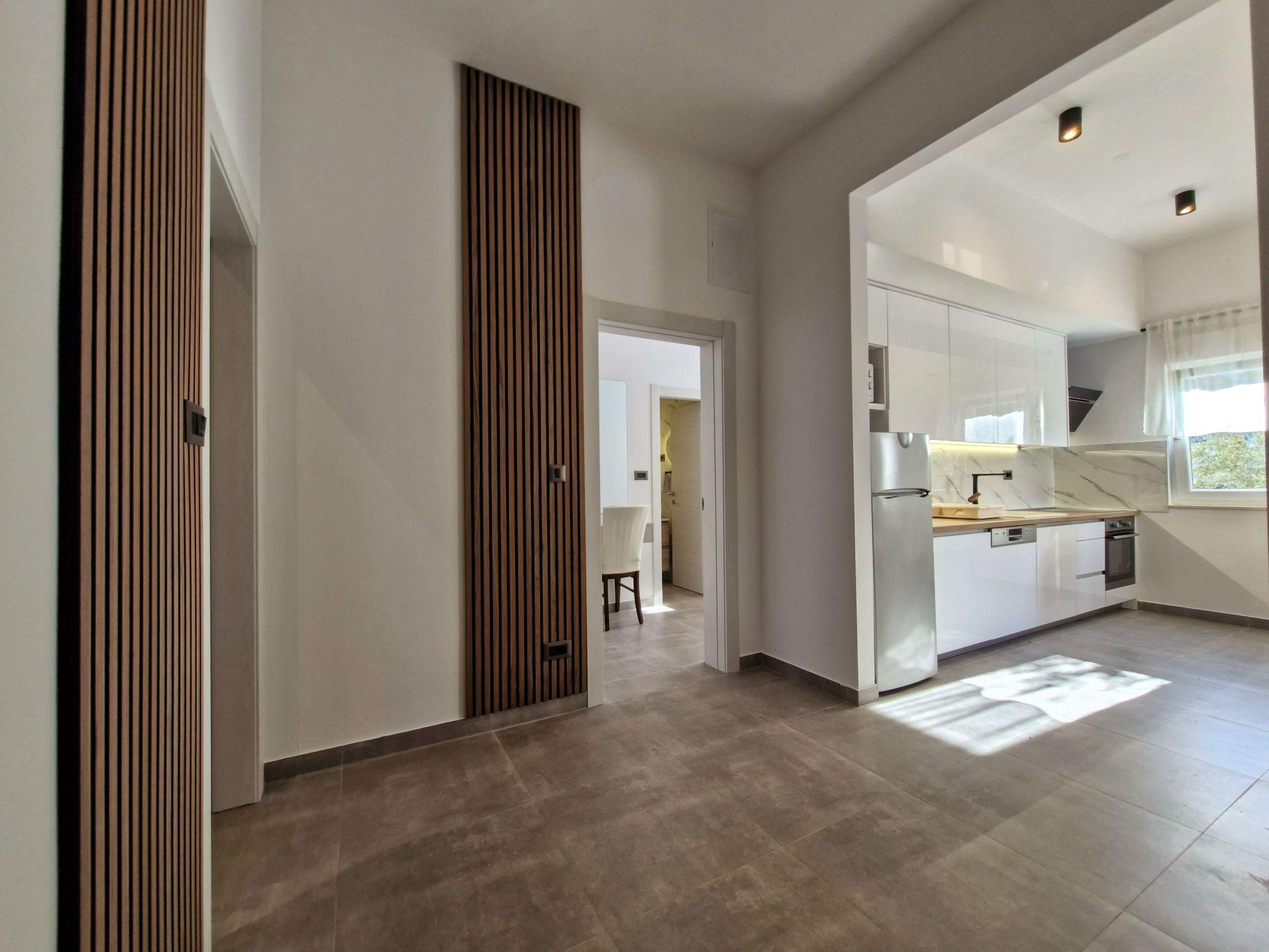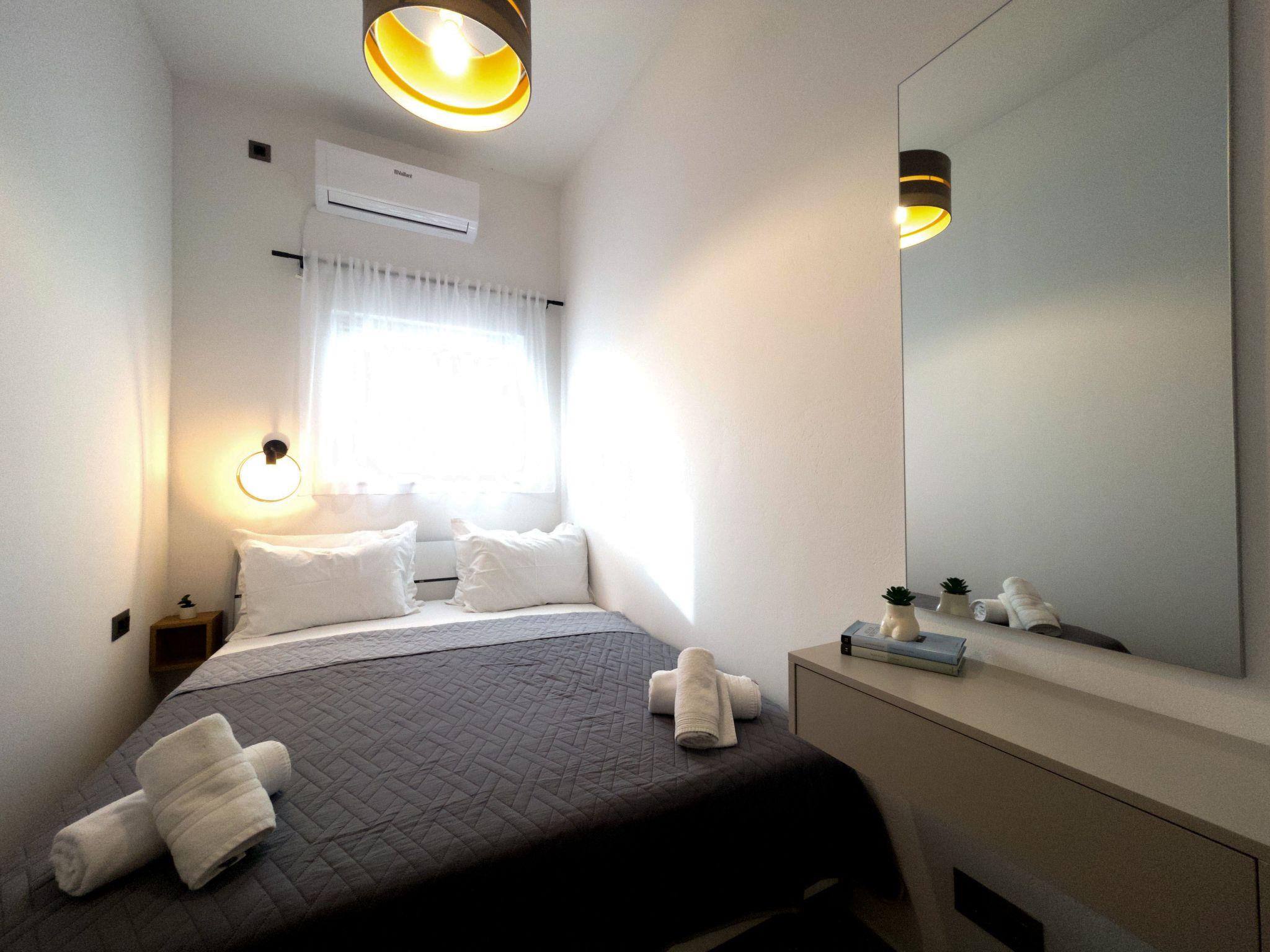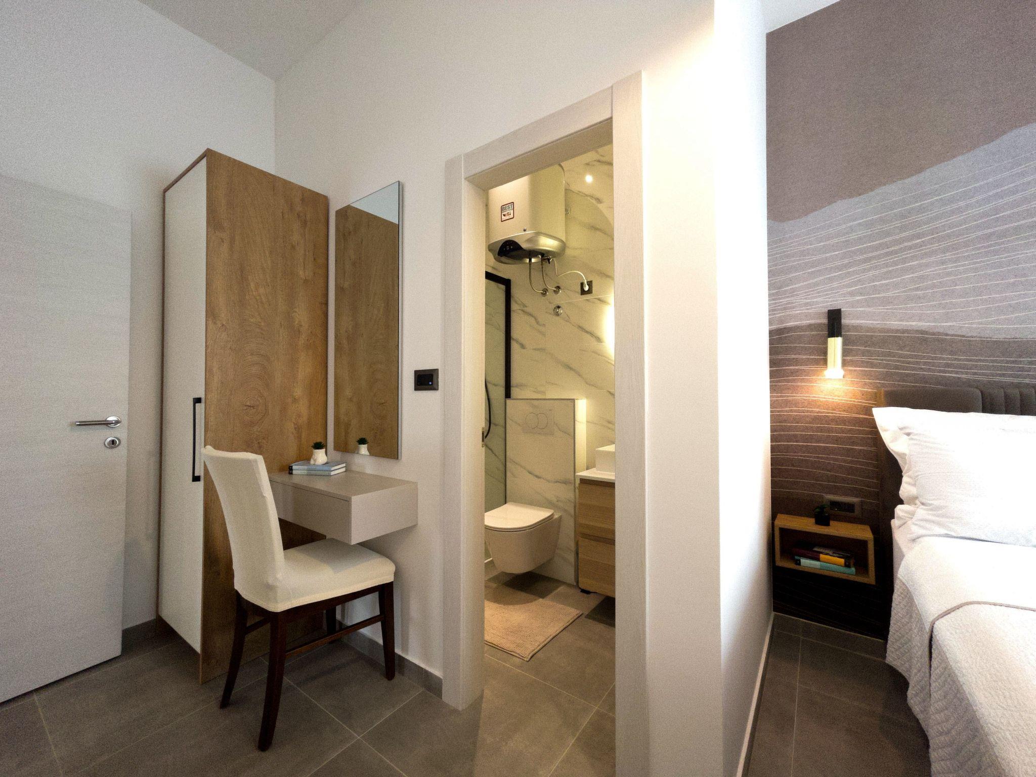 The modern renovate holiday apartment for 2024. season is on the ground floor and provides 85m² of living space with 20 m2 of terrace for up to six people. It has three bedrooms with a king size bed and two bathrooms. All bedrooms and living room have air contioner. The open kitchen is fully-equipped with a hob, oven, microwave, fridge with freezer compartment and dishwasher. It also has a big dining table with chairs. The living room has a flatscreen TV with satellite channels where you can enjoy your movies from comfortable sofa.