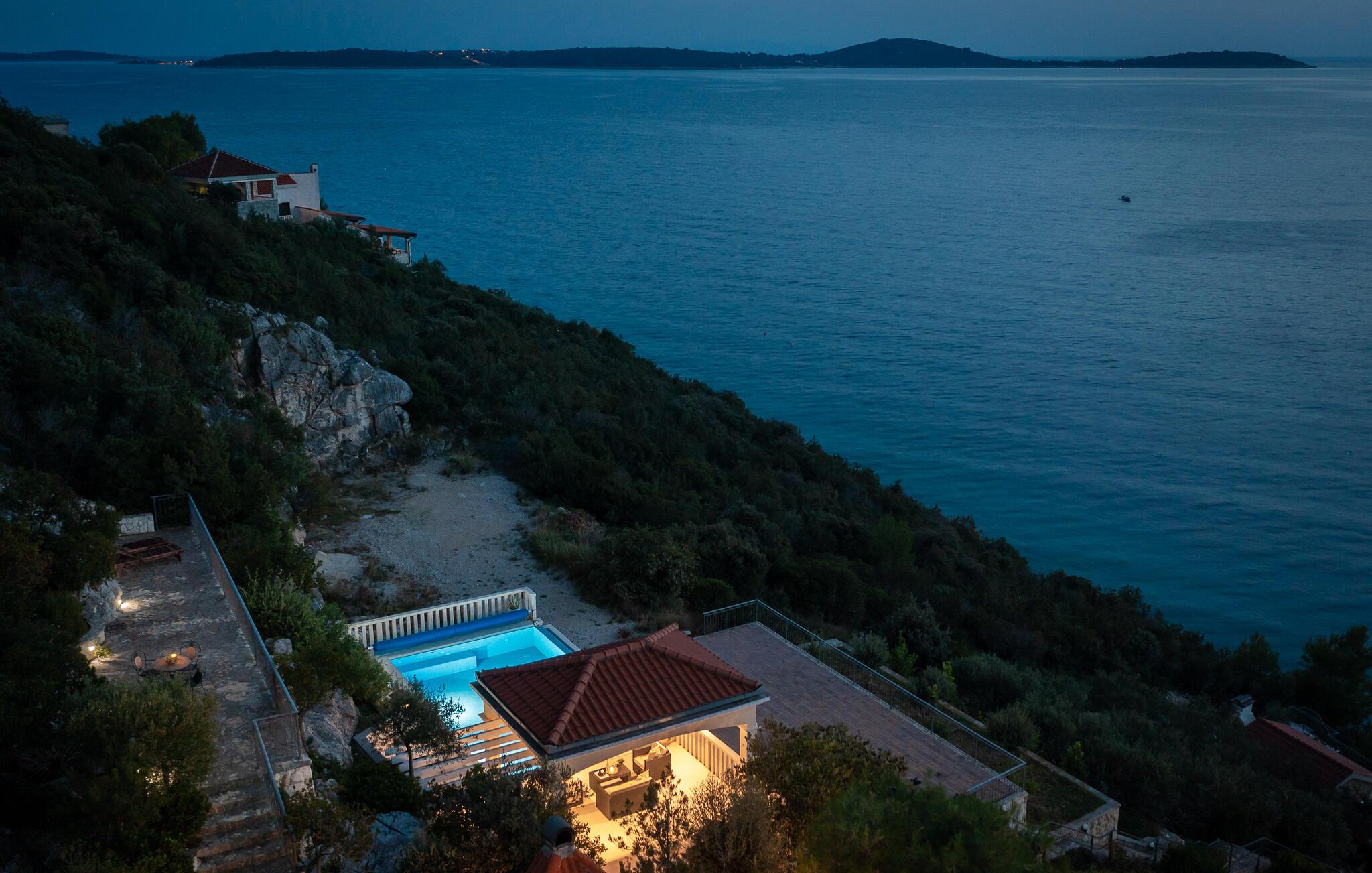 Drømmer I om en fantastisk ferie med masser af komfort? Så er denne vidunderlige og godt indrettede villa lige noget for jer! Her vil I med garanti få opfyldt alle jeres ønsker til en god ferie. Villaen ligger nær en dejlig sandstrand og har panoramaudsigt ud over det azurblå, krystalklare Adriaterhav. Den lille lejlighed i stueetagen råder over et soveværelse, et badeværelse og et lille køkken og er forbundet med førsteetagen af en udendørs trappe. Her finder I en stor, overdækket altan, en opholdsstue med tilgrænsende spisestue, yderligere to soveværelser og husets andet badeværelse. På de varme dage kan I snuppe en forfriskende dukkert i den herlige udendørs swimmingpool, eller I kan ligge og slappe af i en af liggestolene, mens I læser en god bog. På grillen kan I tilberede lokale specialiteter, mens I nyder et dejligt glas vin og den smukke solnedgang.