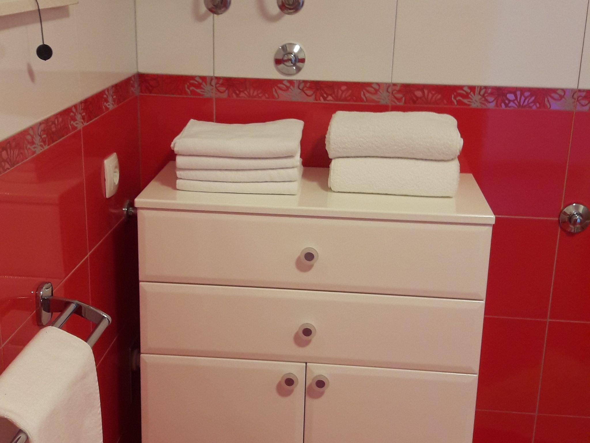 Ferienwohnung bietet Platz für 5 Gäste. Die Betten sind in Schlafzimmern, die es 2 gibt, und in Wohnzimmer, innerhalb einer Gesamtfläche von 66m2, angeordnet. Die Gäste haben eine eigene Terrasse zur Verfügung, auf der sie in warmen Sommernächten genießen können. Es ist erlaubt, Speisen auf dem Gemeinschafts-Grill vorzubereiten. IM PREIS INBEGRIFFEN: Kurtaxe, Endreinigung, Klimatisierung, Parkplatz, Internet, Kinderbett, Bügeleisen, Bügelbrett. VERBINDLICHE ZUSÄTZLICHE KOSTEN: Aufzahlung für Kurzaufenthalte (prozentualer Zuschlag pro Nächtigungsanzahl: 30% - 1, 20% - 2, 10% - 3). Die Verfügbarkeit zusätzlicher Dienstleistungen in Ihrem reservierten Termin und die Preise derselben (falls nicht aufgeführt) müssen im Voraus überprüft werden. Zusätzliche Dienstleistungen die in der Zahlungsaufforderung nicht aufgeführt sind werden direkt beim Vermieter bezahlt, angenommen der Gast nutzt auch diese.