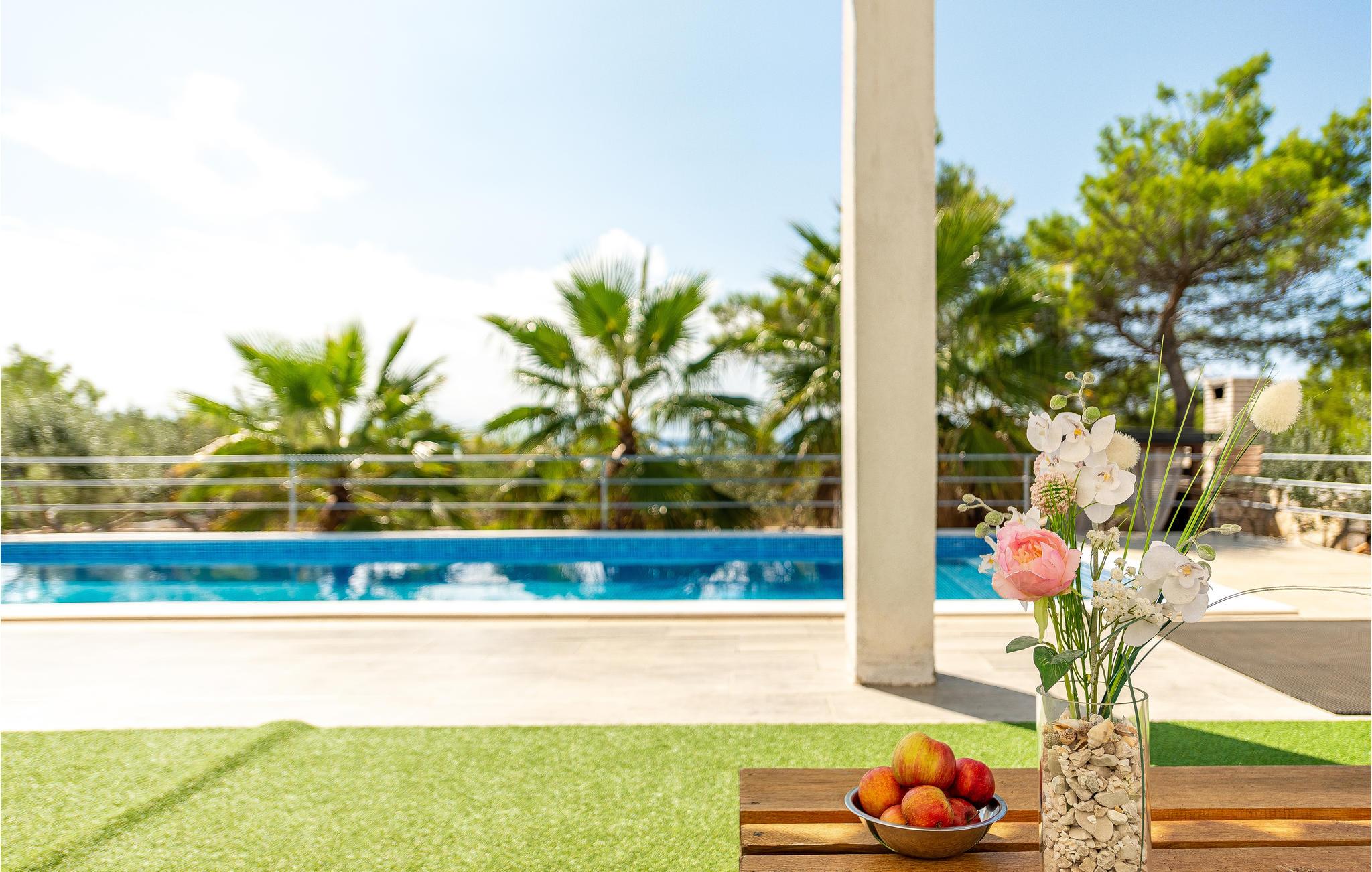 Denne fine lejlighed er den perfekte base til en skøn sol- og badeferie. Start dagen med at spise morgenmad på terrassen, hvorefter I kan vælge at tilbringe et par timer ved den dejlige fællespool eller pakke strandtasken og spadsere 400 meter til den nærmeste grusstrand, hvor der venter krystalklart badevand. I denne lejlighed er der også gode underholdningsmuligheder i form af bordforbold og bordtennis. Om aftenen kan I tage ud og spise på restaurant eller blive hjemme og selv tilberede et lækkert feriemåltid på fællesgrillen.