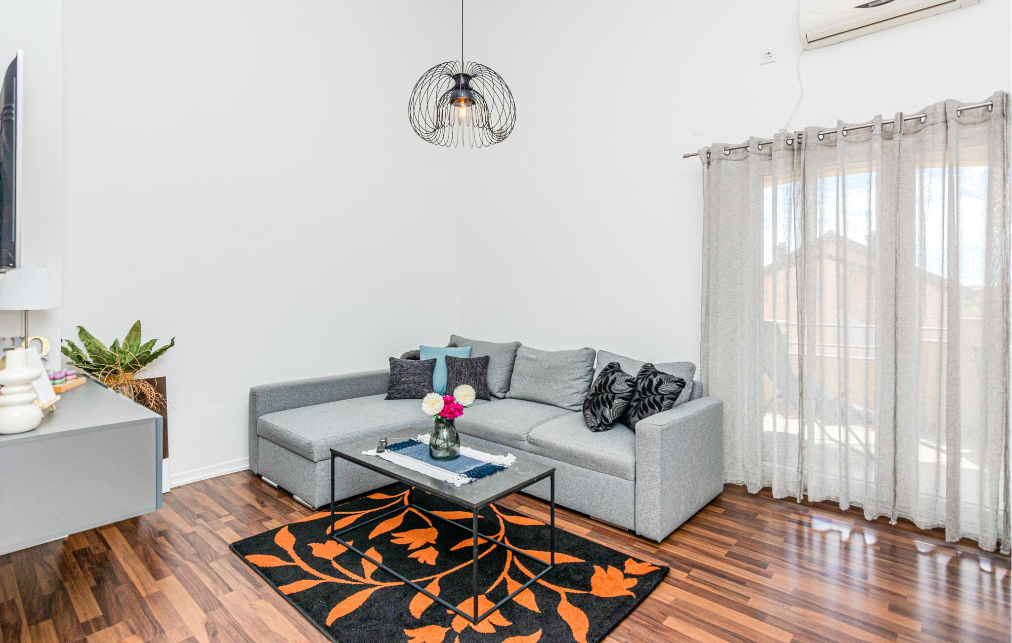 Velkommen til denne indbydende lejlighed, hvor I som familie får en herlig base til årets ø-ferie. Indretningen prydes af højt til loftet, flotte gulve og et komfortabelt møblement, der gør det nemt at sænke skuldrene og hvile benene efter en aktiv feriedag. Lad en begivenhedsrig dag gå på hæld med lækker mad ved spisebordet og en god film i sofaen, mens I lægger planer for den kommende dag.